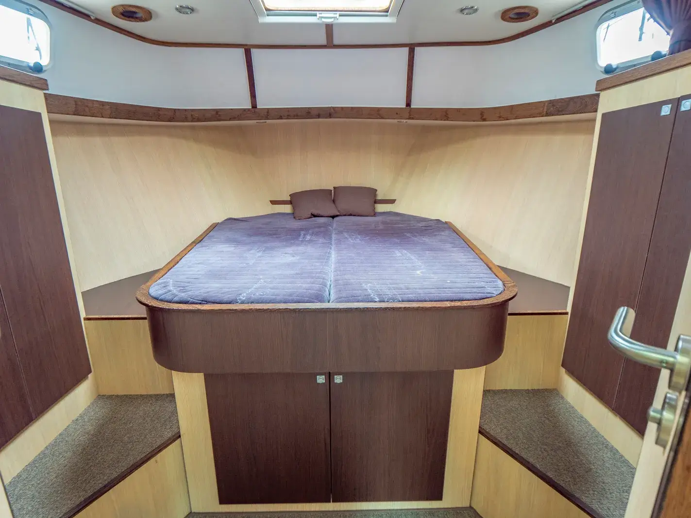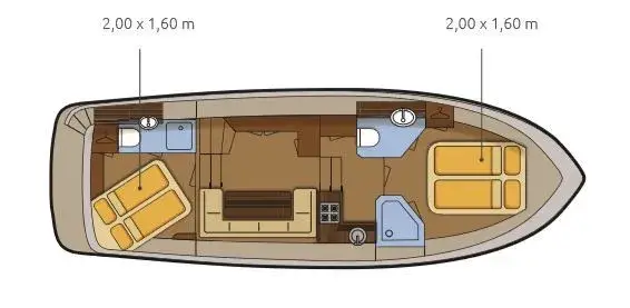 Die Aventura 38 classic bietet 4 Personen luxuriösen Komfort gepaart mit zweckmäßiger Funktionalität. Hier finden 2 Paare in gleichwertigen Kabinen mit integriertem Bad- und WC-Bereich ihre Rückzugszone. Über eine Wendeltreppe ist die Badeplattform beim Achterdeck für jedermann bequem erreichbar. Eine praktische Pantry mit Kochherd und Kühlschrank (85 l) verführt jeden Hobbykoch zu raffinierten Urlaubskreationen. Fernseher, DVD und CD-USB-Radio garantieren bei idealem Empfangsbereich hochwertigen Unterhaltungsgenuss. Im Vorschiff befinden sich eine Toilette mit Waschbecken und eine separate Dusche. Die freistehenden und beidseitig begehbaren Doppelbetten runden den Wohlfühlfaktor ab.
