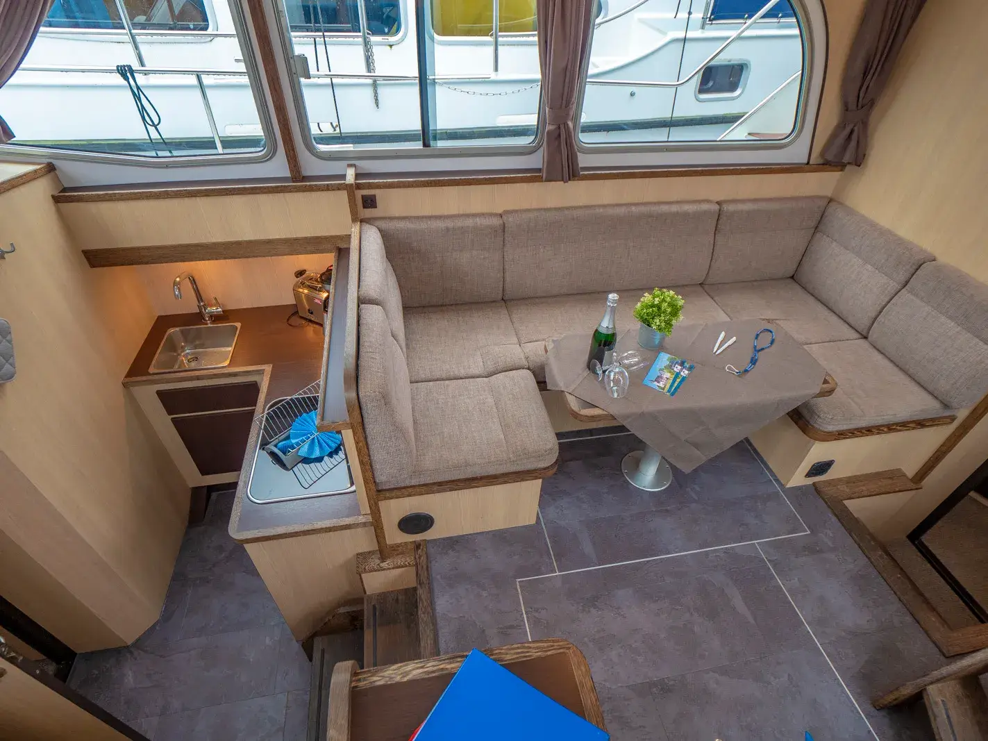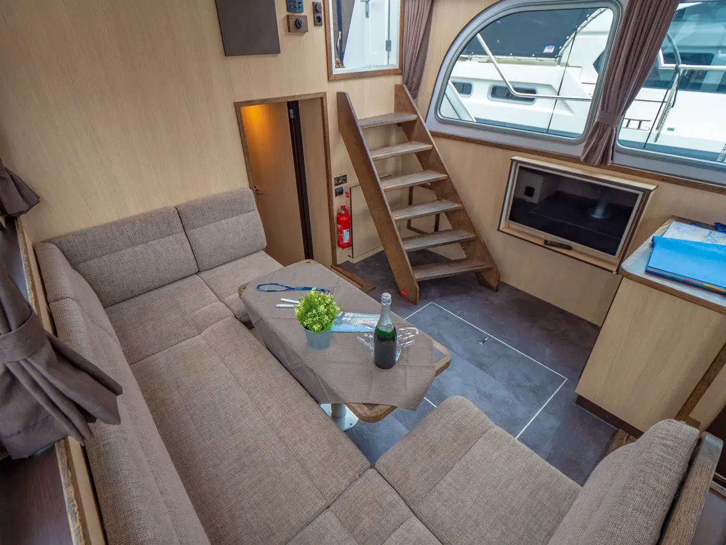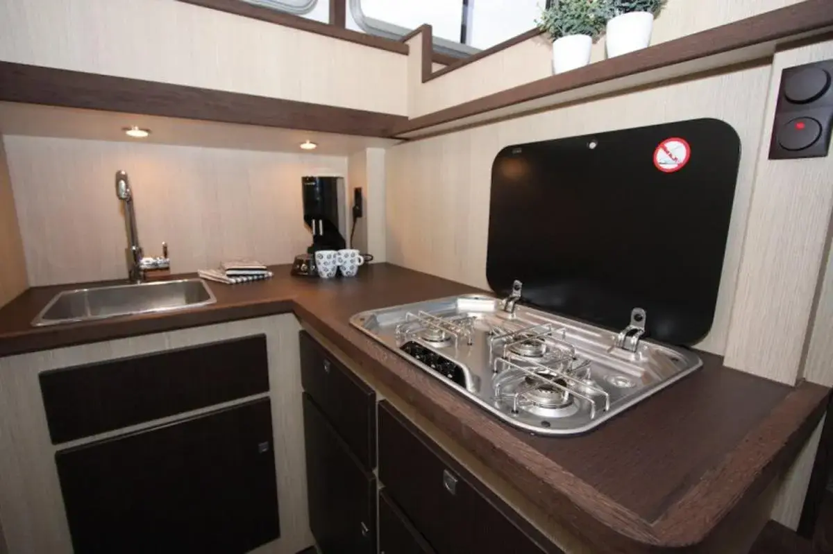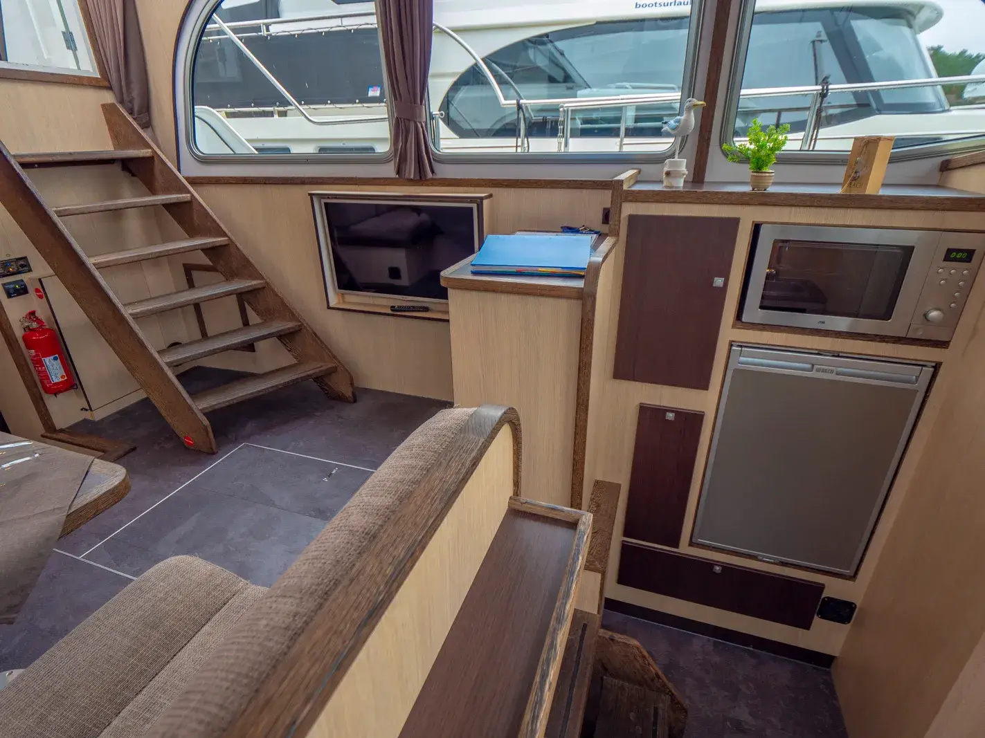 Vollständige Pantry mit mehrflammigem Kochfeld, 85 l Kühlschrank; 2 x Nasszelle mit Waschbecken, manu. WC und separater Dusche; Fernseher, SAT-Anlage, CD-Radio, Heizung, Wengeausbau; Echolot und Log mit Tochter am Steuerstand, komplett verschließbare Persenning; Bug- und Heckstrahlruder.