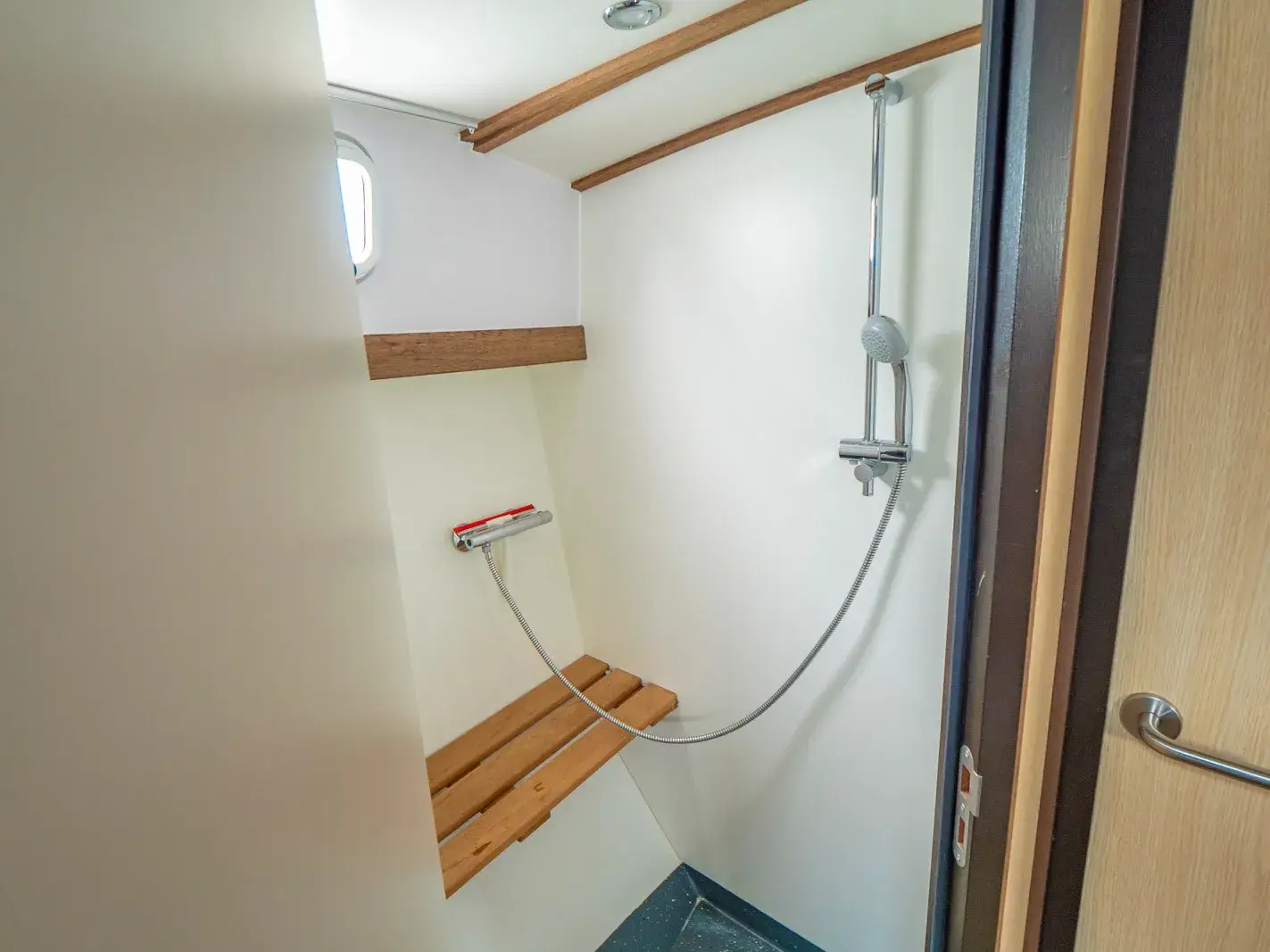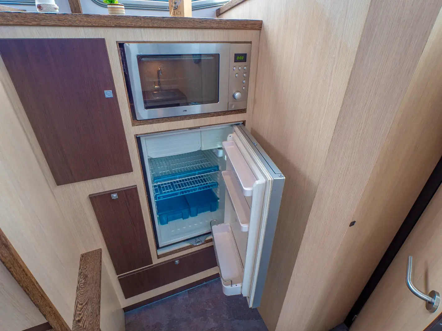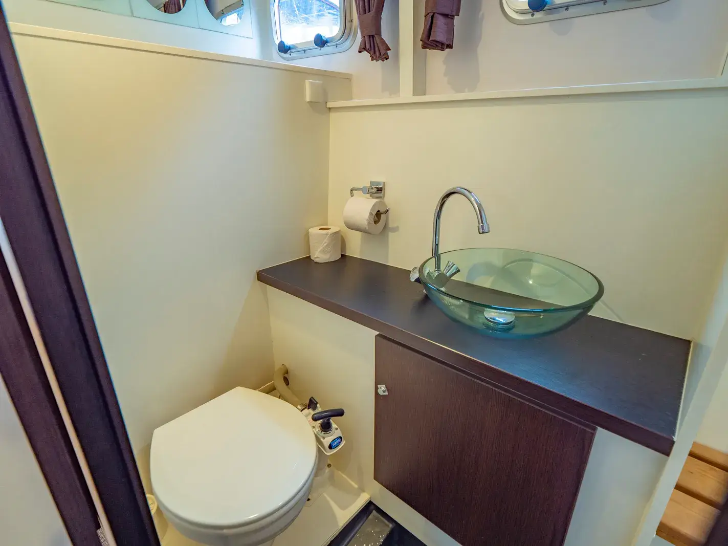 Vollständige Pantry mit mehrflammigem Kochfeld, 85 l Kühlschrank; 2 x Nasszelle mit Waschbecken, manu. WC und separater Dusche; Fernseher, SAT-Anlage, CD-Radio, Heizung, Wengeausbau; Echolot und Log mit Tochter am Steuerstand, komplett verschließbare Persenning; Bug- und Heckstrahlruder.