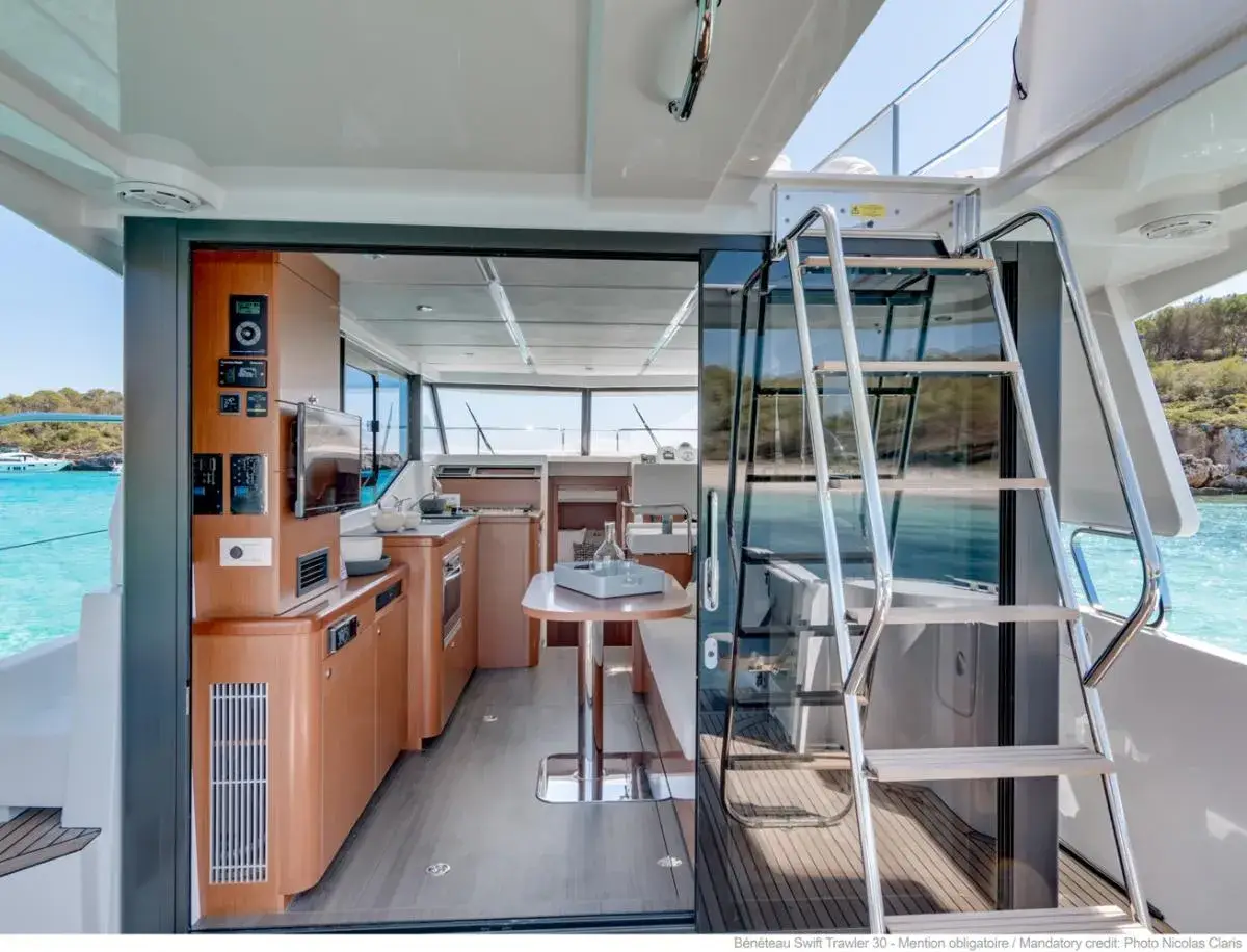 Die selbstlenzende Flybridge ist über eine Edelstahl-Zugangsleiter mit Massivholzstufen erreichbar. Sie verfügt über eine Windschutzscheibe, eine Steuerkonsole mit Armaturenbrett, Füllstandsanzeige, Ruderlagenanzeiger, Steuerkompass, hydraulische Steuerung, Nebelhorn, 12V-Steckdose, einen einstellbaren Pilotensitz mit PVC-Bezügen (Storm & Snow) sowie eine L-förmige Sitzbank mit integrierten Staufächern und einem abnehmbaren Tisch aus Massivholz.