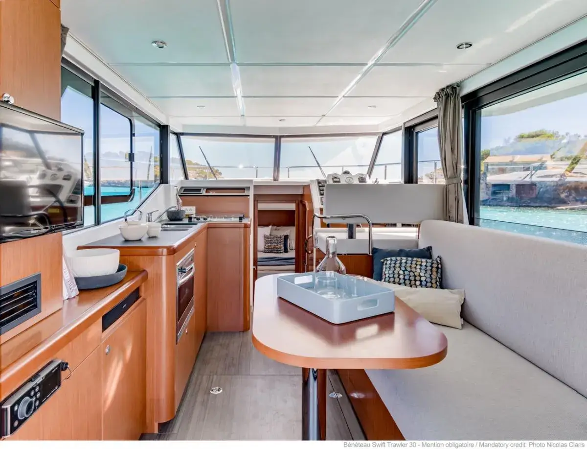 Der Salon bietet ein Sofa, das in ein Doppelbett (1,20 x 2,00 m) umgewandelt werden kann, einen höhenverstellbaren, schwenkbaren Salontisch aus lackiertem Holz, seitliche Öffnungen, Staumöbel und Staufächer sowie ein Schiebefenster hinten mit drei Elementen. Ein CD-Player/MP3 mit USB-Anschluss und zwei Lautsprecher im Ruderhaus und Cockpit sorgen für Unterhaltung.
