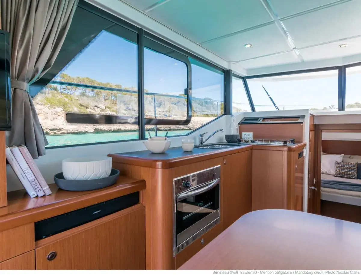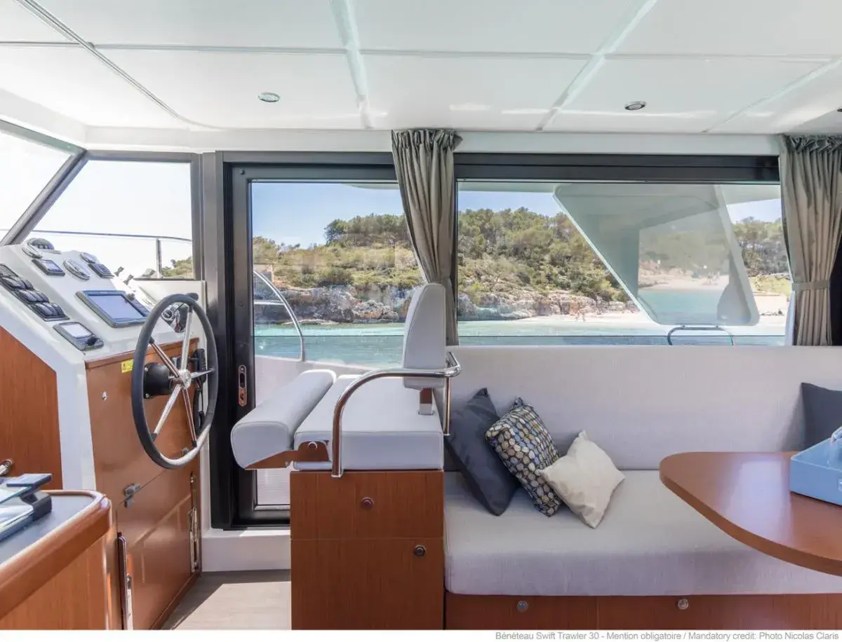Diese Beneteau Swift Trawler 30 ist ideal für zwei Personen. Bei gutem Wetter bietet die Flybridge eine perfekte Aussicht über die Mecklenburgische Seenplatte.