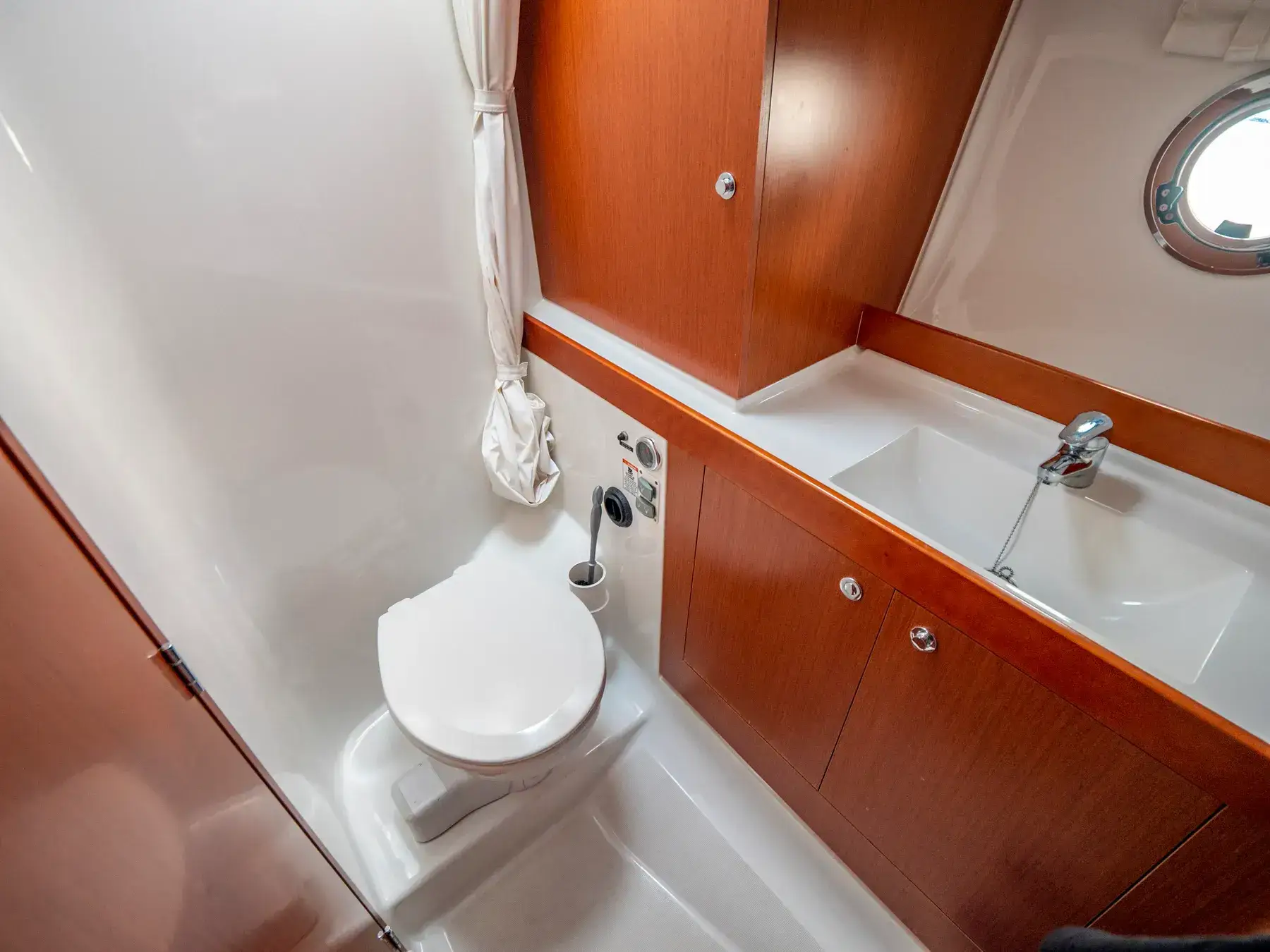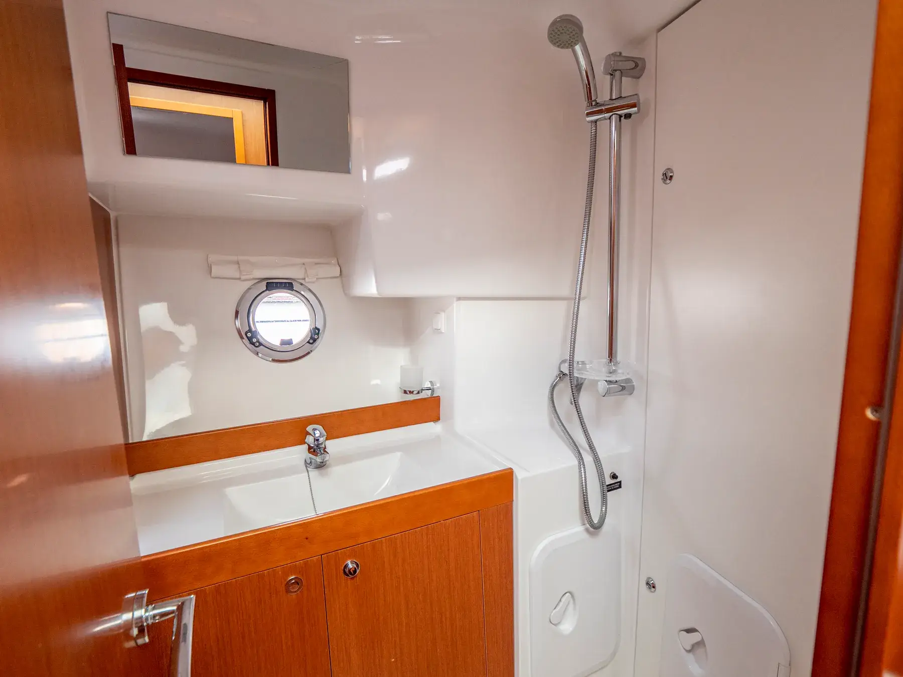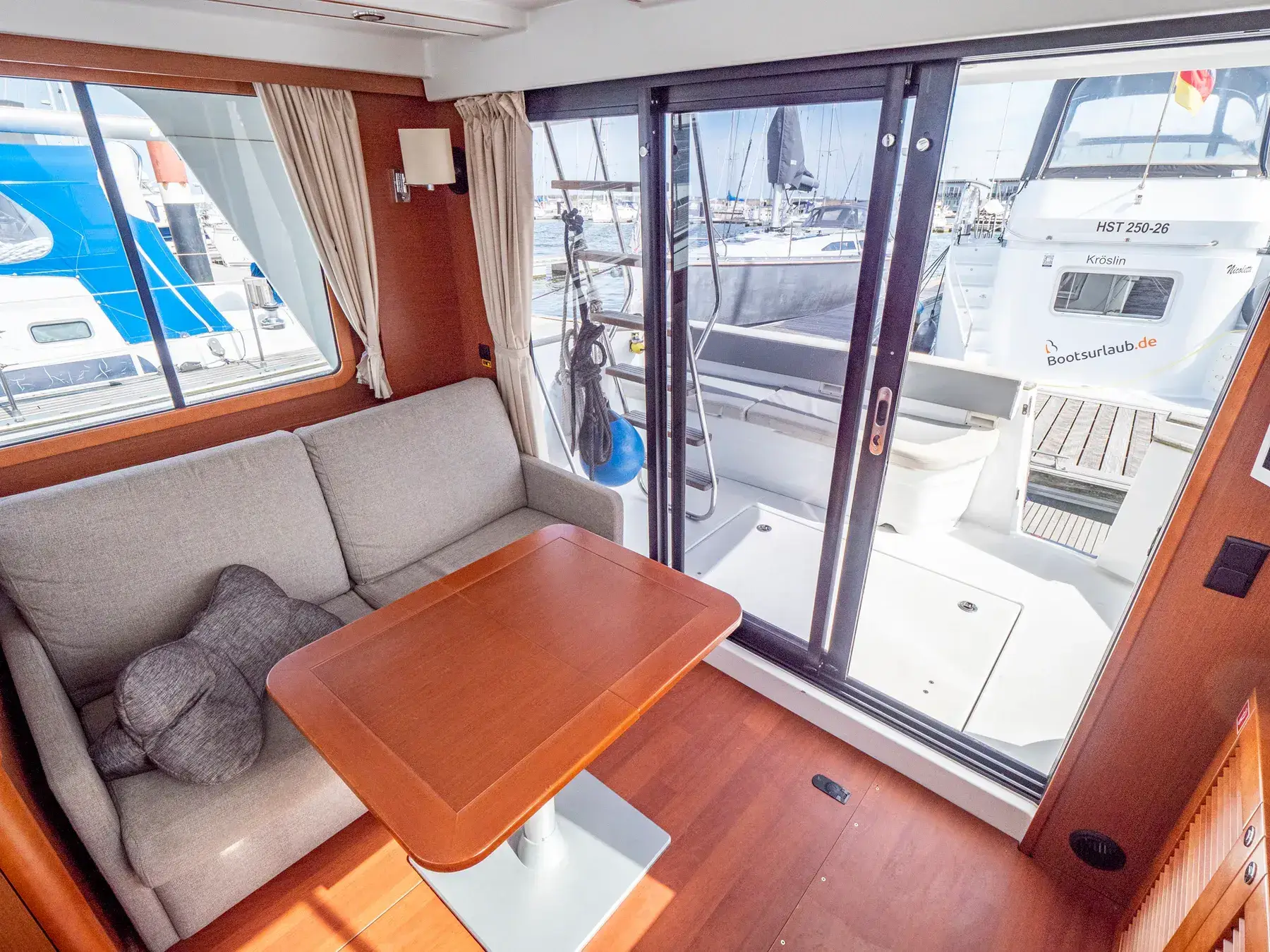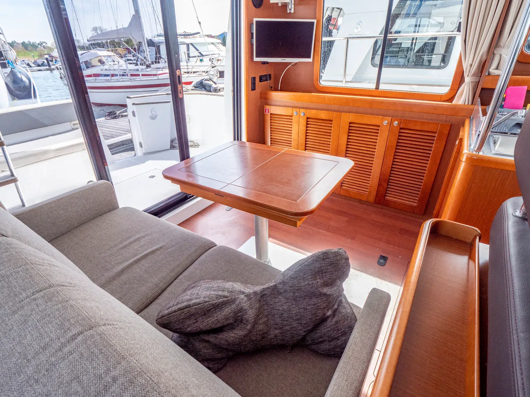 Der Salon der Yacht bietet ein umwandelbares Sofa (1,20 x 2,00 m), einen höhenverstellbaren und schwenkbaren Salontisch aus lackiertem Holz, eine Schiebetür rechts am Fahrstand, Staufächer und eine hintere Schiebefenstertür mit drei Elementen. Für Unterhaltung sorgen ein CD-Player/MP3 mit USB-Anschluss und zwei Lautsprecher im Ruderhaus und Cockpit. Das Cockpit ist selbstlenzend und verfügt über einen Brausekopf mit Warm- und Kaltwasser, eine Pforte zum Heckspiegel, eine Badeplattform mit Edelstahl- und Polyestereinfassung sowie eine Badeleiter aus Edelstahl. Die Flybridge ist ebenfalls selbstlenzend und mit einer Zugangsleiter aus Edelstahl, einer Windschutzscheibe, einer Steuerkonsole mit Armaturenbrett, Füllstandsanzeige, Ruderlagenanzeiger, Steuerkompass, hydraulischer Steuerung, Nebelhorn, 12-V-Steckdose, einem einstellbaren Pilotensitz sowie einer L-förmigen Sitzbank mit Staufächern und einem abnehmbaren Tisch aus Massivholz ausgestattet.