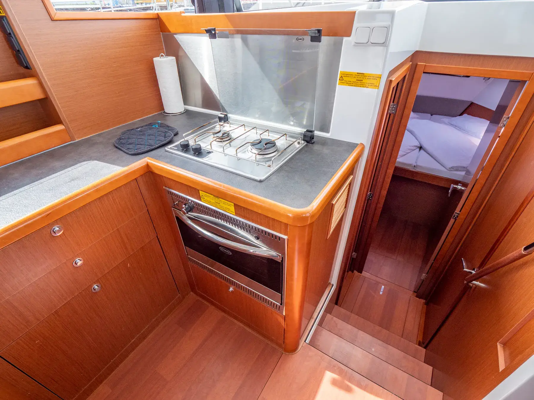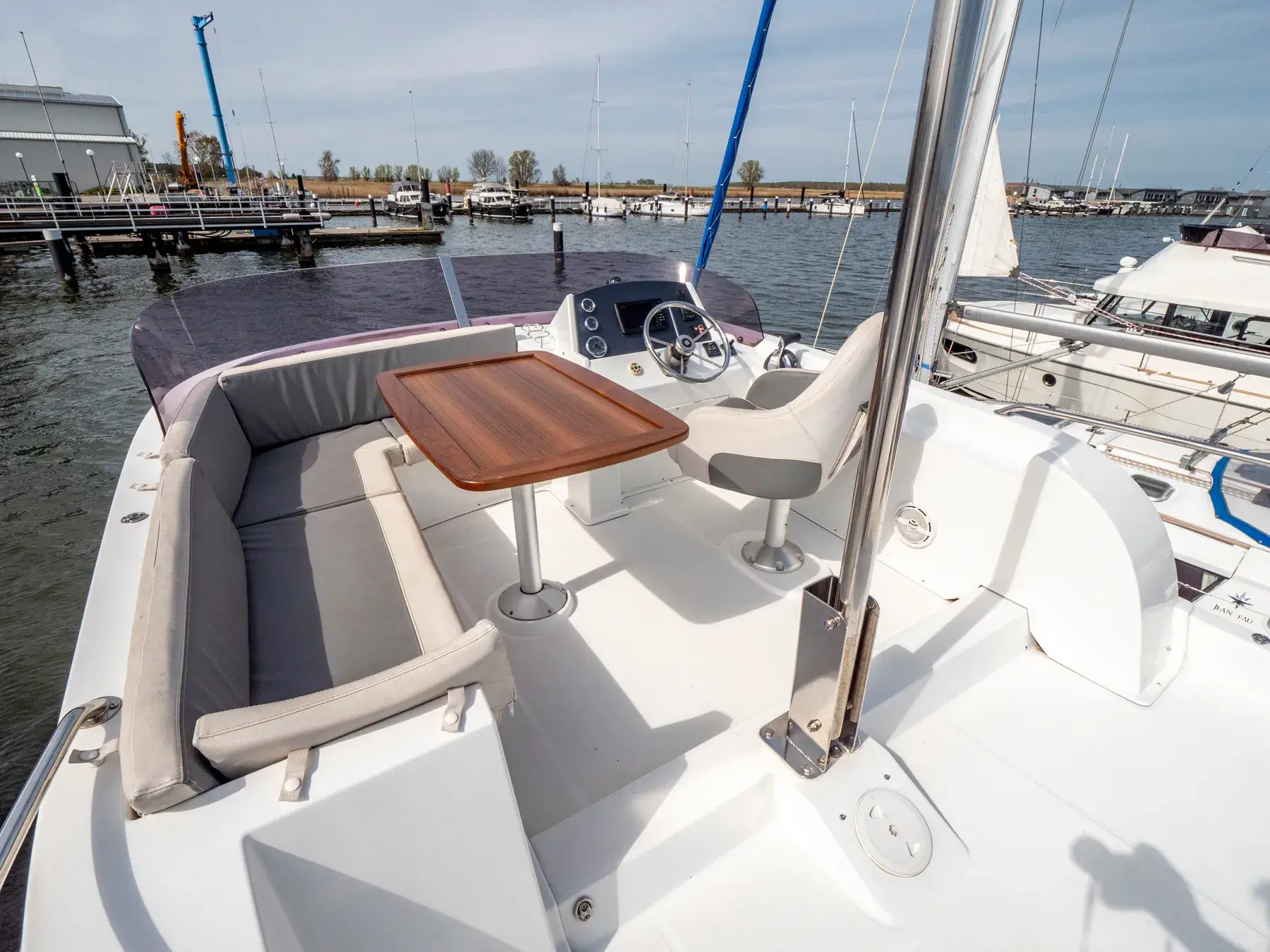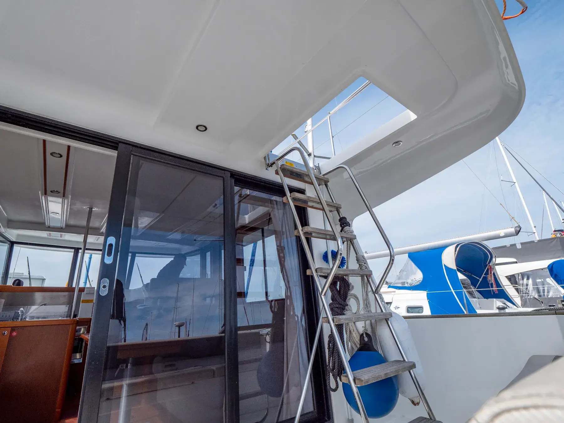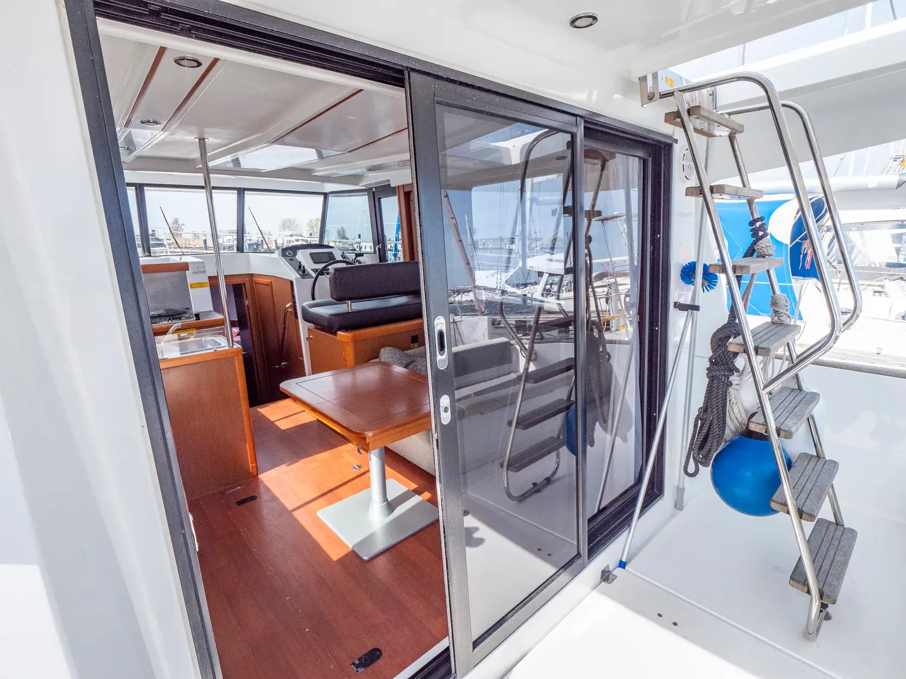 Der Salon der Yacht bietet ein umwandelbares Sofa (1,20 x 2,00 m), einen höhenverstellbaren und schwenkbaren Salontisch aus lackiertem Holz, eine Schiebetür rechts am Fahrstand, Staufächer und eine hintere Schiebefenstertür mit drei Elementen. Für Unterhaltung sorgen ein CD-Player/MP3 mit USB-Anschluss und zwei Lautsprecher im Ruderhaus und Cockpit. Das Cockpit ist selbstlenzend und verfügt über einen Brausekopf mit Warm- und Kaltwasser, eine Pforte zum Heckspiegel, eine Badeplattform mit Edelstahl- und Polyestereinfassung sowie eine Badeleiter aus Edelstahl. Die Flybridge ist ebenfalls selbstlenzend und mit einer Zugangsleiter aus Edelstahl, einer Windschutzscheibe, einer Steuerkonsole mit Armaturenbrett, Füllstandsanzeige, Ruderlagenanzeiger, Steuerkompass, hydraulischer Steuerung, Nebelhorn, 12-V-Steckdose, einem einstellbaren Pilotensitz sowie einer L-förmigen Sitzbank mit Staufächern und einem abnehmbaren Tisch aus Massivholz ausgestattet.