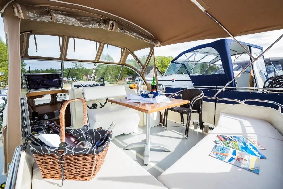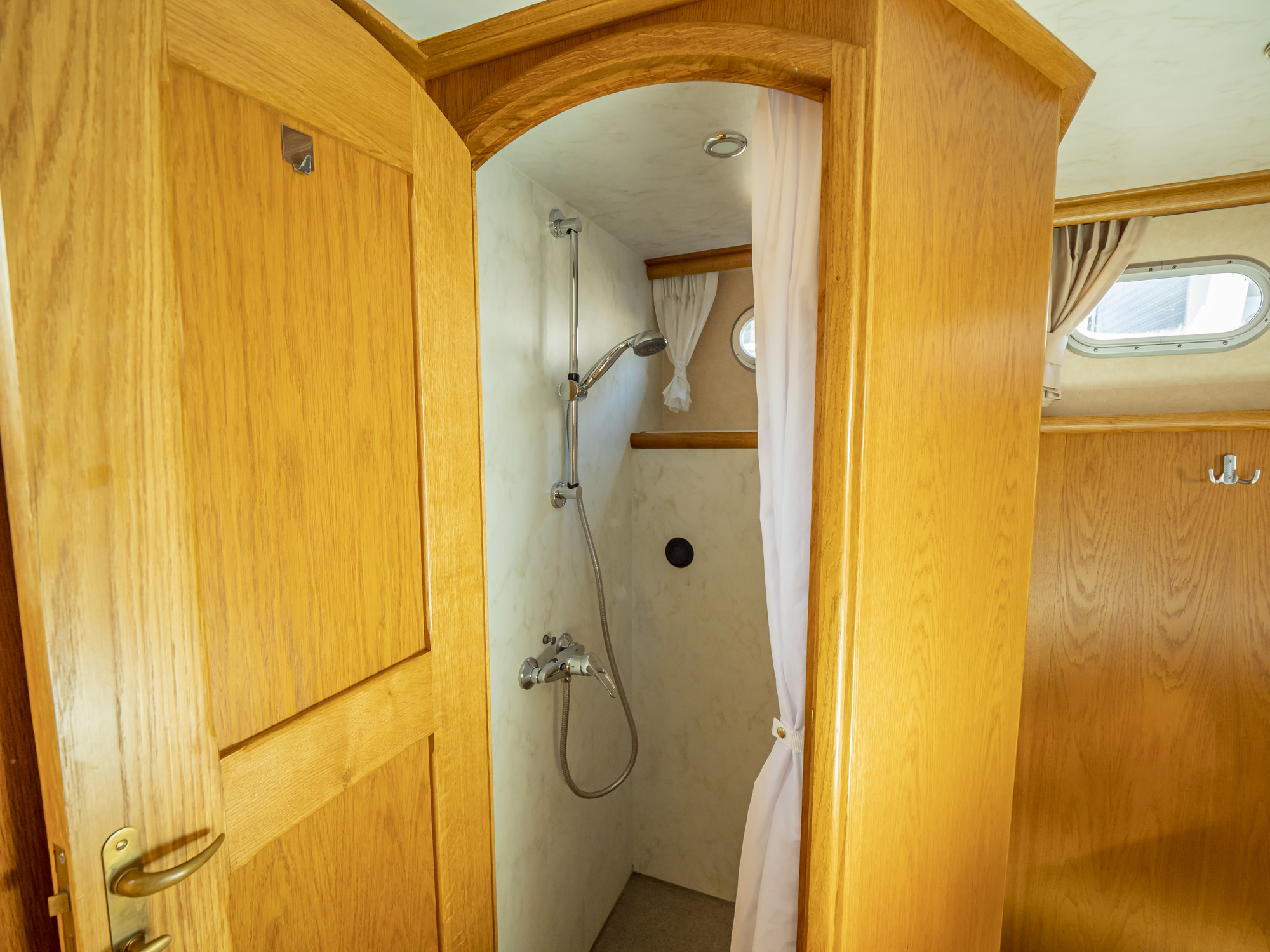 Ausstattung: vollständige Pantry mit mehrflammigem Kochfeld, Mikrowelle, 90 l Kühlschrank; 1 x Nasszelle mit Waschbecken, elektr. WC und Dusche, 1 x Nasszelle mit Waschbecken und elekt. WC, 1 separate Dusche; Fernseher, DVBT-Anschluss, CD-Radio, Heizung, Eicheausbau; Echolot, komplett verschließbare Persenning und Sonnensegel; Bug- und Heckstrahlruder