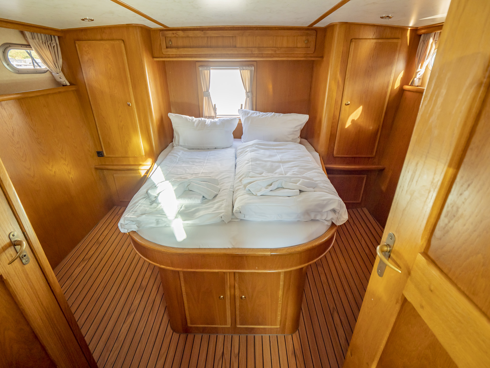 Die Gruno Werft in Zoutkamp ist bekannt für Ihre Innovationen im Stahlyachtbau, welche bei der brandneuen Gruno 35 classic KR voll zur Geltung kommen. Die KR Baureihe zeichnet sich durch mehr Platz besonders in den Kabinen gegenüber der alten Baureihe aus. Natürlich bietet dieses Schiff eine bequeme Treppe achtern backbords und zusätzlich Stauraum auf dem Achterdeck. Die Küche befindet sich auf einer Ebene mit dem Salon.