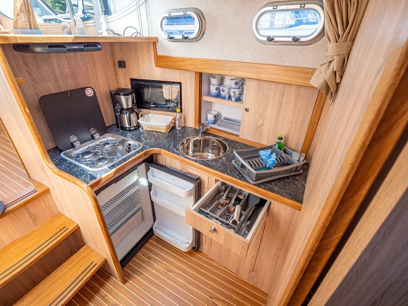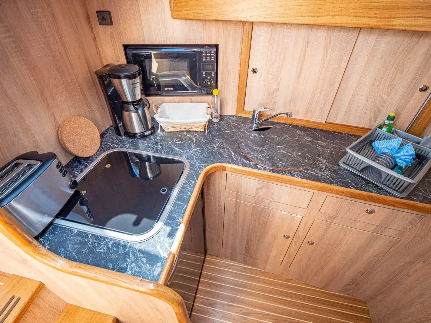 Die Yacht verfügt über eine vollständige Pantry mit mehrflammigem Kochfeld und einem 90-l-Kühlschrank. Sie bietet ein elektrisches WC mit Waschbecken sowie eine separate Dusche. Zur Unterhaltung gibt es einen Fernseher mit DVD-Player, eine selbstnachführende SAT-Anlage und ein CD-Radio. Weitere Ausstattungsmerkmale sind eine Heizung, ein Echolot, eine komplett verschließbare Persenning mit Sitzgruppe sowie Bug- und Heckstrahlruder.