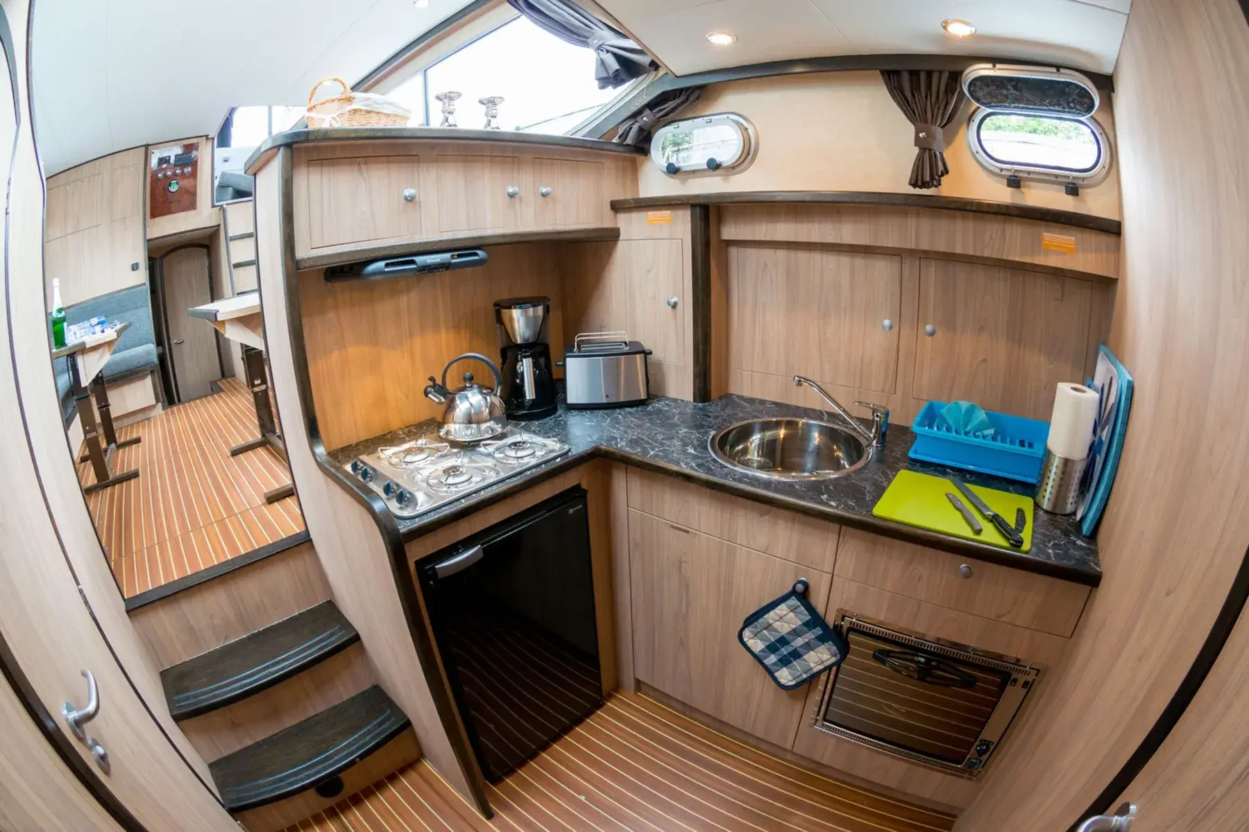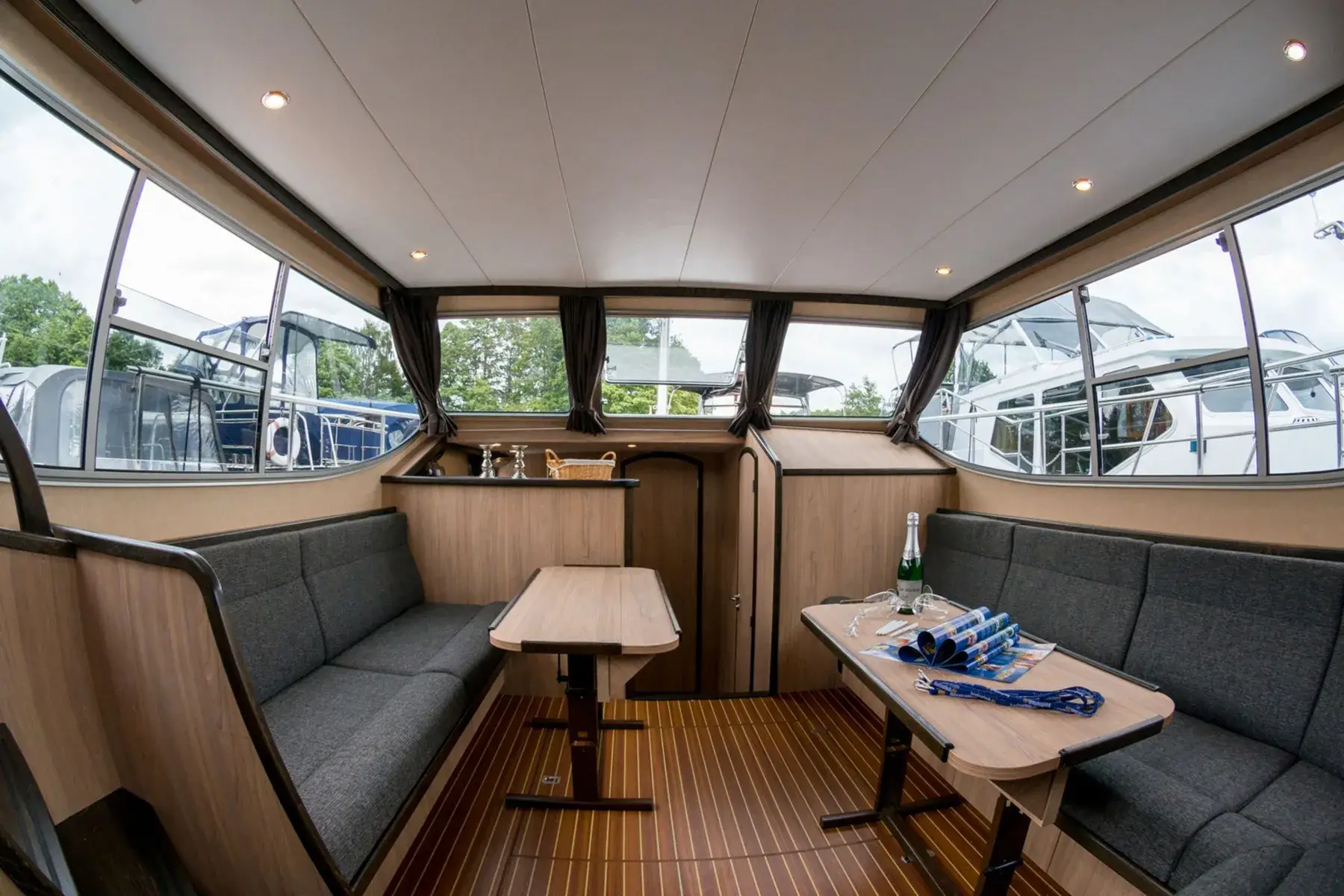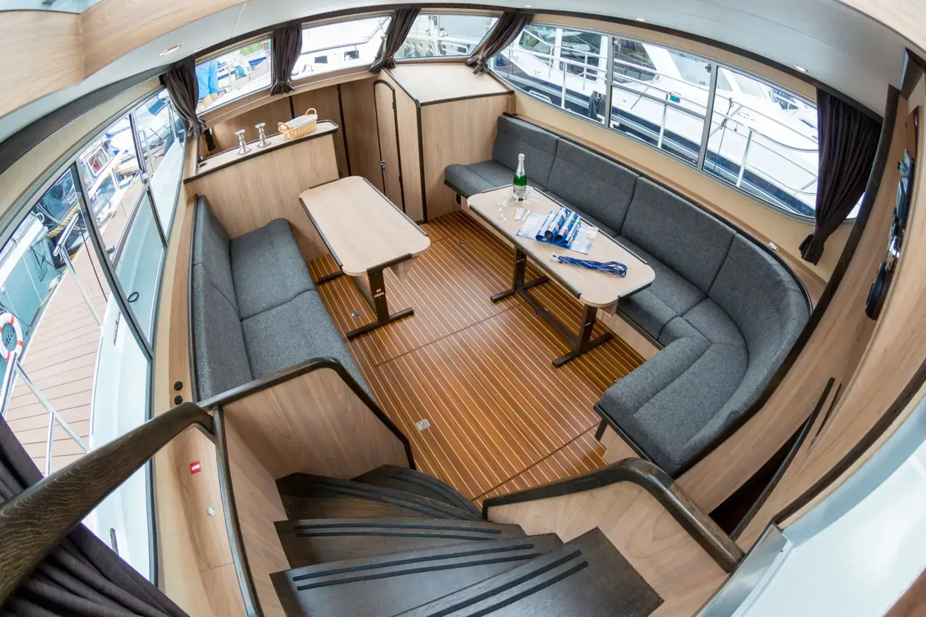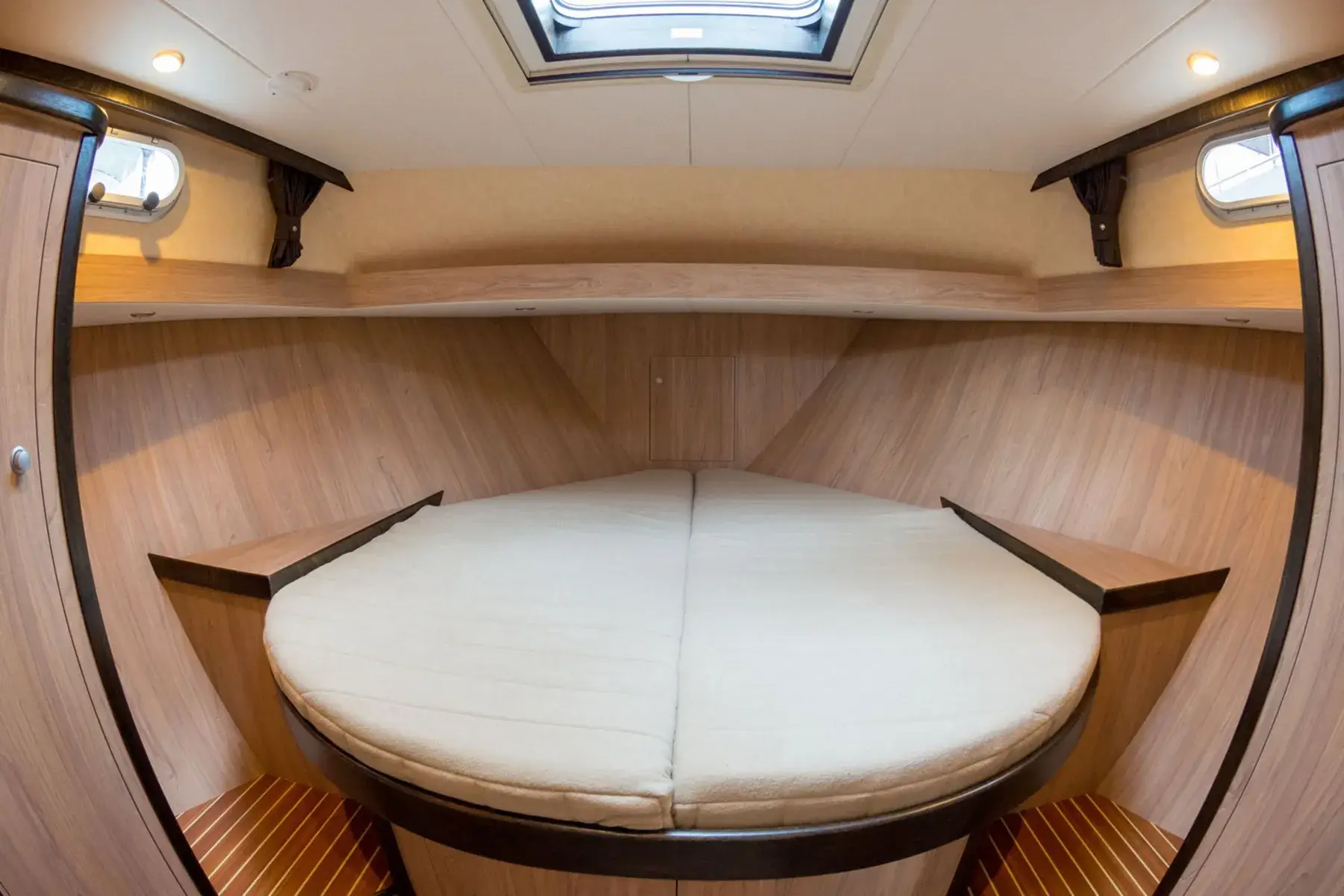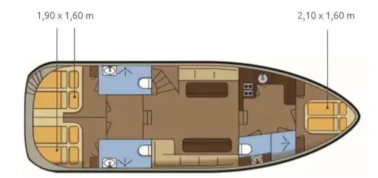 Diese moderne Stahlyacht bietet hohen Komfort für 6 Personen. Im Vorderbereich befindet sich ein französisches Doppelbett, während im Achterbereich zwei Kabinen mit jeweils einem Doppelbett und viel Stauraum zur Verfügung stehen.