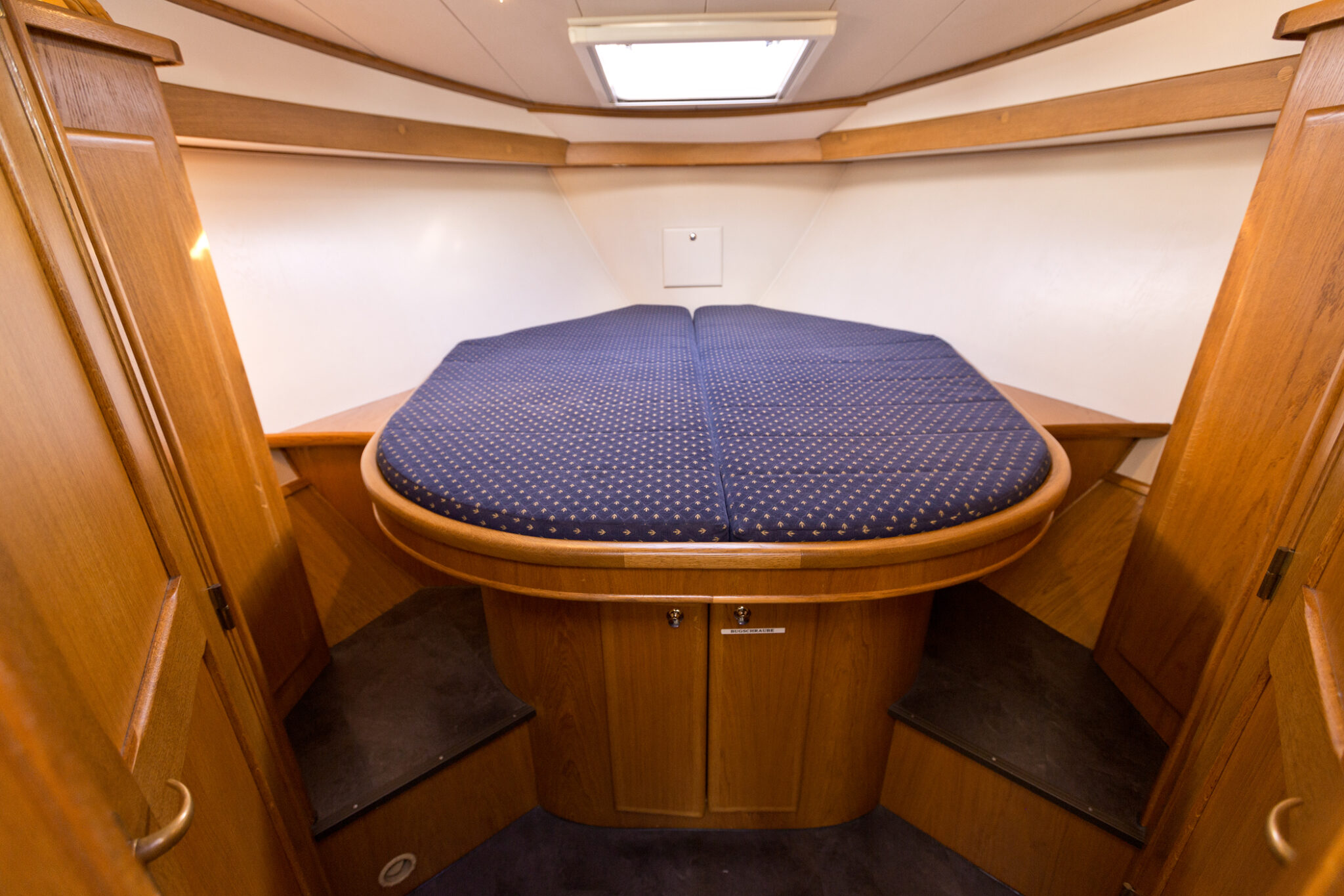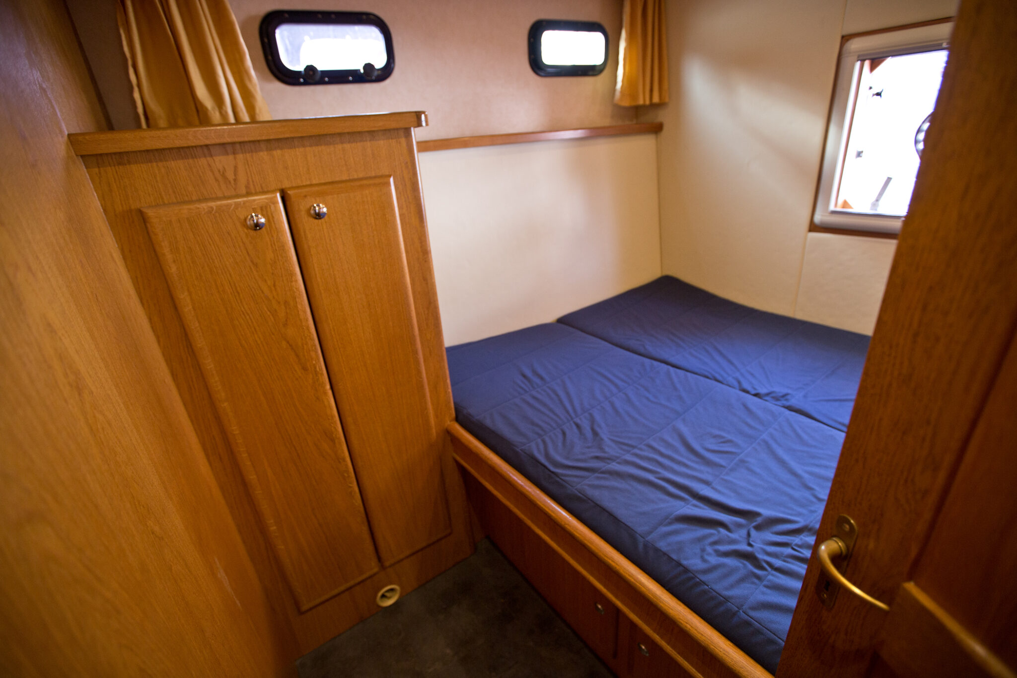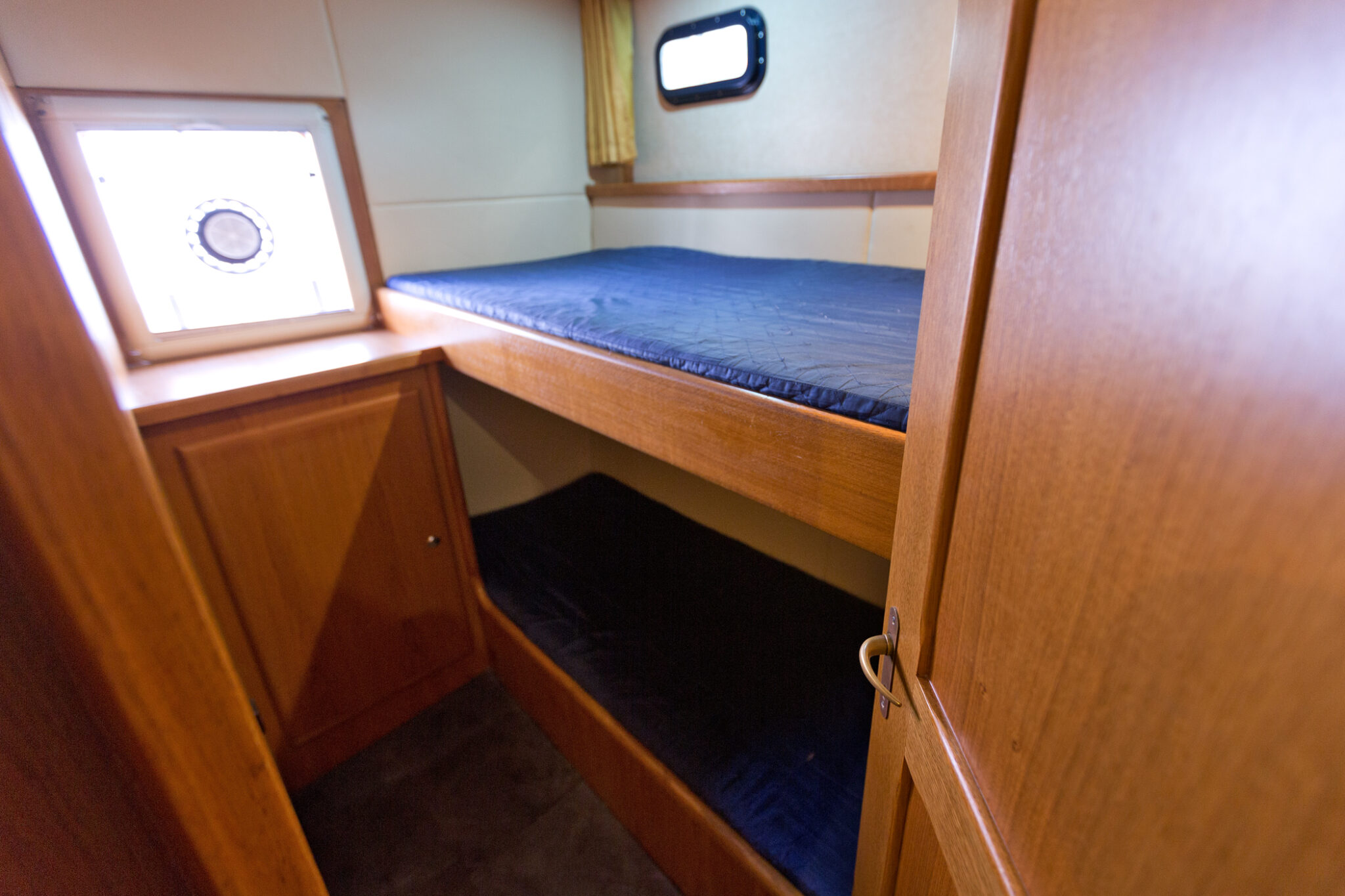 Diese moderne Stahlyacht bietet hohen Komfort für 6 Personen mit einem französischen Doppelbett im Vorderbereich, 2 Kabinen mit je einem Doppelbett und einem Etagenbett und viel Stauraum im Achterbereich.