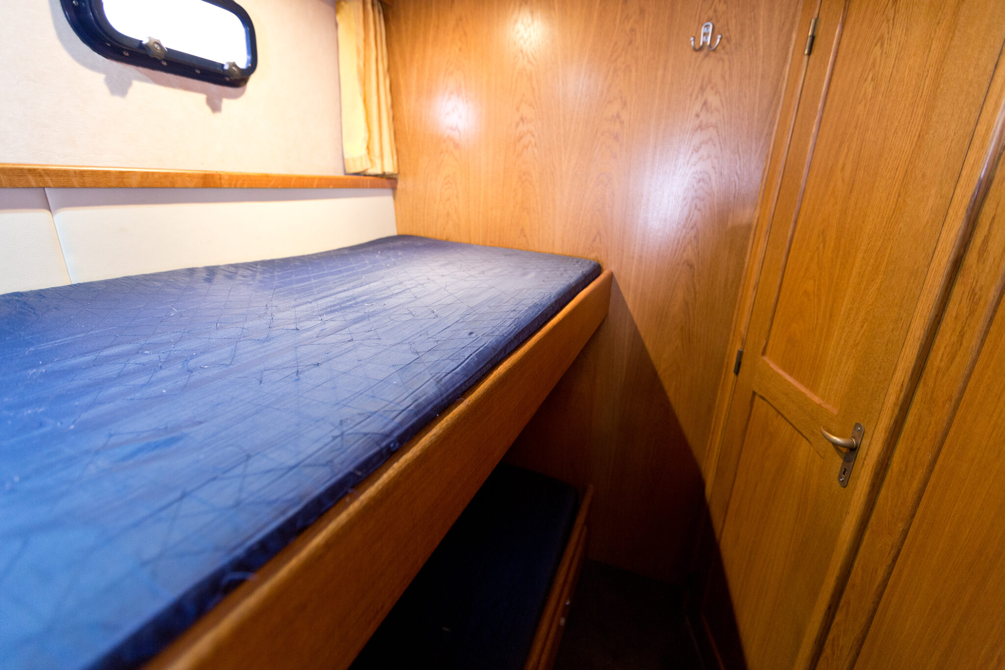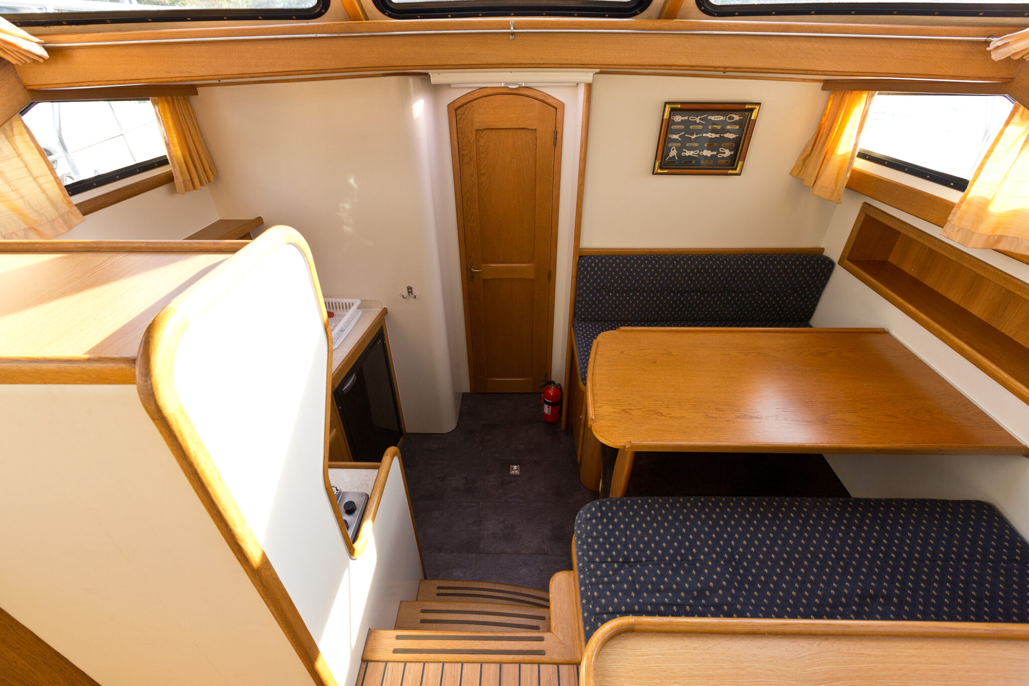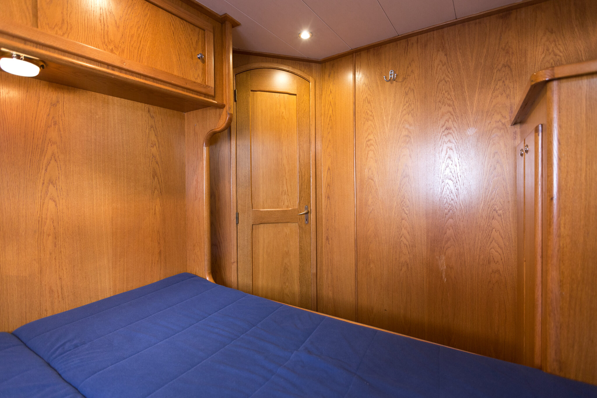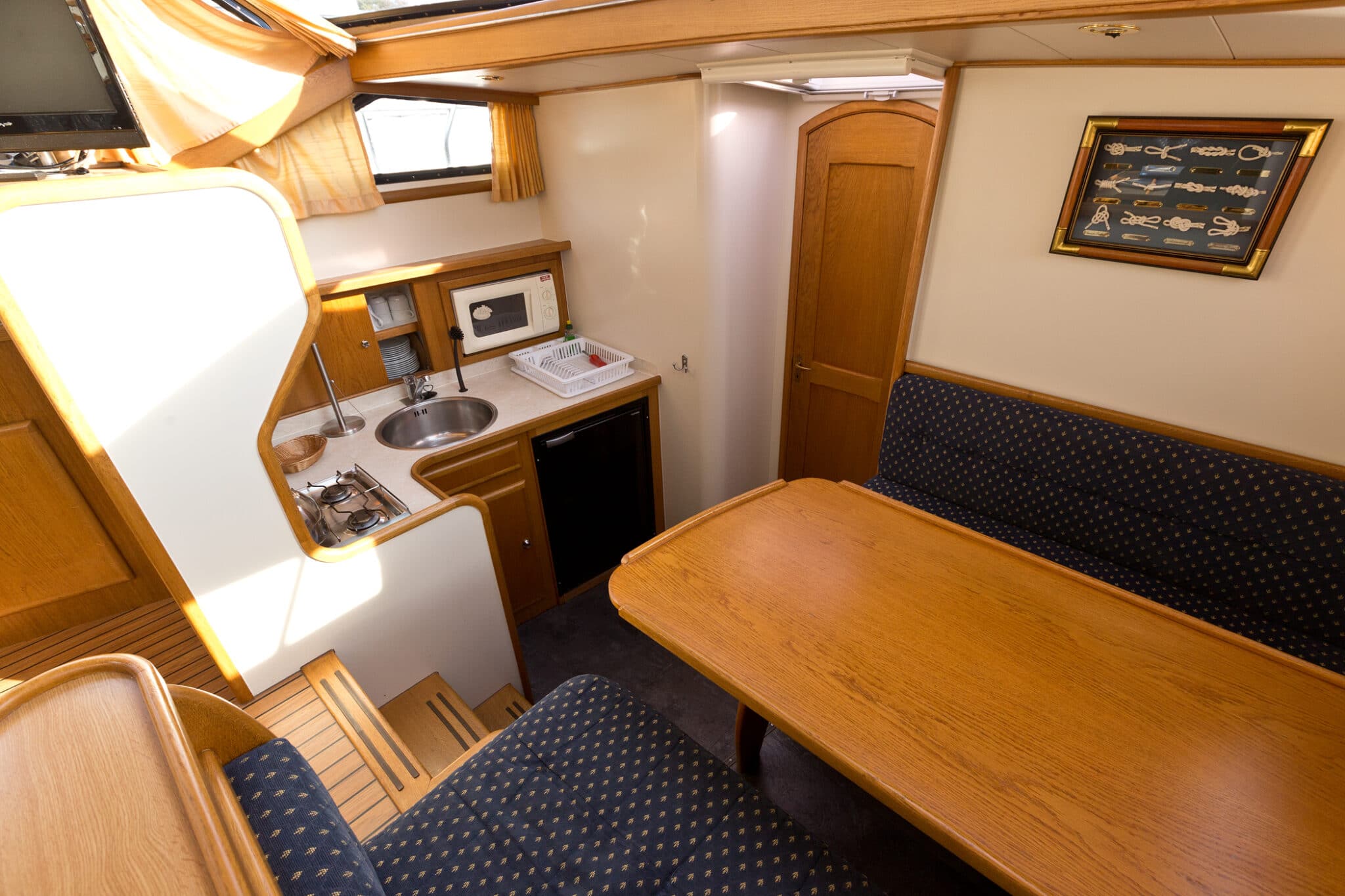 Diese moderne Stahlyacht bietet hohen Komfort für 6 Personen mit einem französischen Doppelbett im Vorderbereich, 2 Kabinen mit je einem Doppelbett und einem Etagenbett und viel Stauraum im Achterbereich.