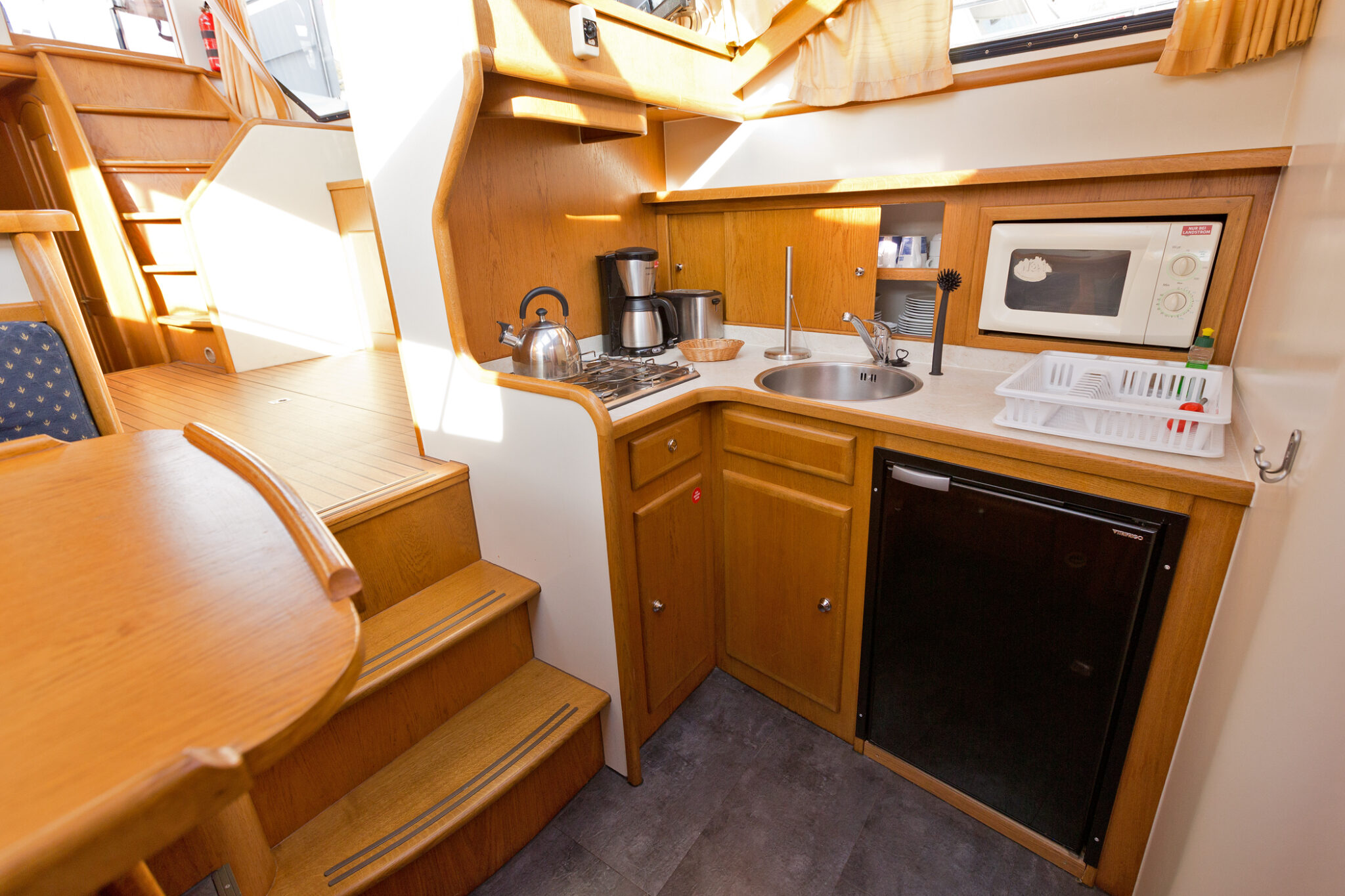 Vollständige Pantry mit mehrflammigem Kochfeld, 110 l Kühlschrank, 1 x Nasszelle mit Waschbecken, manu. WC und Dusche, 1 x Nasszelle mit Waschbecken und manu. WC, 1 separate Dusche, Fernseher, SAT-Anlage, CD-Radio, Eicheholzausbau, Heizung, Echolot, Ruderstandsanzeige, komplett verschließbare Persenning, Bug- und Heckstrahlruder, 2 Sessel im Salon