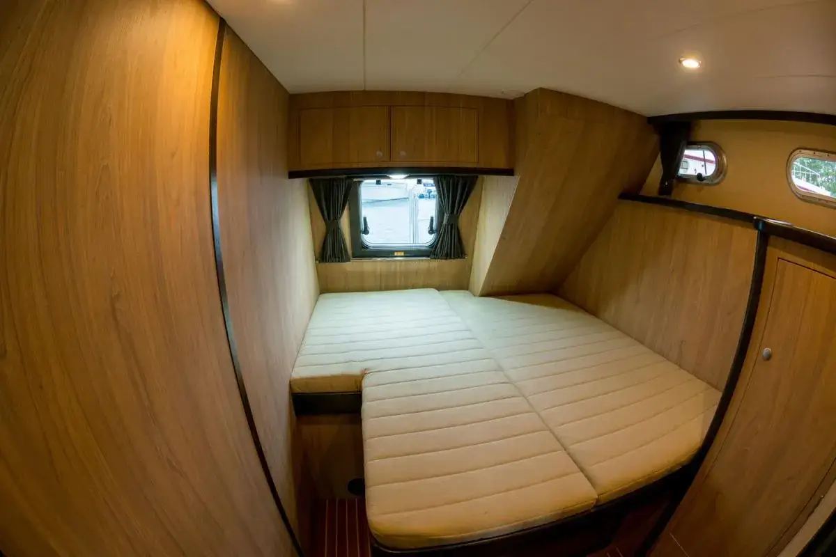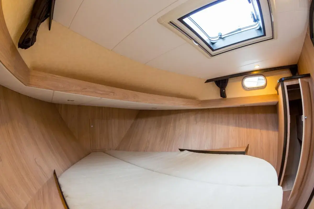 Diese moderne Stahlyacht bietet hohen Komfort für 6 Personen. Im Vorderbereich befindet sich ein französisches Doppelbett, während im Achterbereich zwei Kabinen mit jeweils einem Doppelbett und viel Stauraum zur Verfügung stehen.