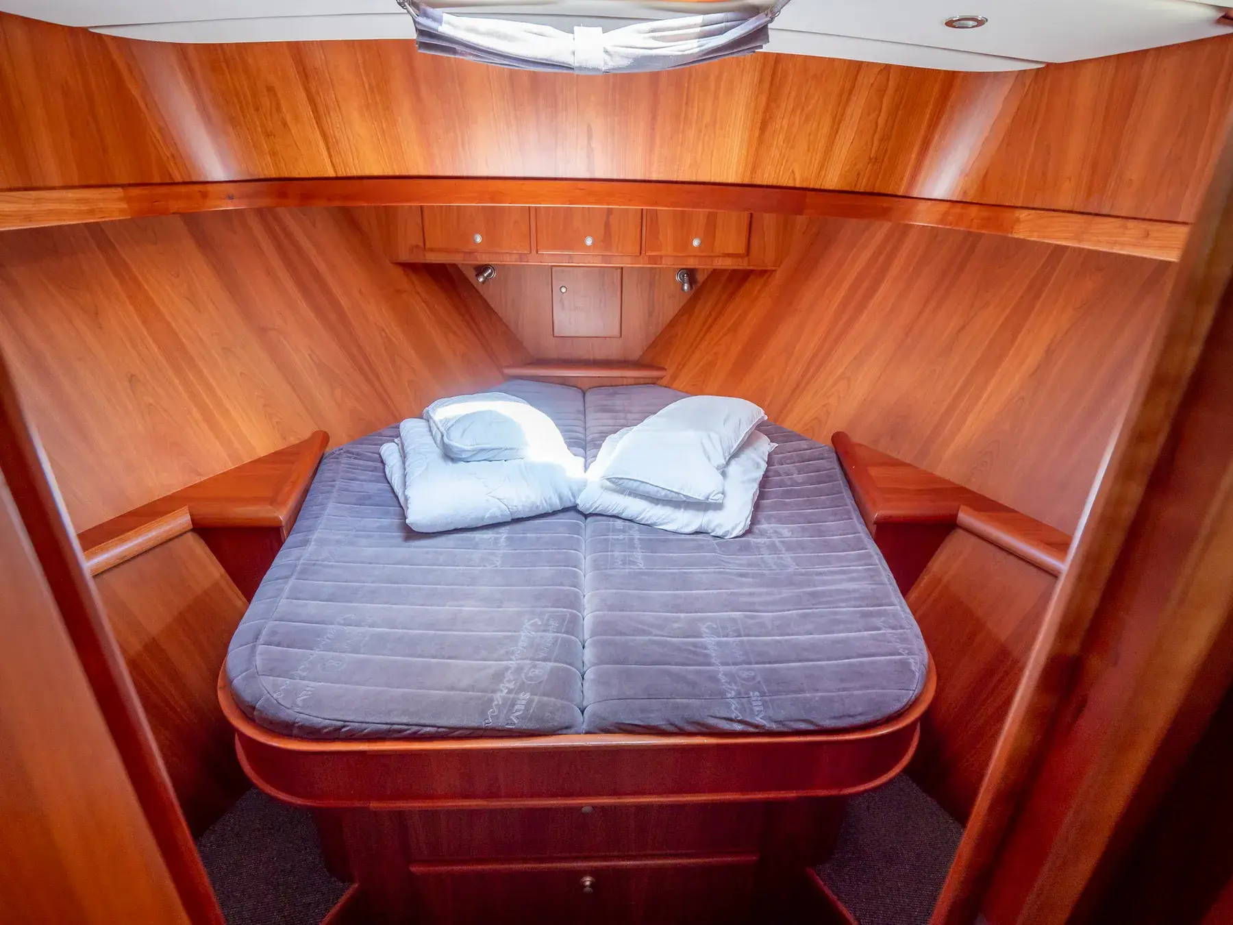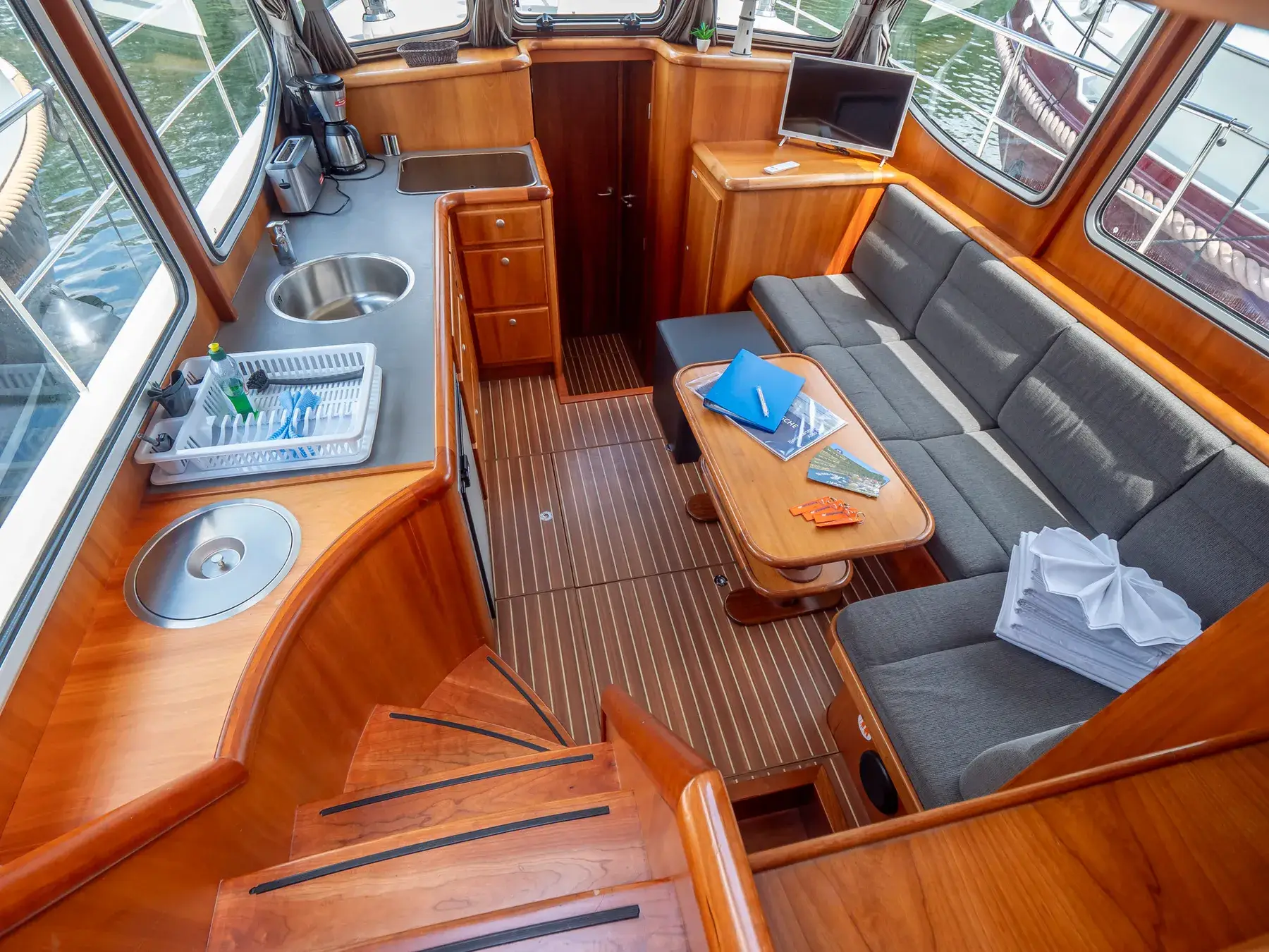 Die ausgesprochen attraktive Optik paart sich mit Luxus und Funktionalität. Feinster Kirsche-Holzausbau rundet die komfortable Gesamtaustattung ab. Absolut gleichwertige Kabinen mit jeweils eigener Toilette und Dusche, sowie eine durch das Sonnensegel überdachte Sitzgruppe auf dem Achterdeck sprechen für die inneren und äusseren Qualitäten dieser Luxusyacht. Der Aufstieg ist über die Wendeltreppe sehr bequem von der Badeplattform auf das Achterdeck.