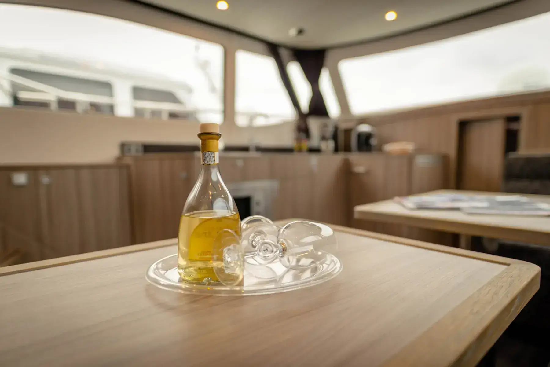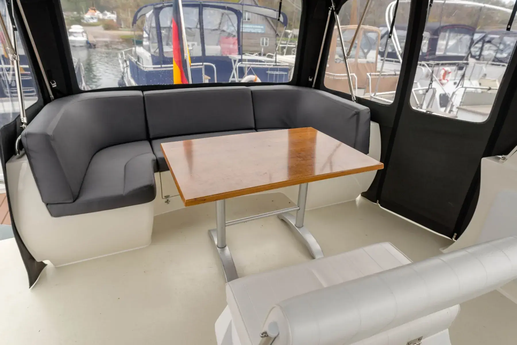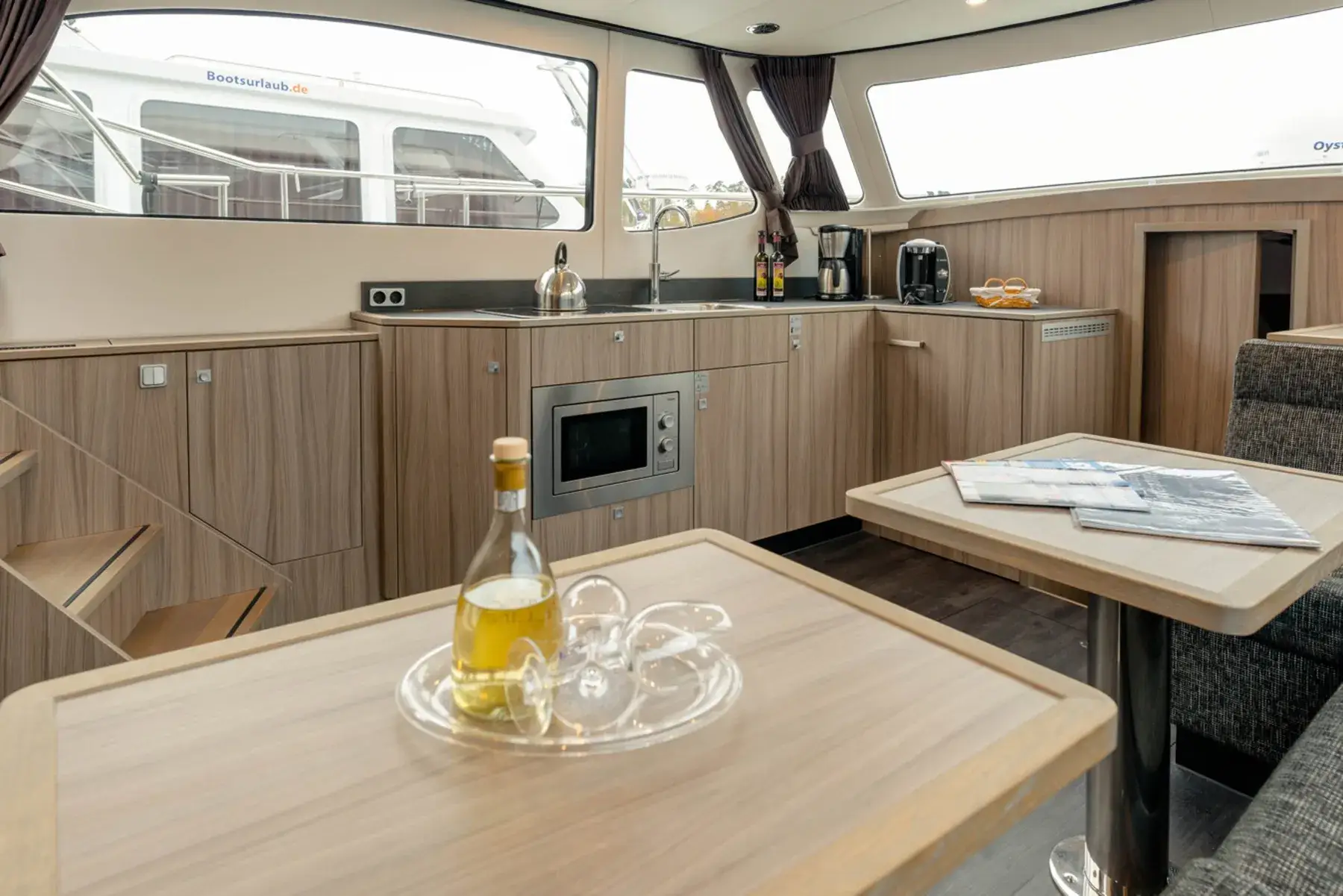Vollständige Pantry mit mehrflammigem Kochfeld, 110 l Kühlschrank, 2 x Nasszelle mit Waschbecken und elektr. WC, 2x Dusche. Fernseher, SAT-Anlage, CD-Radio, Kabola Warmwasserheizung, Echolot mit Log, Ruderstandsanzeige, komplett verschließbare Persenning über dem Achterdeck mit Sitzgruppe, Bug- und Heckstrahlruder
