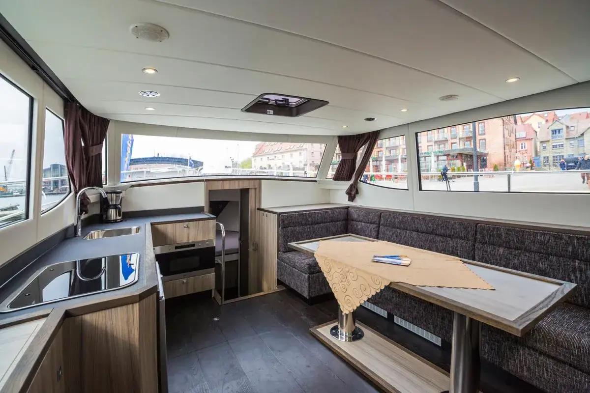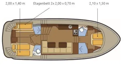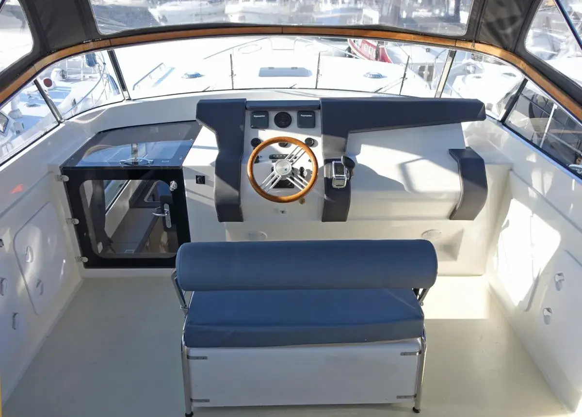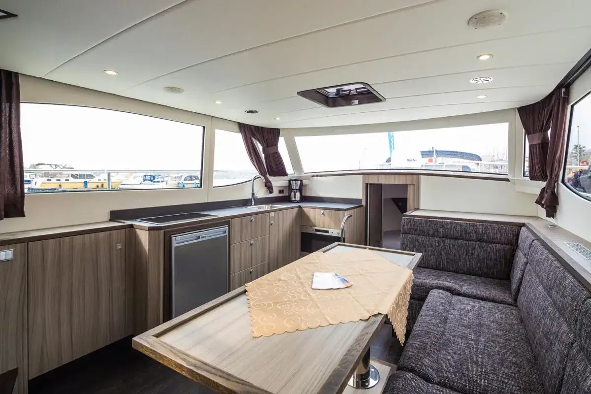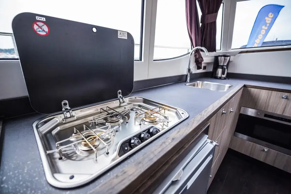 Vollständige Pantry mit mehrflammigem Kochfeld, 110 l Kühlschrank, 2 x Nasszelle mit Waschbecken und elektr. WC, 2x Dusche mit Waschbecken. Fernseher, SAT-Anlage, CD-Radio, Kabola Warmwasserheizung, Echolot mit Log, Ruderstandsanzeige, komplett verschließbare Persenning über dem Achterdeck mit Sitzgruppe, Bug- und Heckstrahlruder