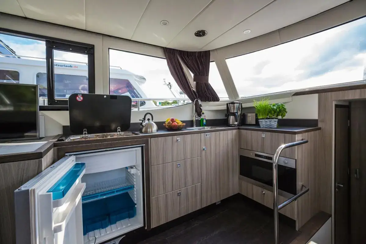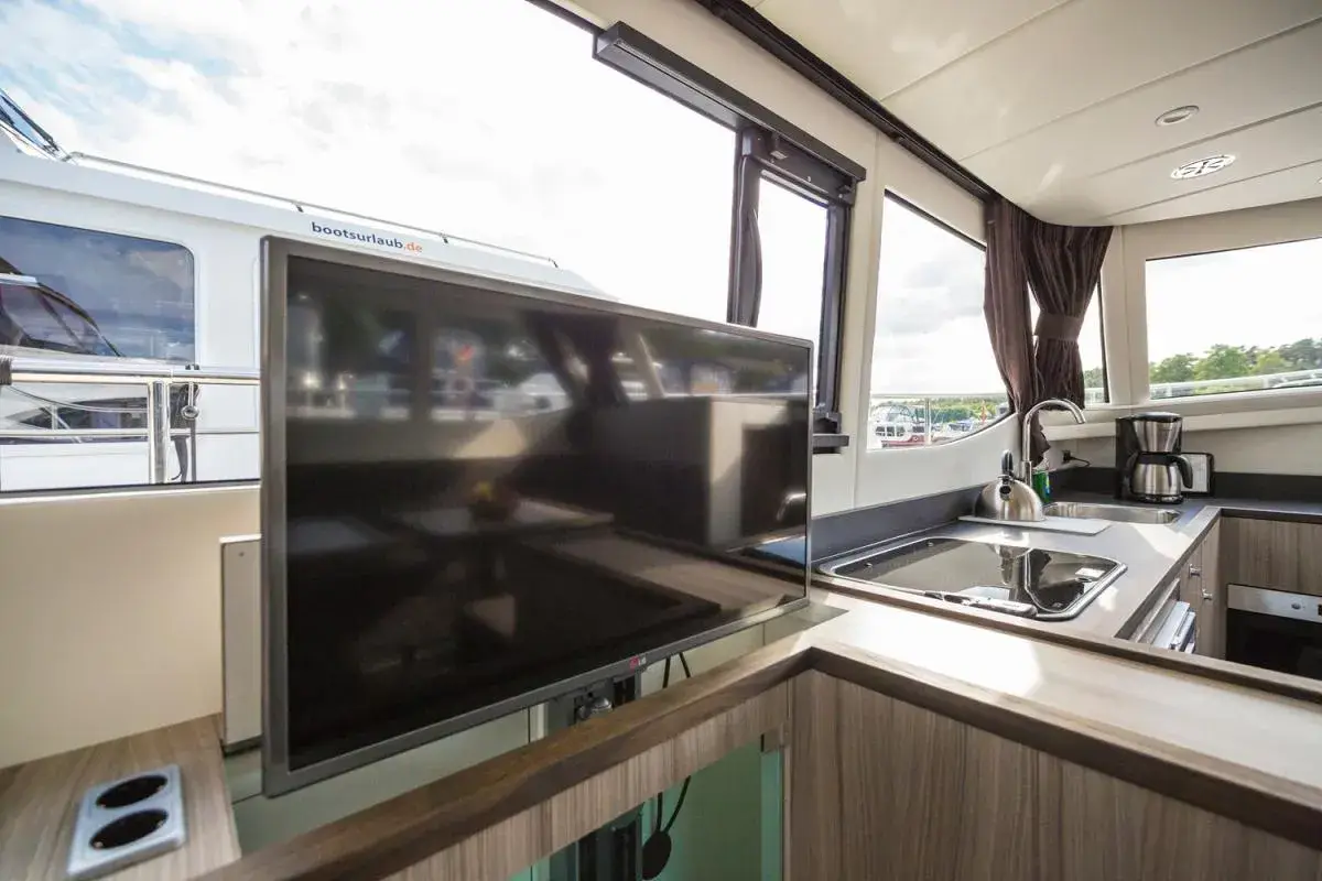 Vollständige Pantry mit mehrflammigem Kochfeld, 110 l Kühlschrank, 2 x Nasszelle mit Waschbecken und elektr. WC, 2x Dusche, Fernseher mit DVD-Player, SAT-Anlage, CD-Radio, Kabola Warmwasserheizung, Echolot mit Log, Ruderstandsanzeige, komplett verschließbare Persenning über dem Achterdeck mit Sitzgruppe, Bug- und Heckstrahlruder