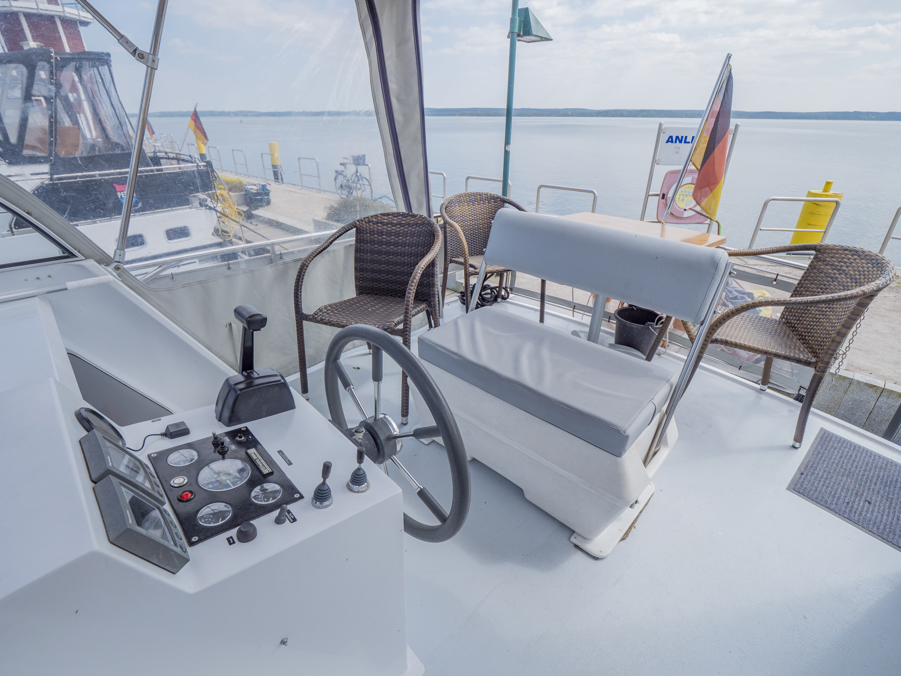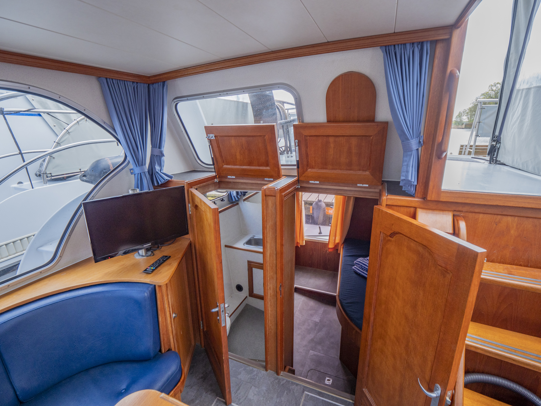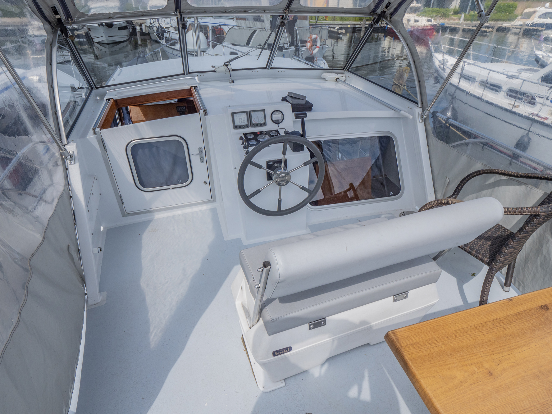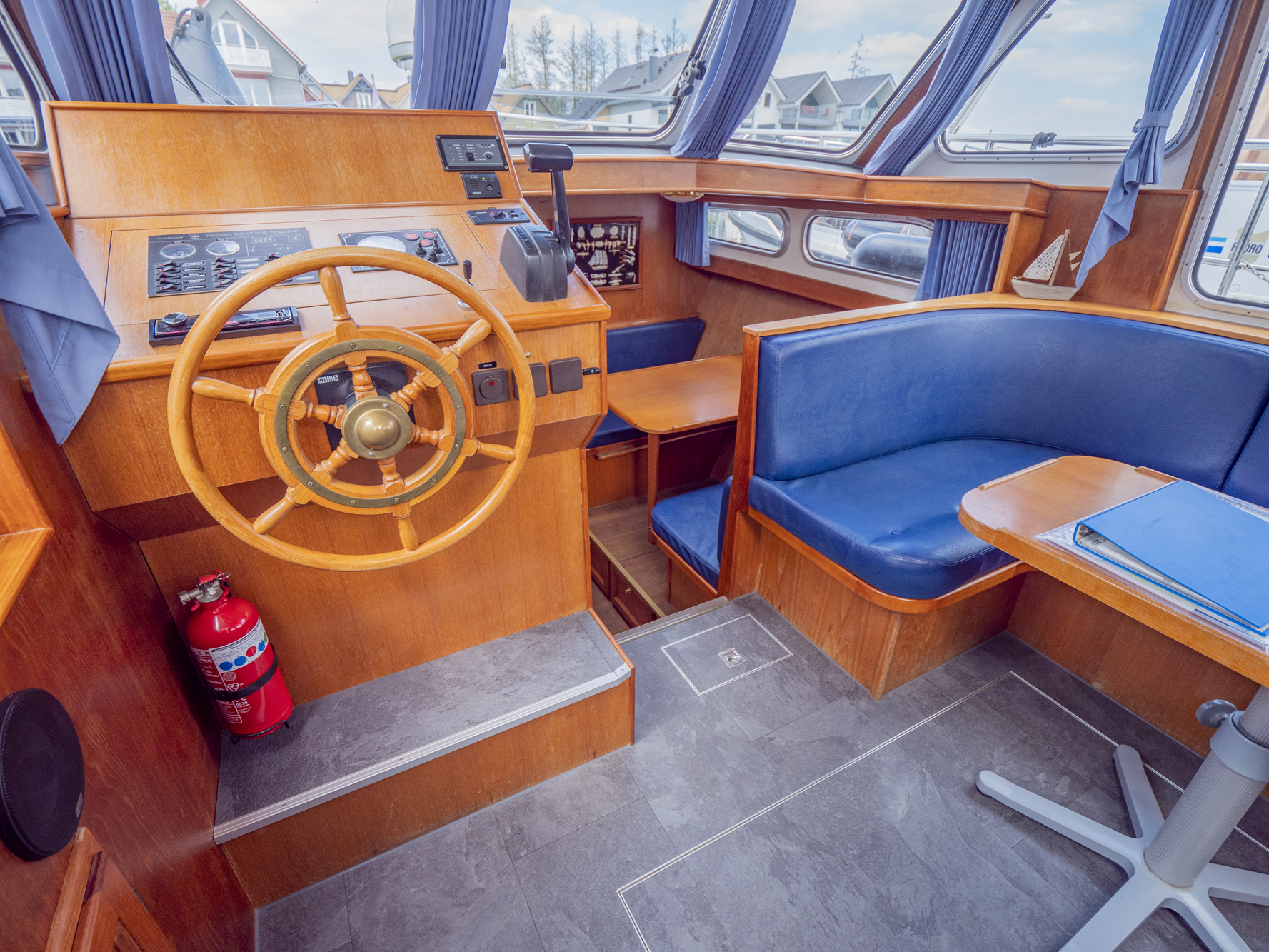 Vollständige Pantry mit mehrflammigem Kochfeld, 80 l Kühlschrank, Nasszelle mit Waschbecken, manu. WC und Dusche, SAT-TV, CD-Radio, Heizung; Echolot, Ruderstandsanzeige, komplett verschließbare Persenning, Bug- und Heckstrahlruder