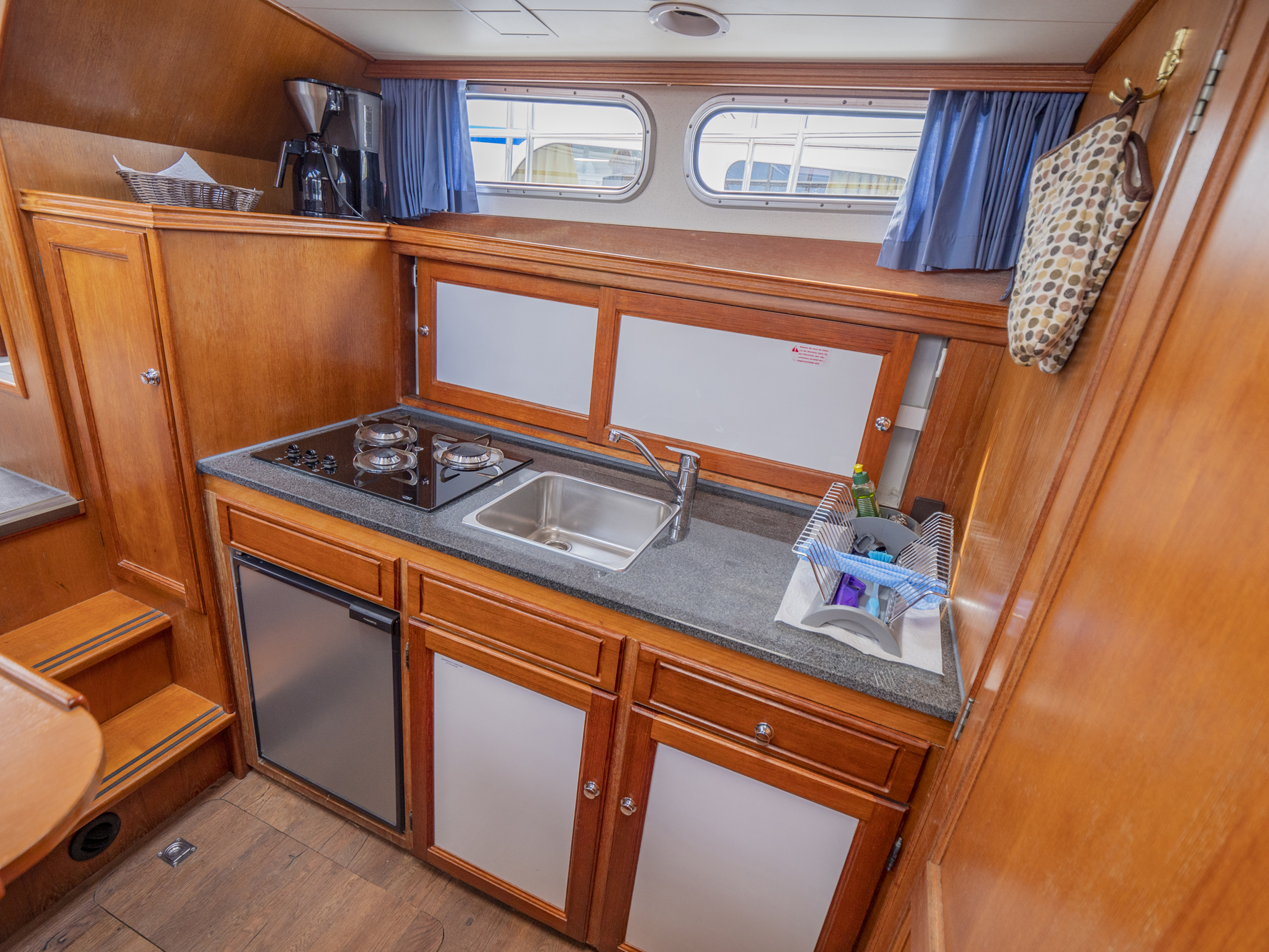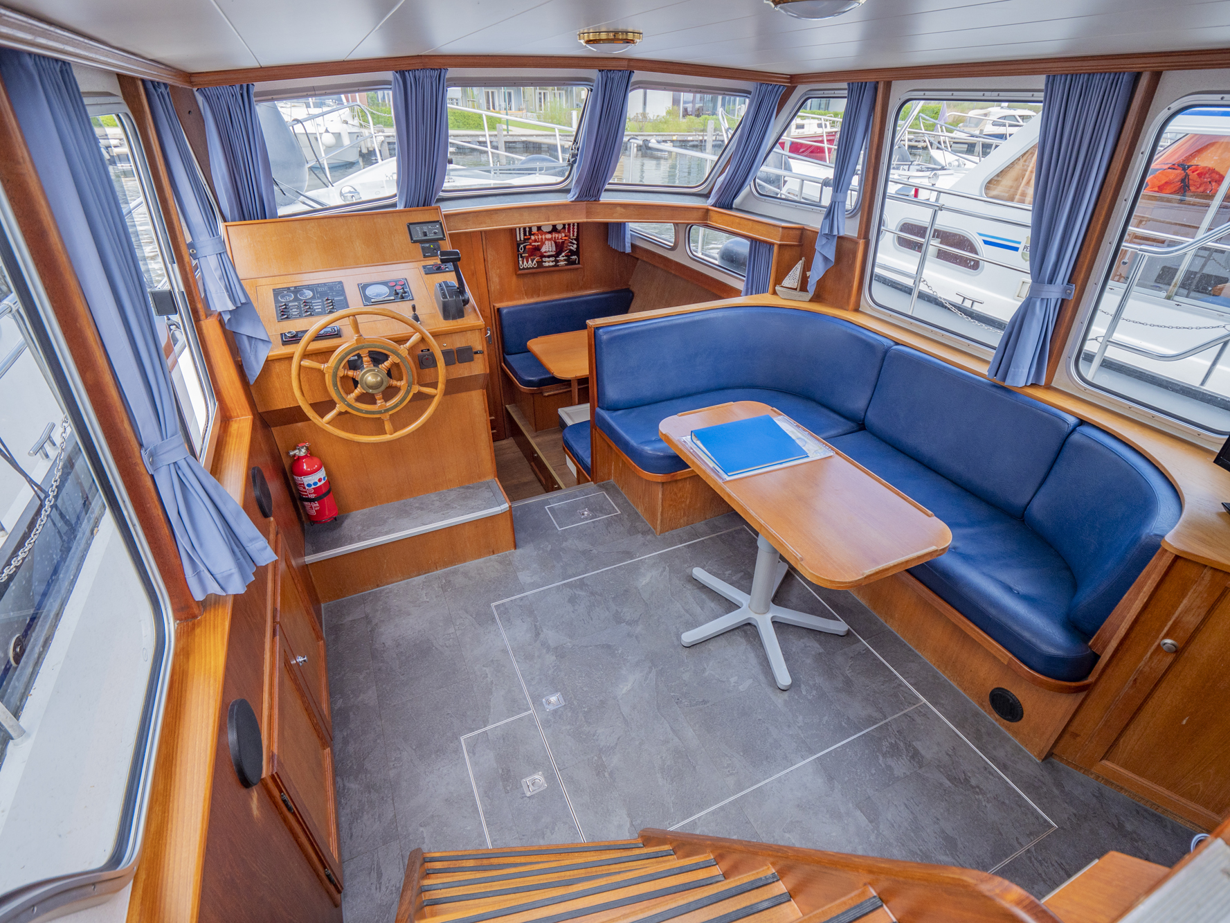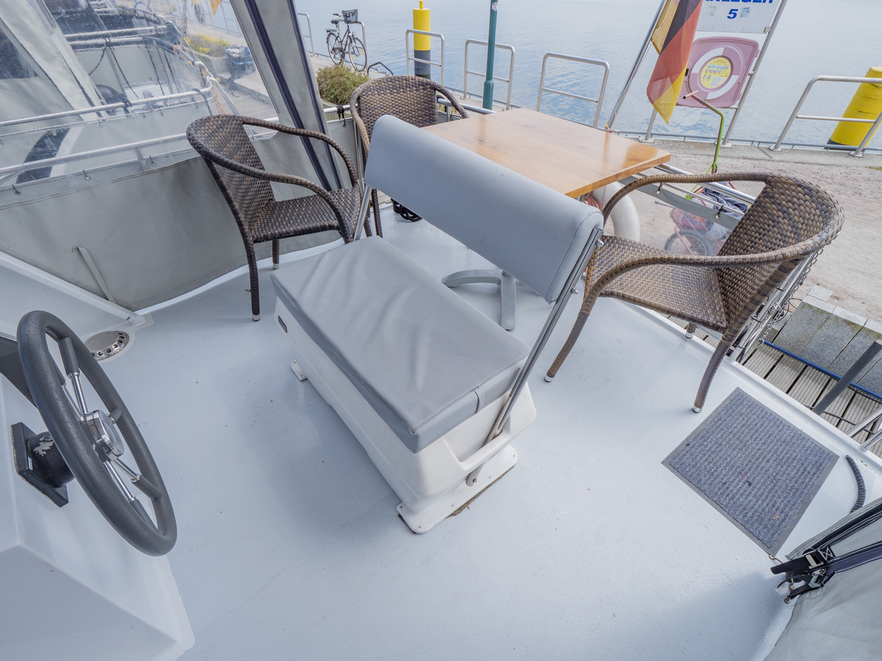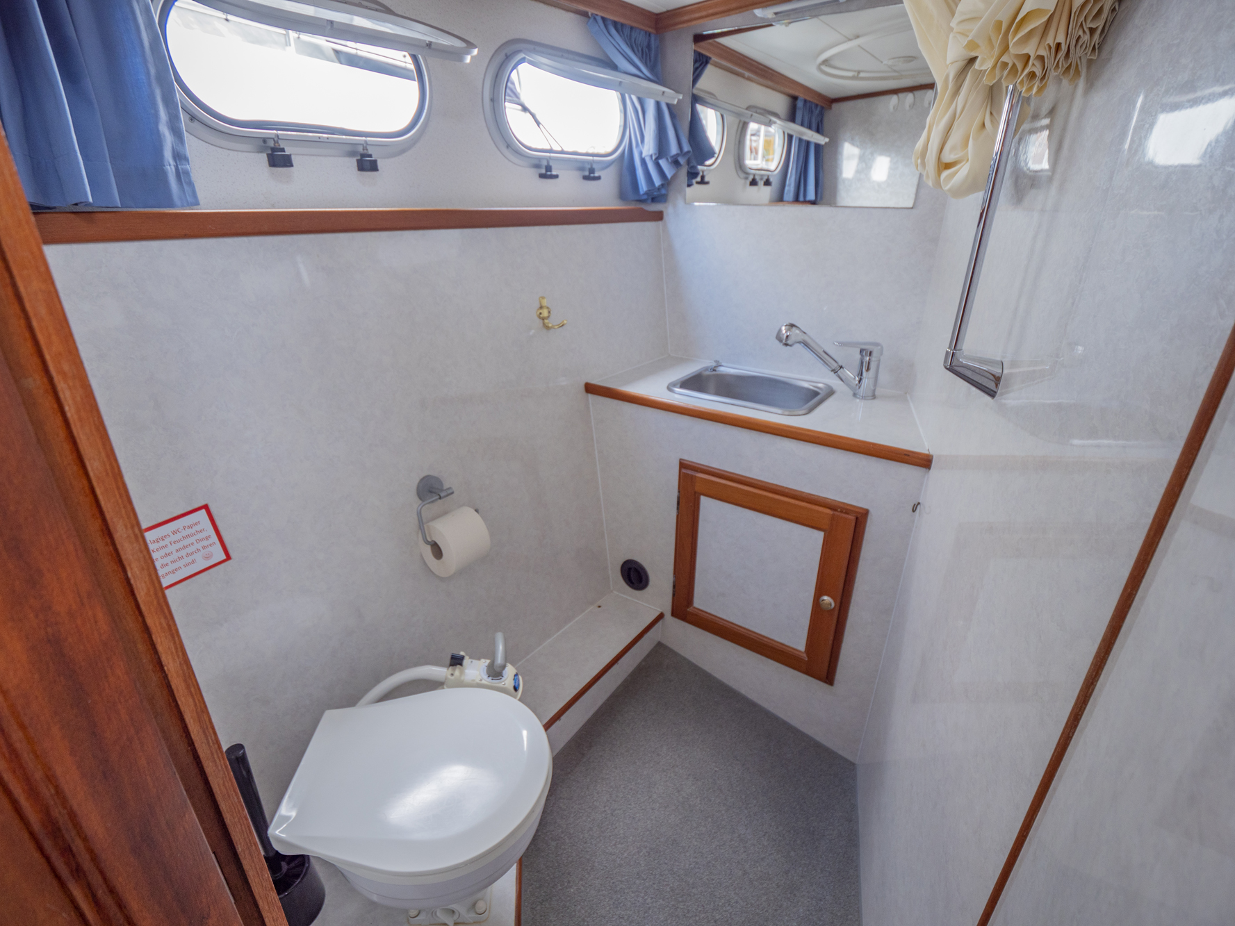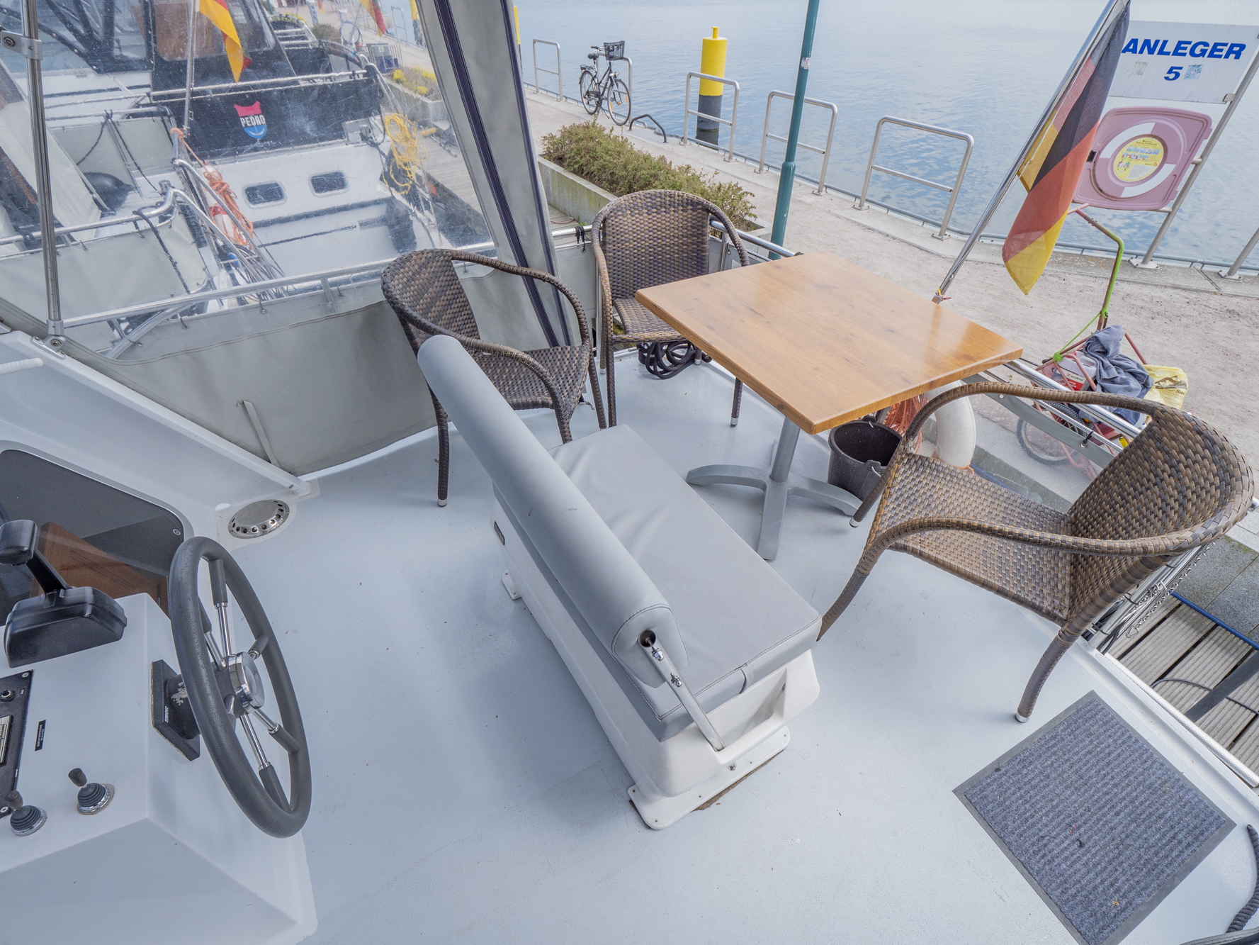 Vollständige Pantry mit mehrflammigem Kochfeld, 80 l Kühlschrank, Nasszelle mit Waschbecken, manu. WC und Dusche, SAT-TV, CD-Radio, Heizung; Echolot, Ruderstandsanzeige, komplett verschließbare Persenning, Bug- und Heckstrahlruder