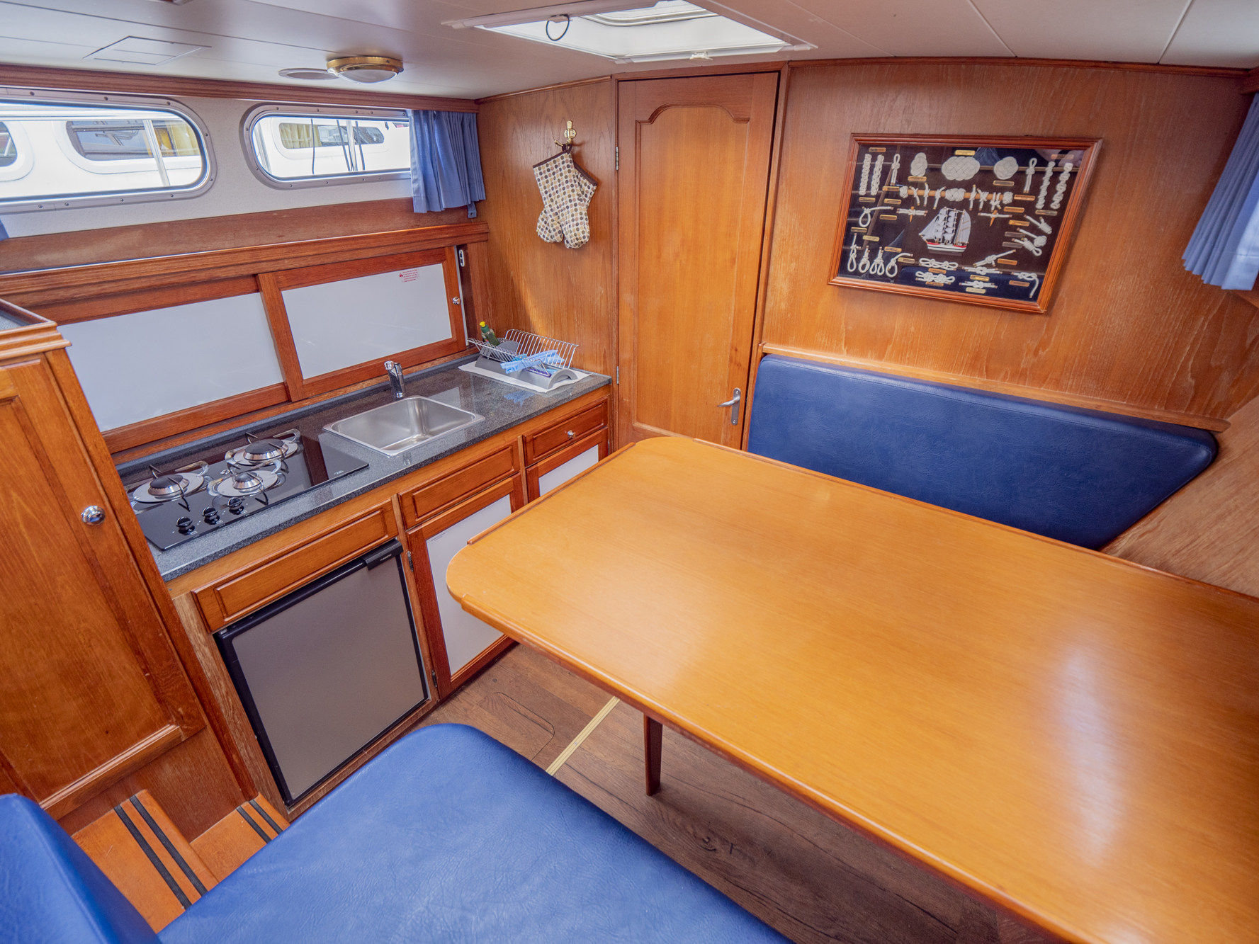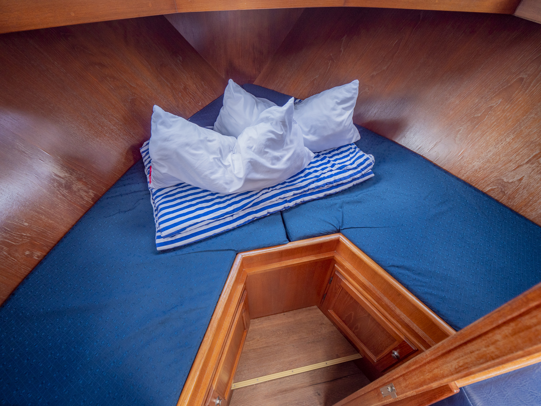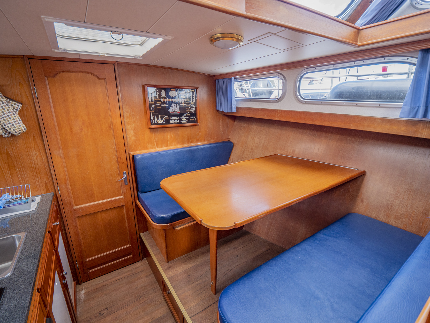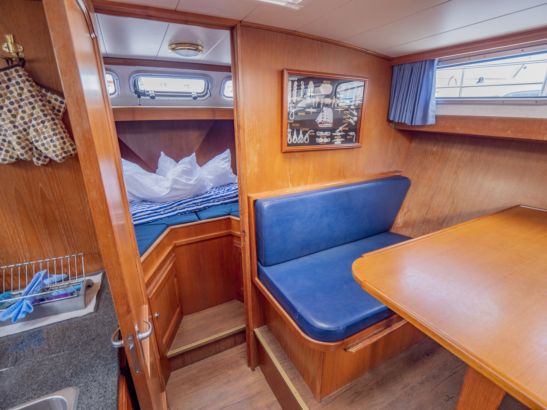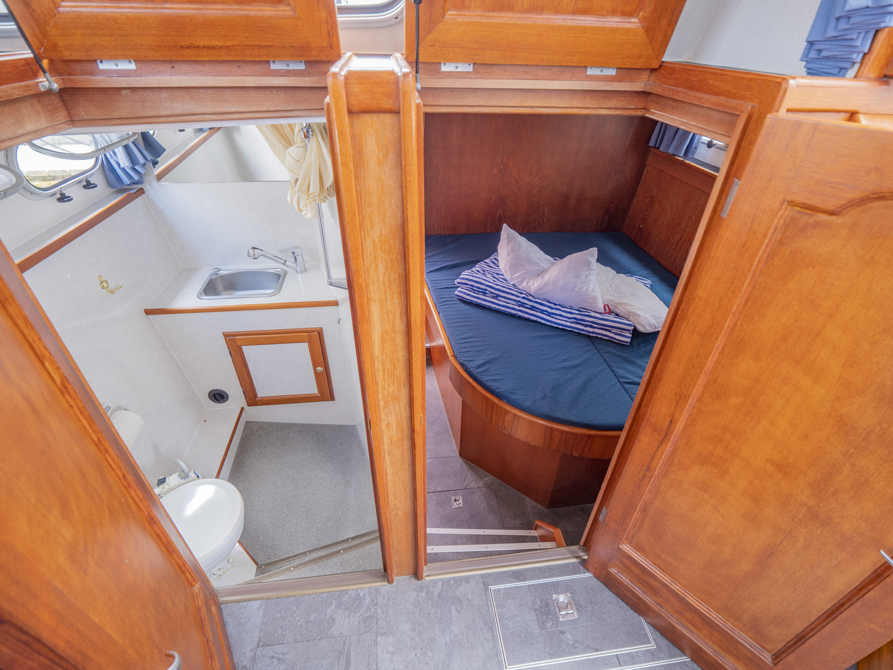 Dieses Boot bietet Platz für 4 Personen. Neben 4 festen Schlafplätzen können 2 Plätze in der Dinette umgebaut werden. Das Highlight ist das von beiden Seiten begehbare französische Bett in der Achterkabine, sowie der zentral vom Salon zugängliche Sanitärbereich.