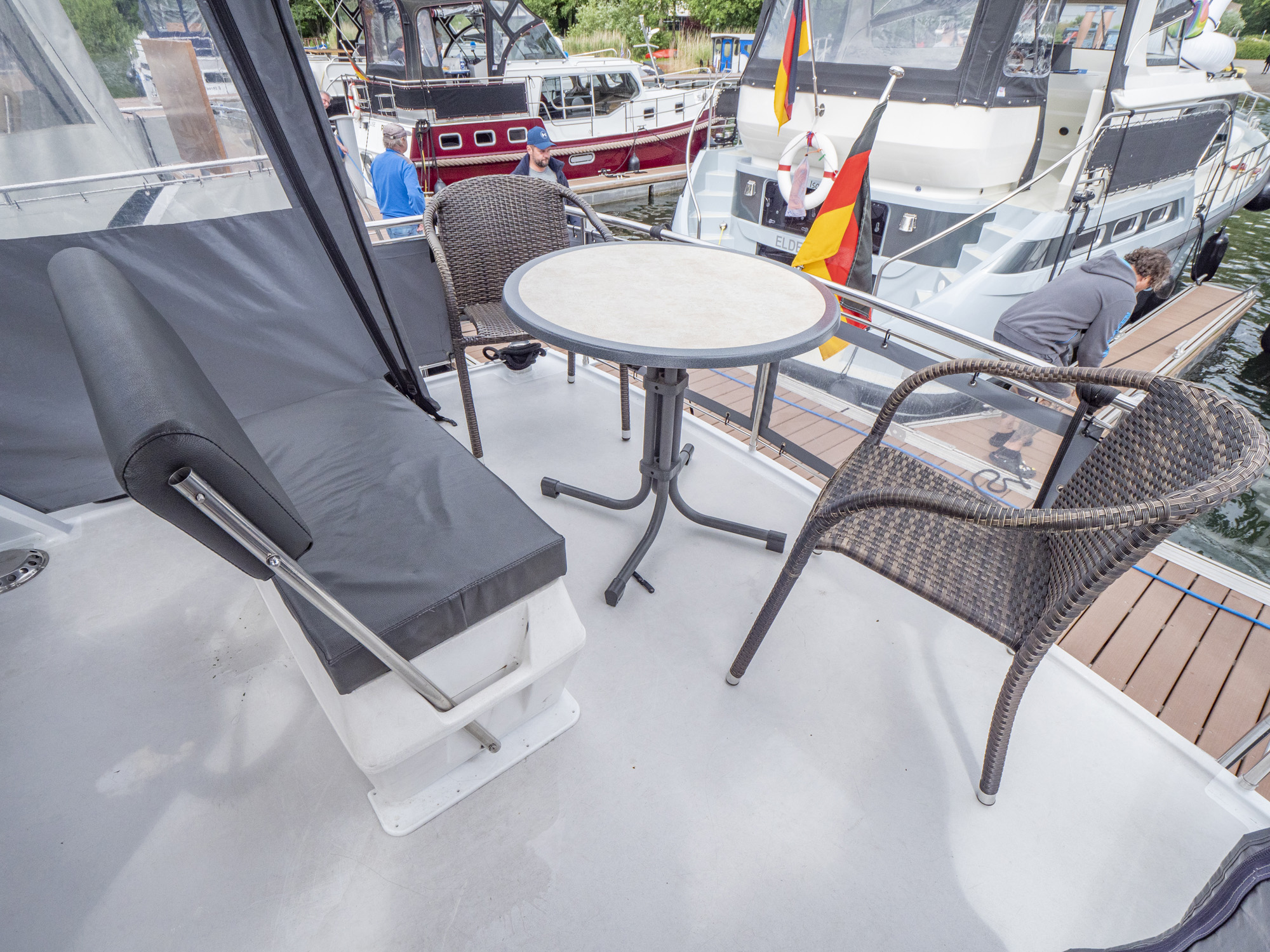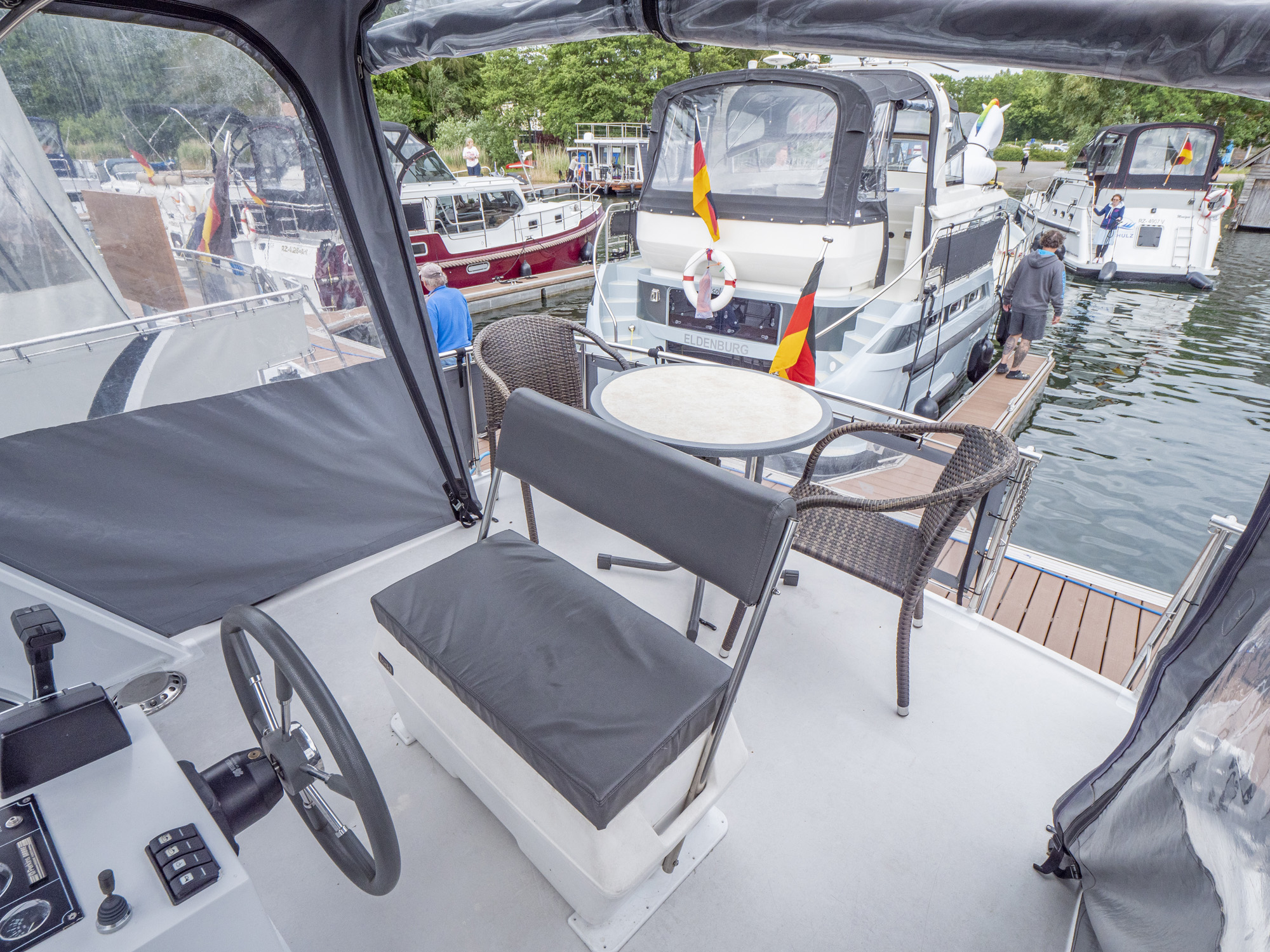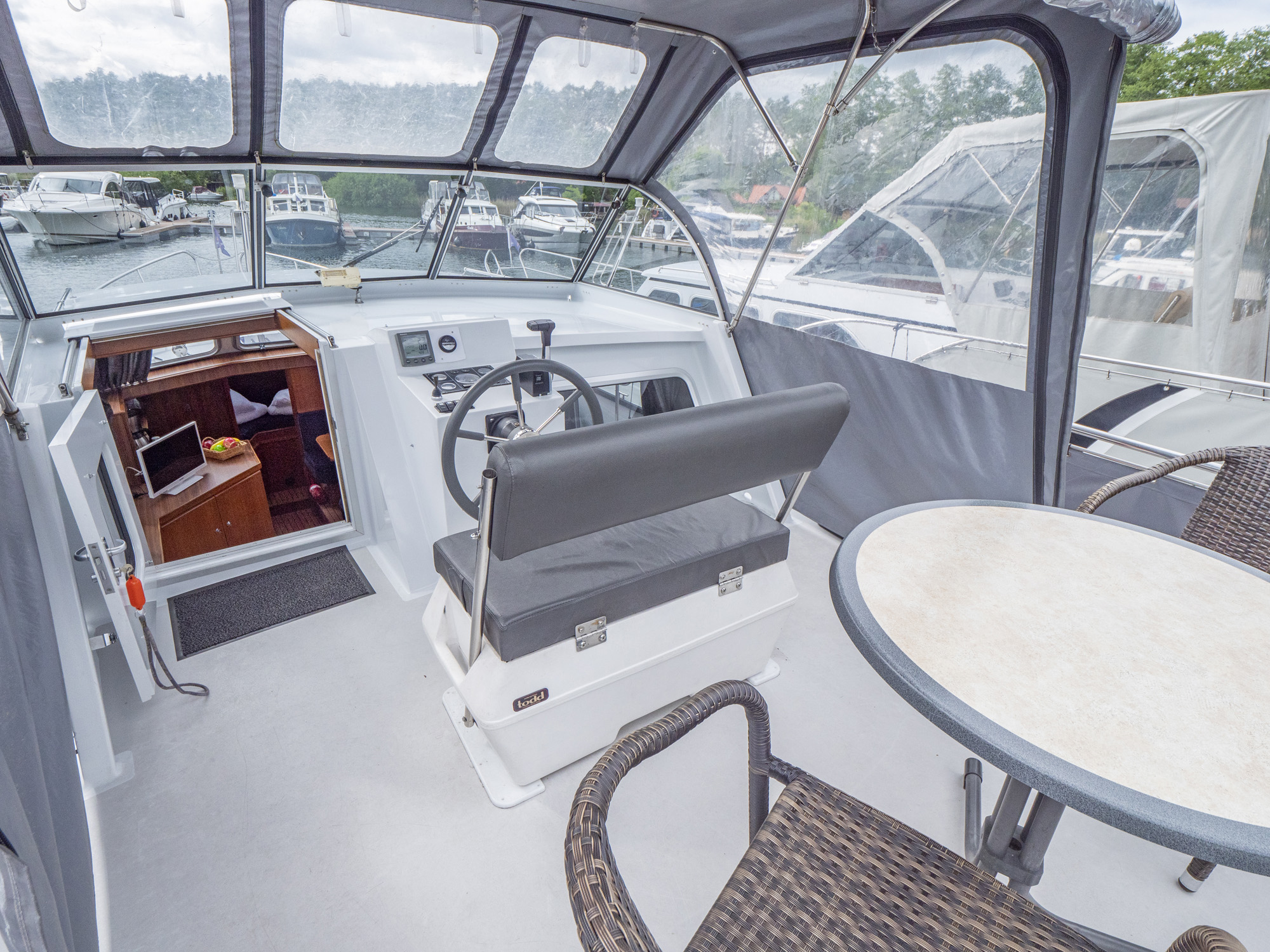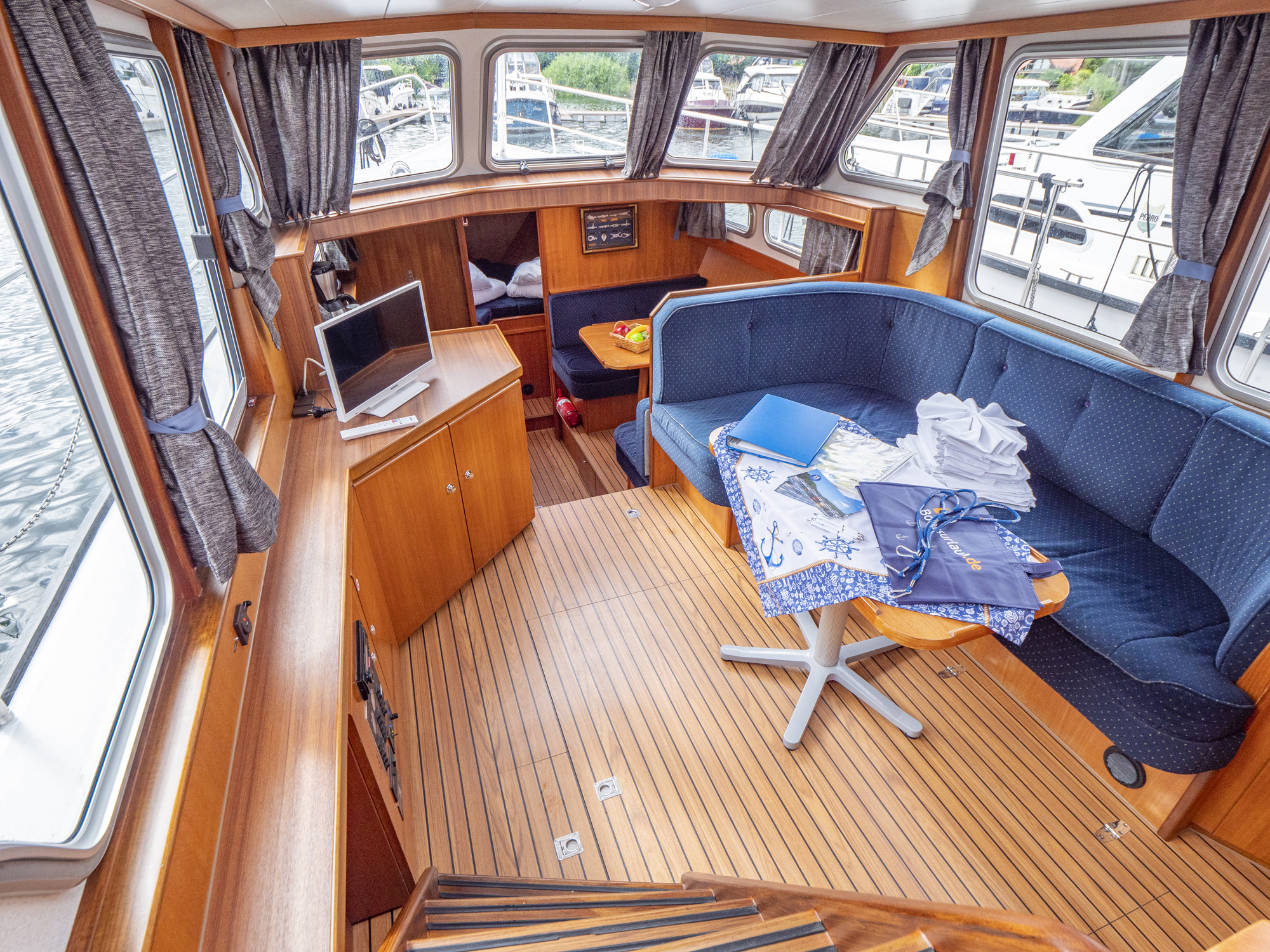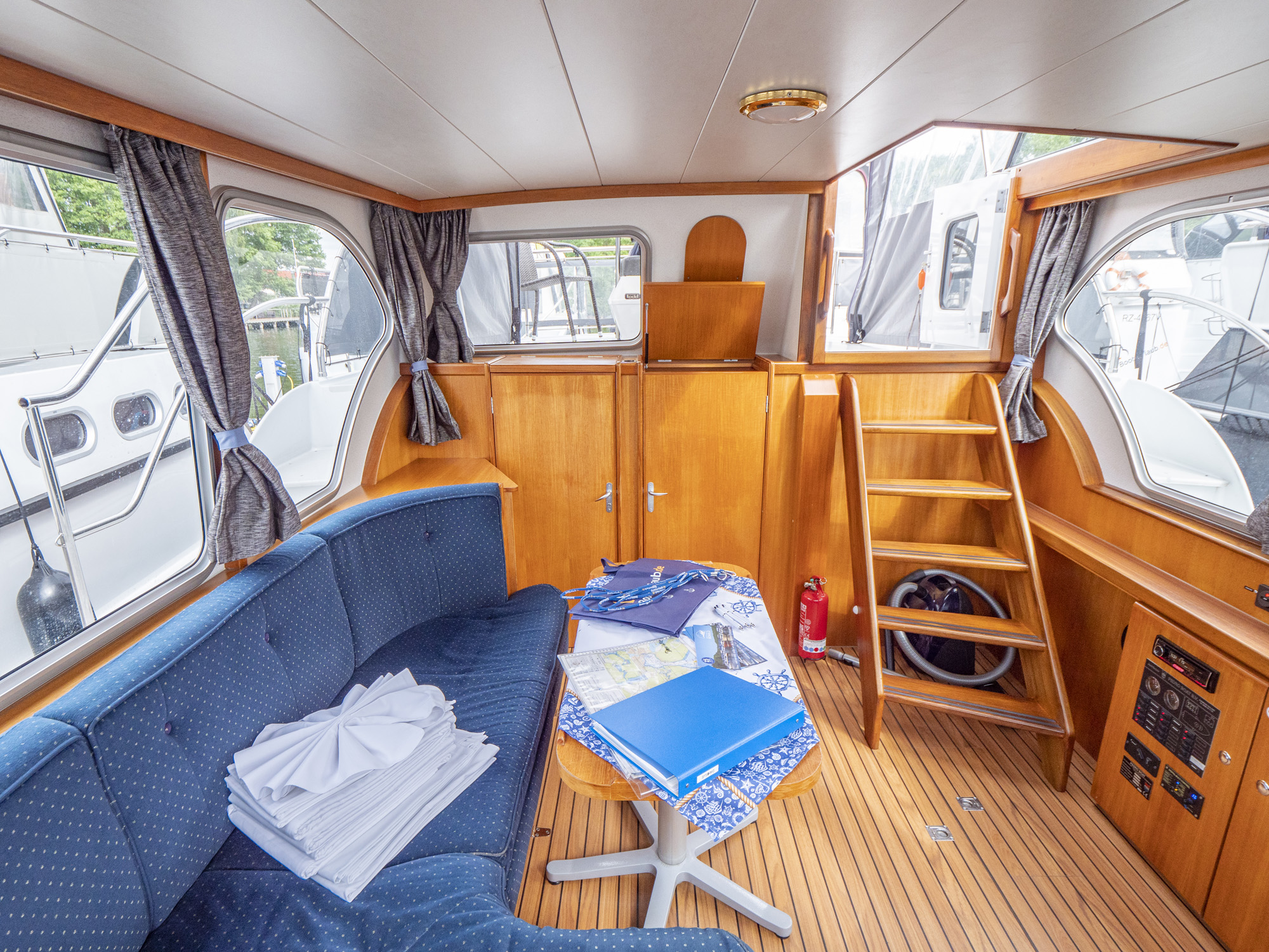 Vollständige Pantry mit mehrflammigem Kochfeld, 80 l Kühlschrank, Nasszelle mit Waschbecken, manu. WC und Dusche, SAT-TV, CD-Radio, Heizung; Echolot, Ruderstandsanzeige, komplett verschließbare Persenning, Bug- und Heckstrahlruder