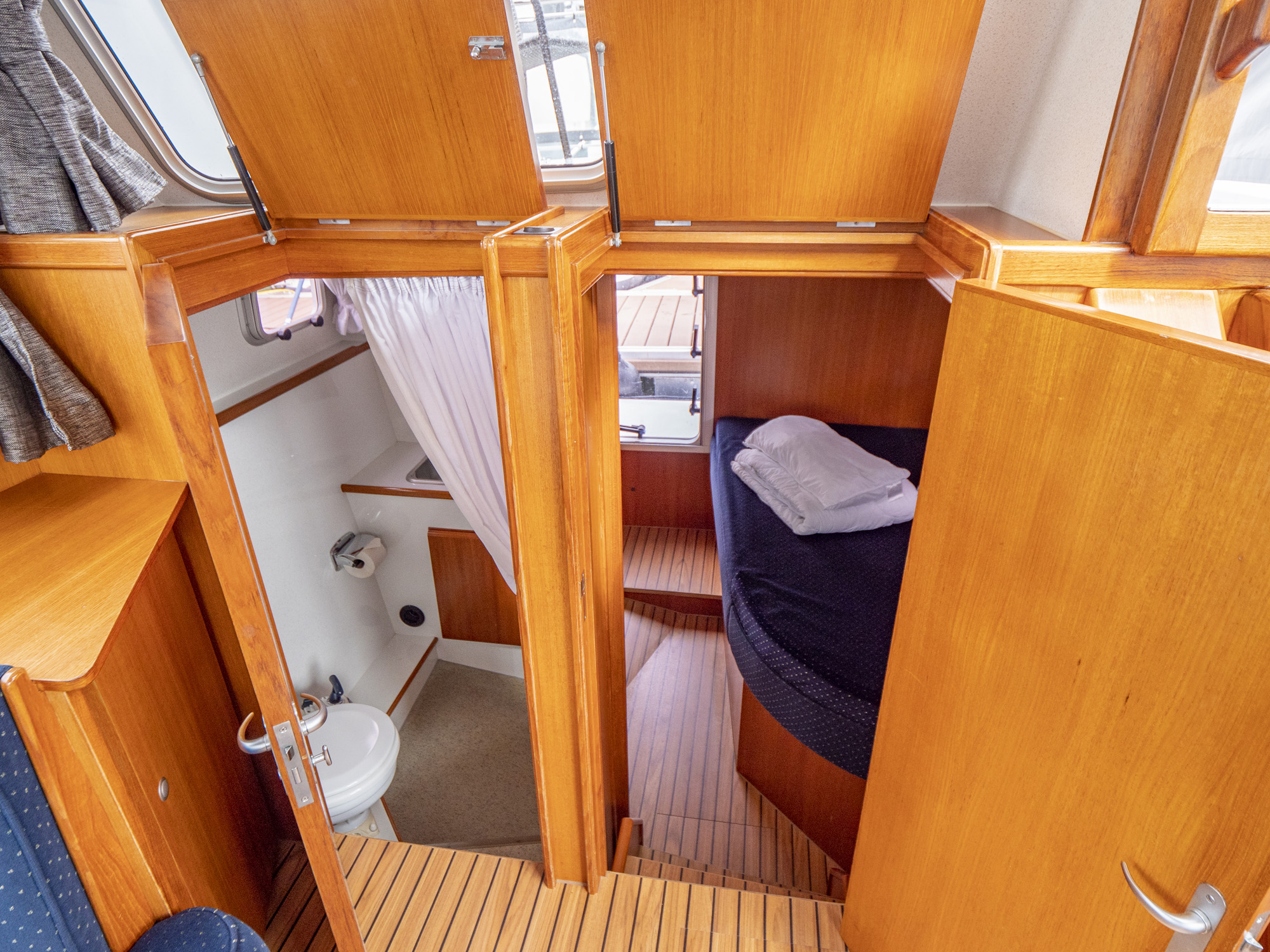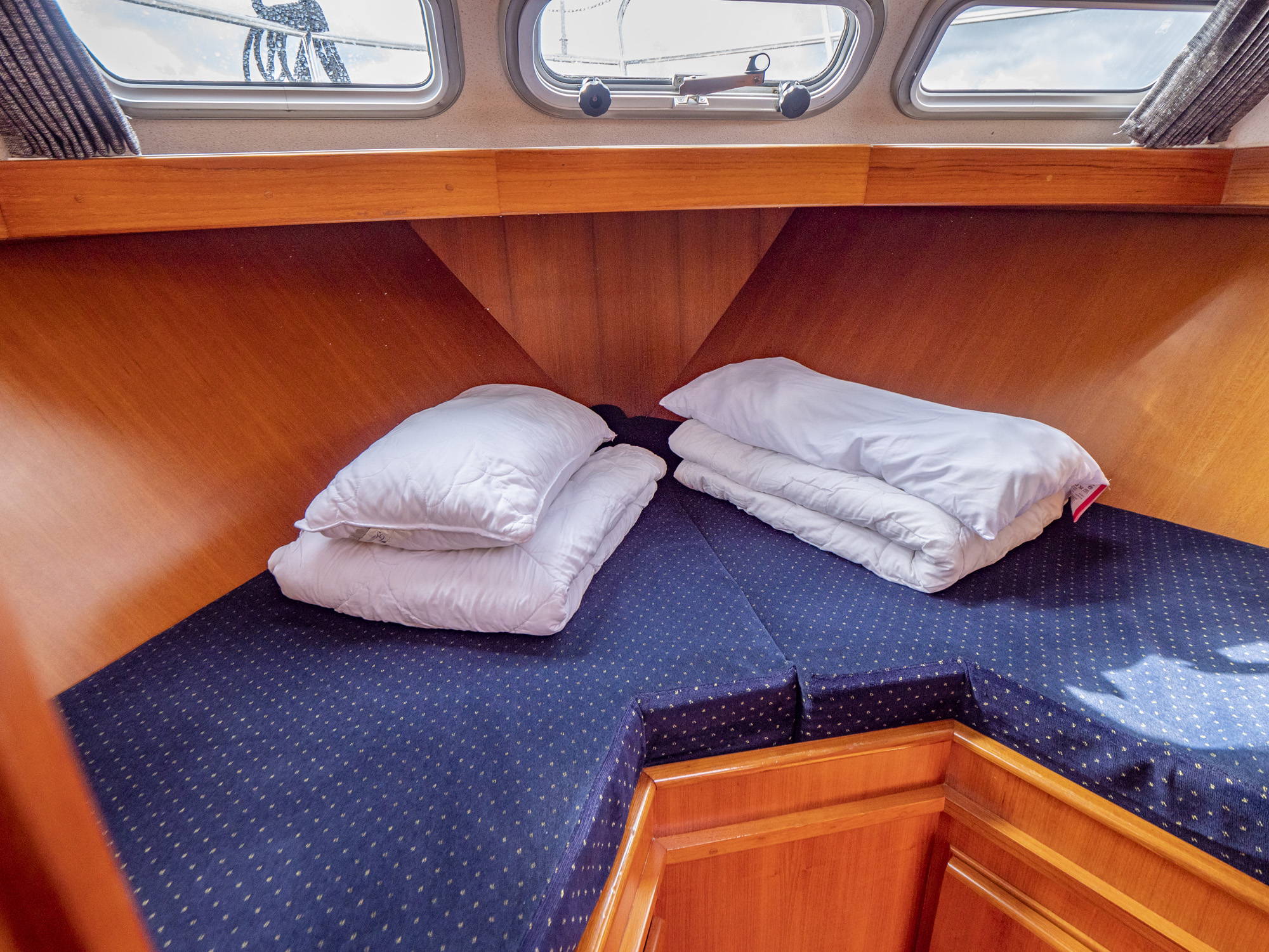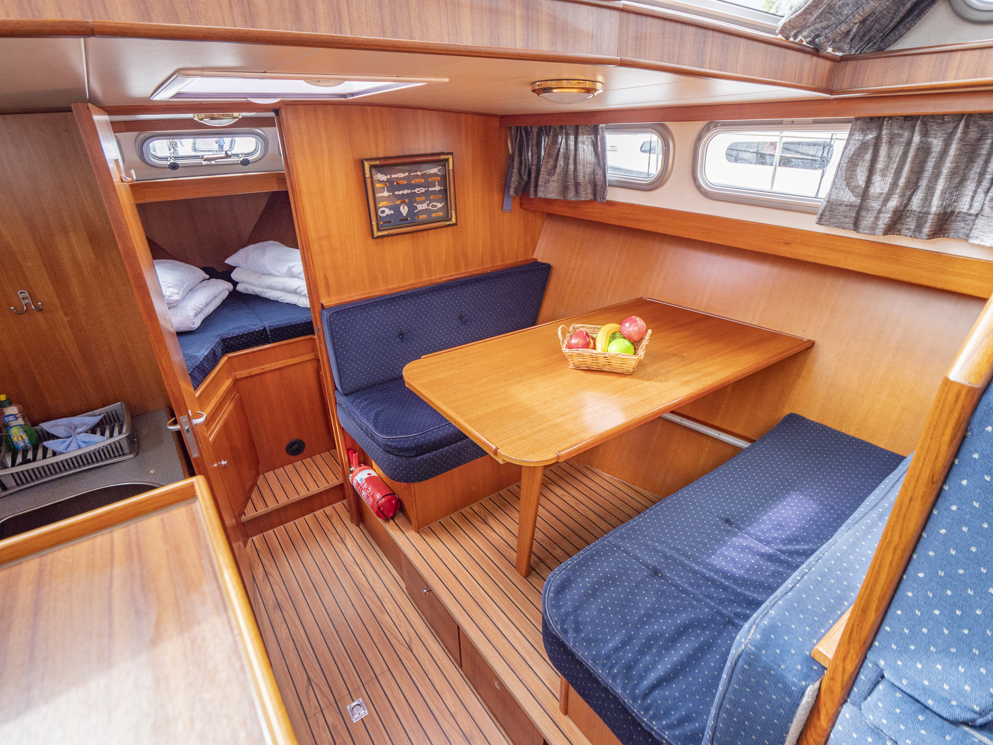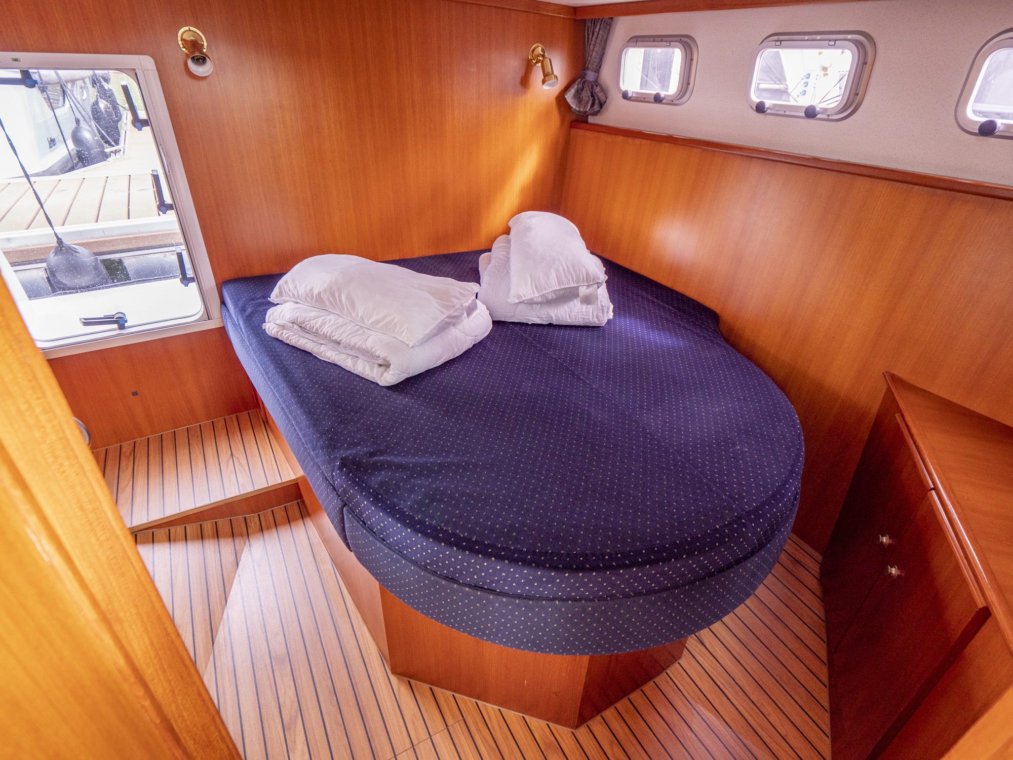Dieses Boot bietet Platz für 4 Personen. Neben 4 festen Schlafplätzen können 2 Plätze in der Dinette umgebaut werden. Das Highlight ist das von beiden Seiten begehbare französische Bett in der Achterkabine, sowie der zentral vom Salon zugängliche Sanitärbereich.