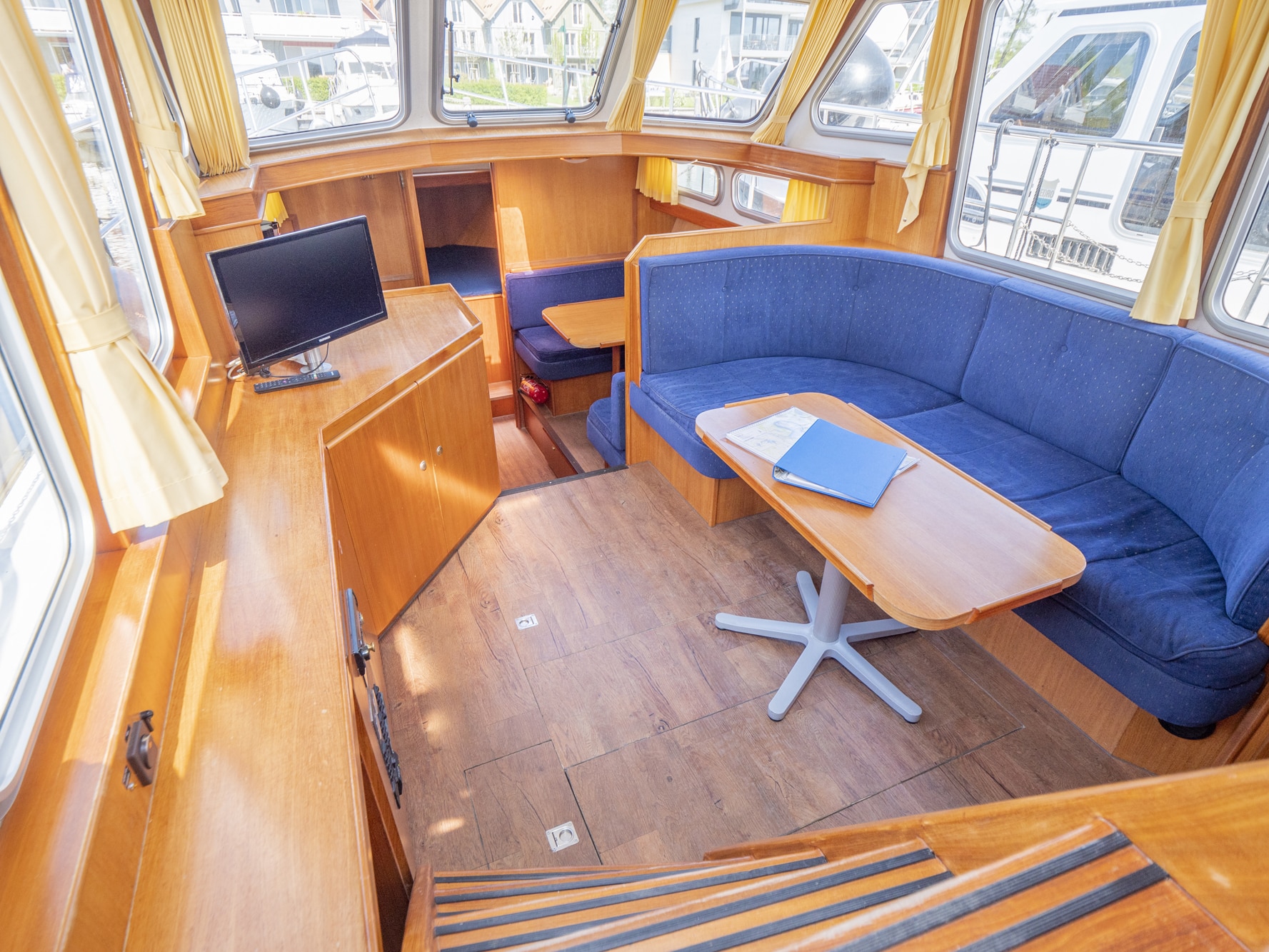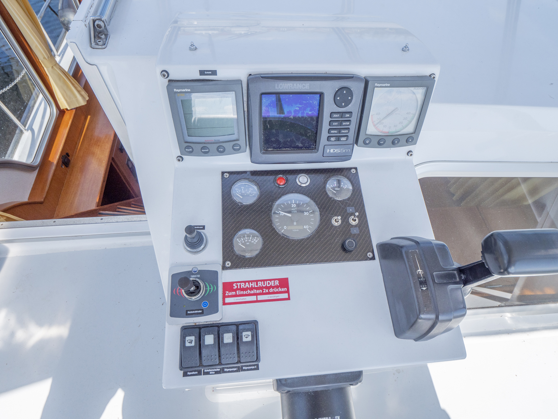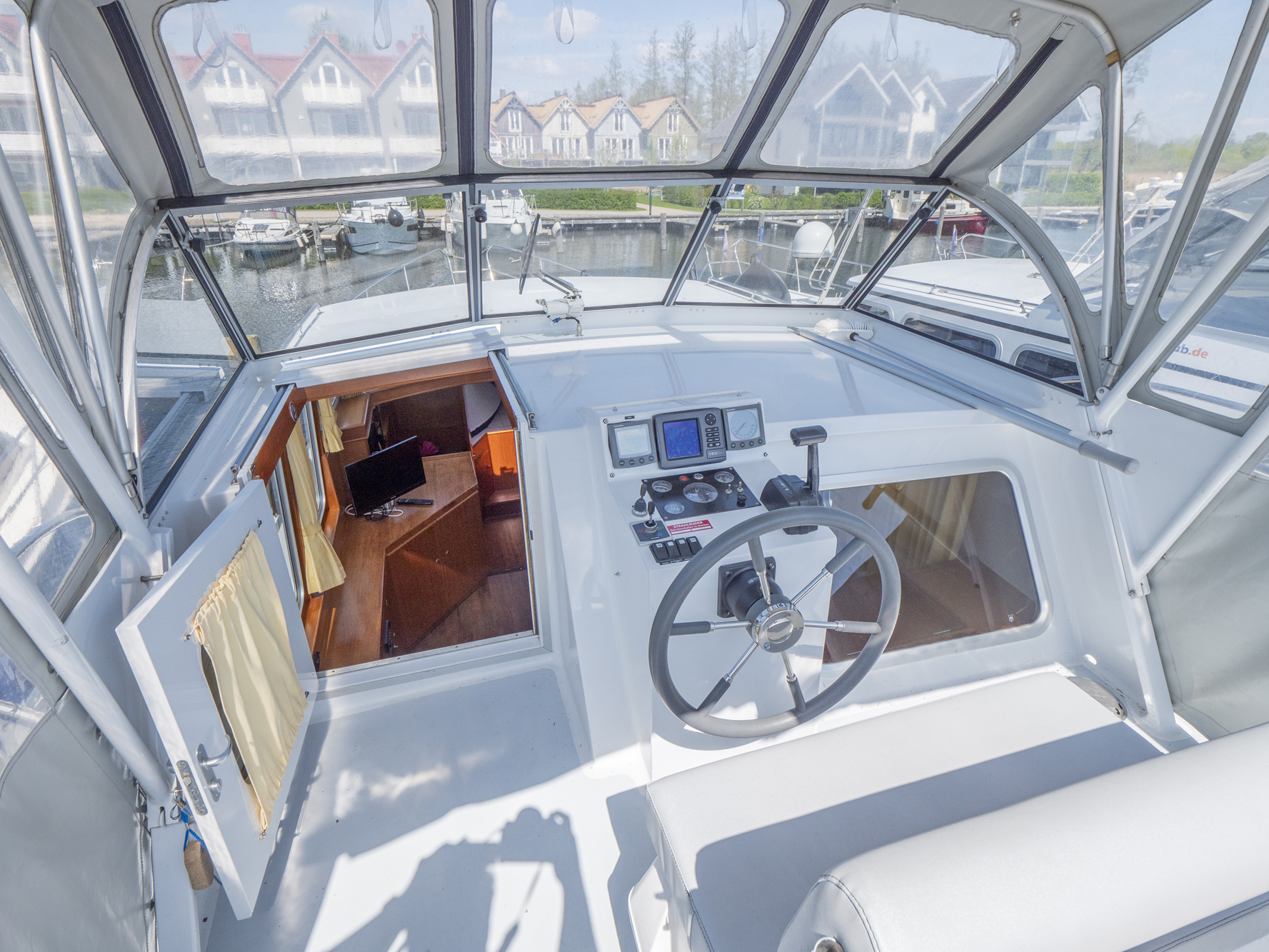 Vollständige Pantry mit mehrflammigem Kochfeld, 80 l Kühlschrank, Nasszelle mit Waschbecken, manu. WC und Dusche, SAT-TV, CD-Radio, Heizung; Echolot, Ruderstandsanzeige, komplett verschließbare Persenning, Bugstrahlruder