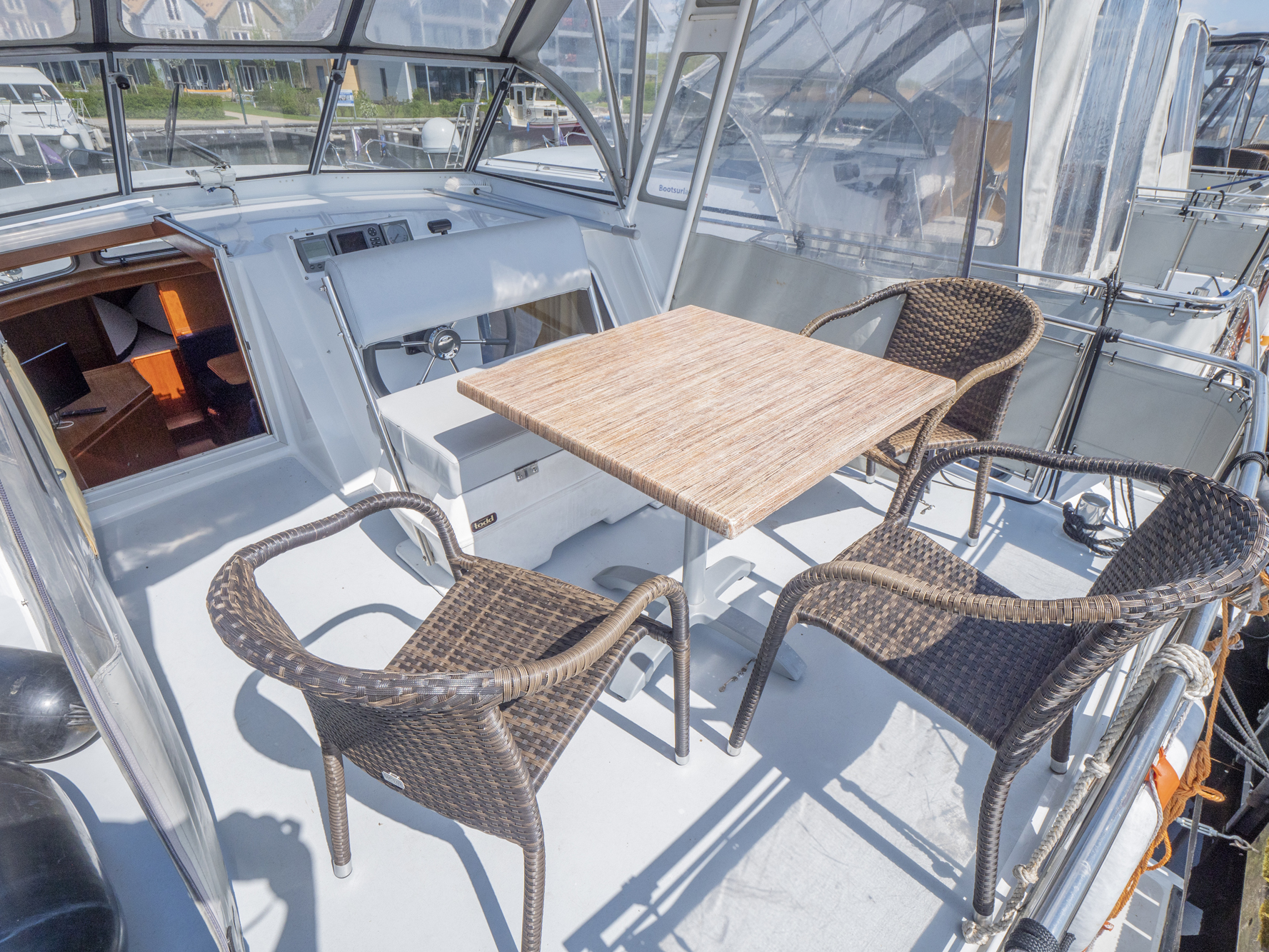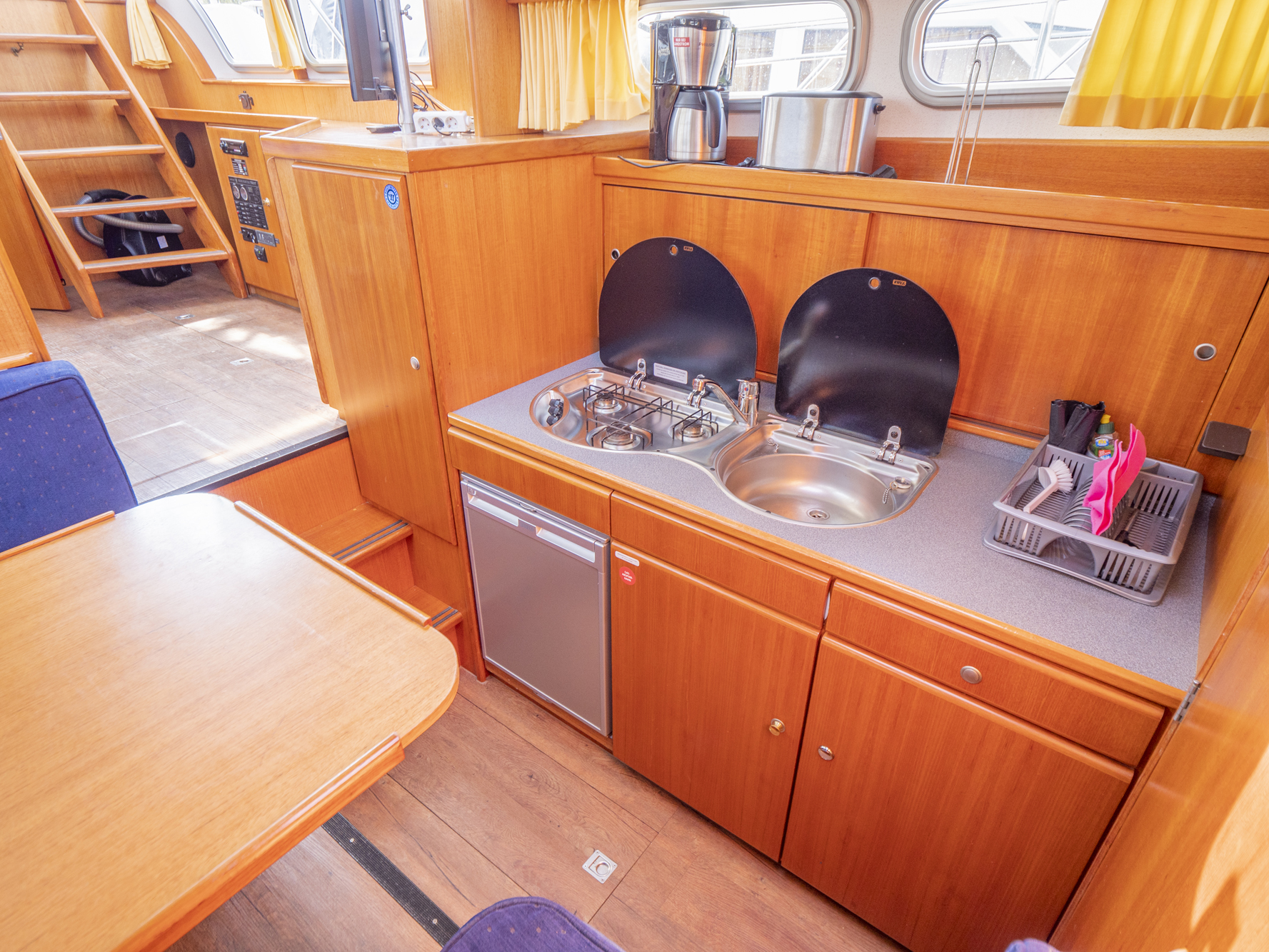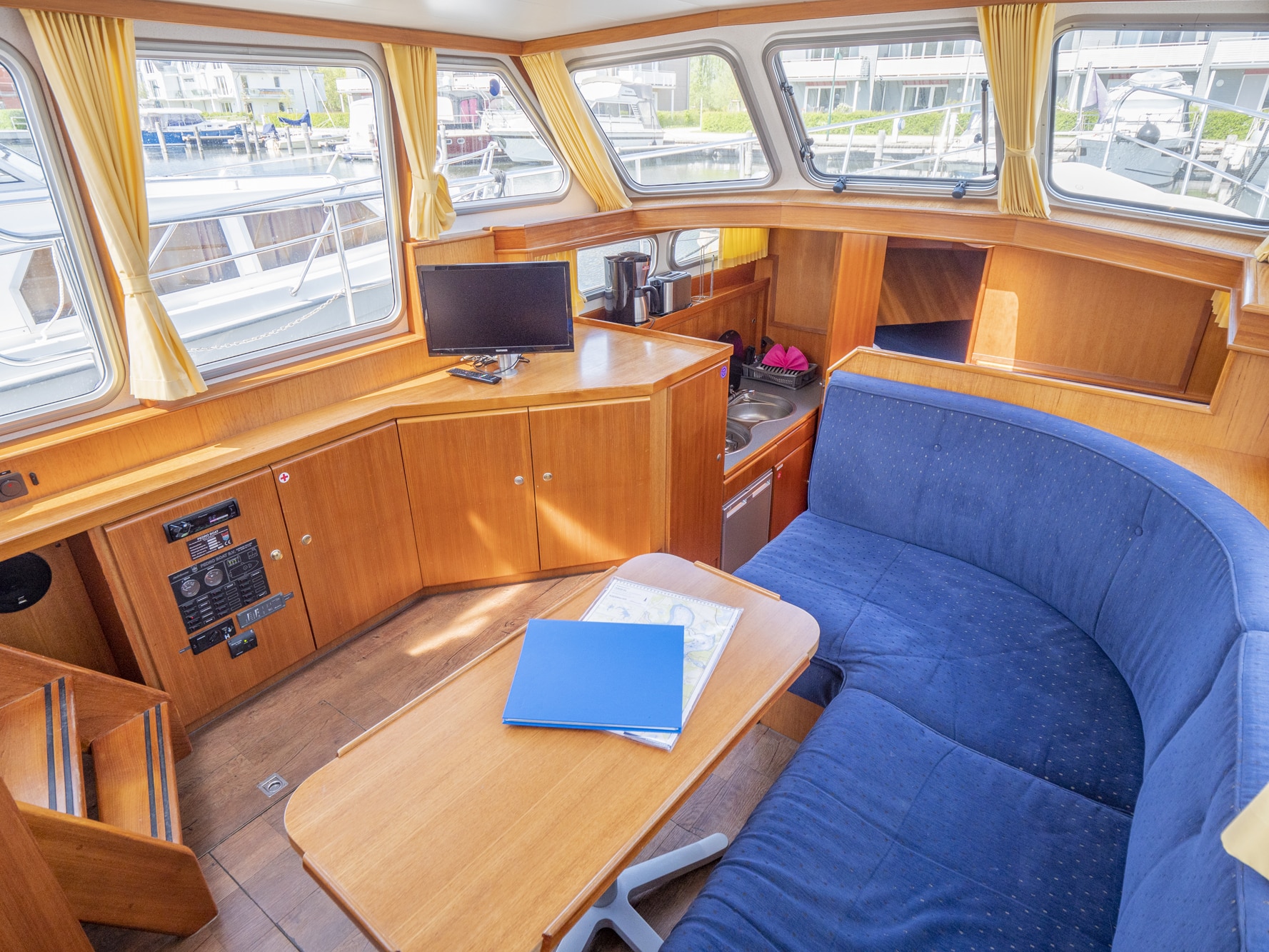 Vollständige Pantry mit mehrflammigem Kochfeld, 80 l Kühlschrank, Nasszelle mit Waschbecken, manu. WC und Dusche, SAT-TV, CD-Radio, Heizung; Echolot, Ruderstandsanzeige, komplett verschließbare Persenning, Bugstrahlruder