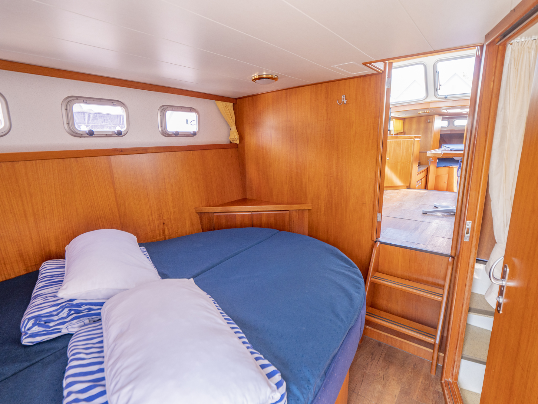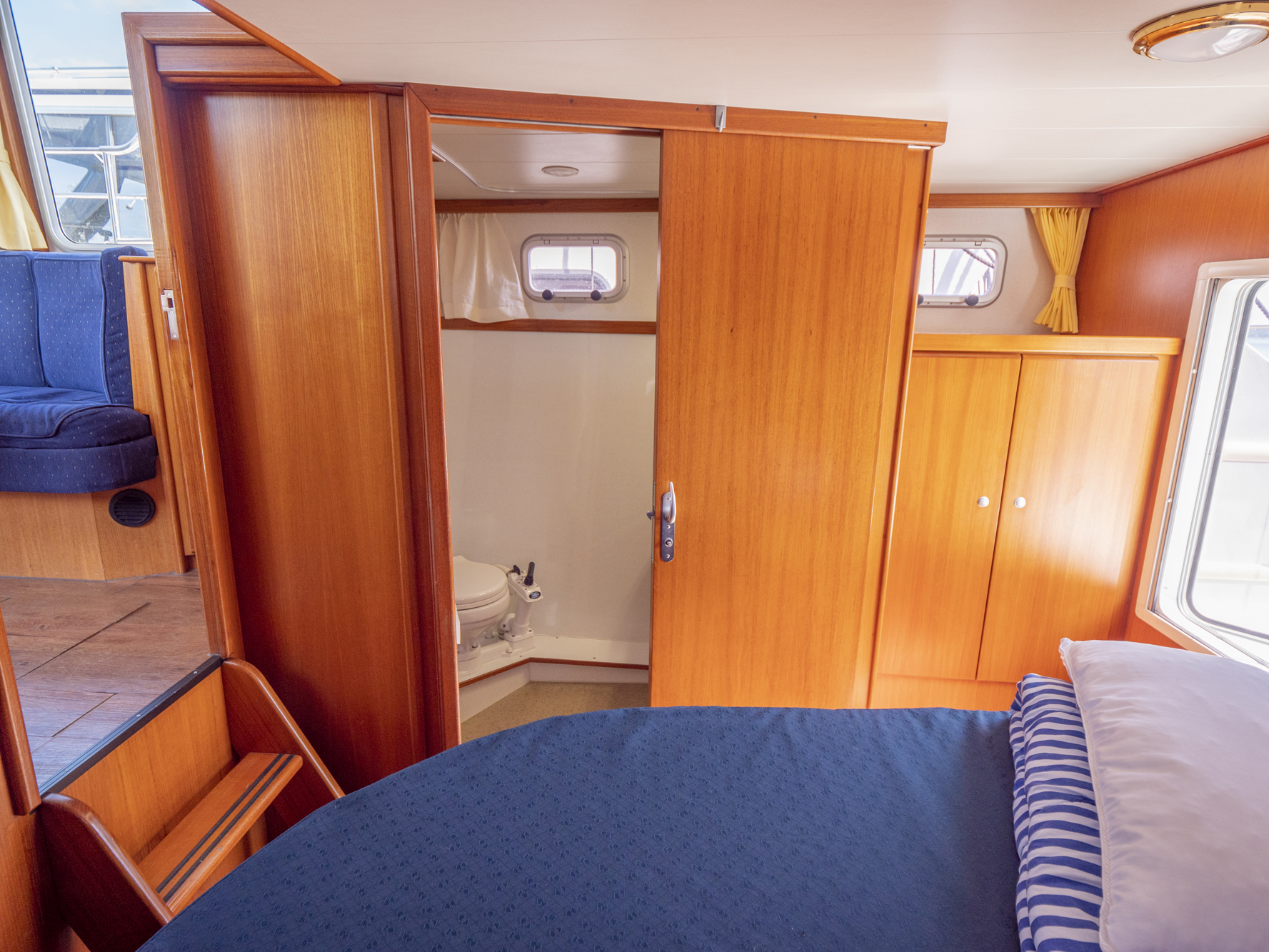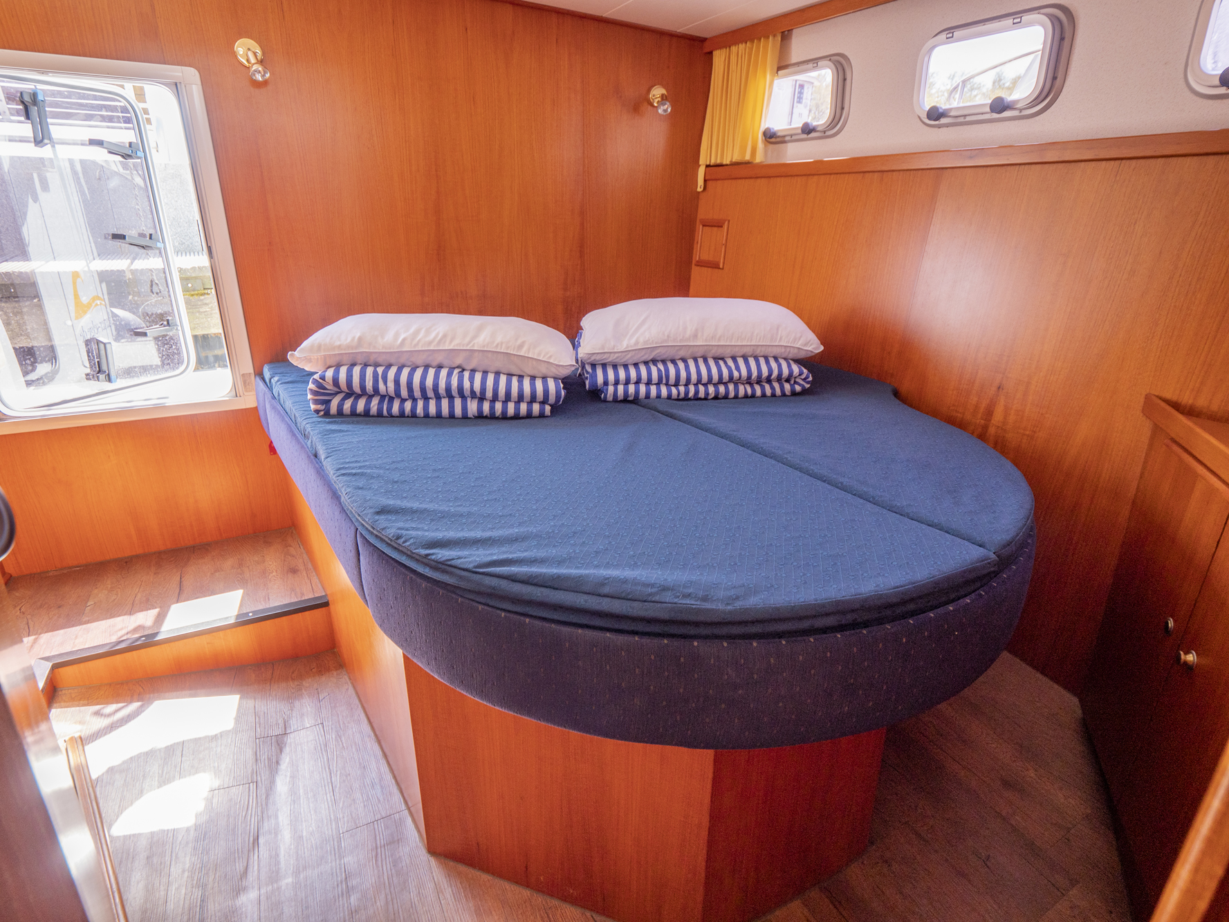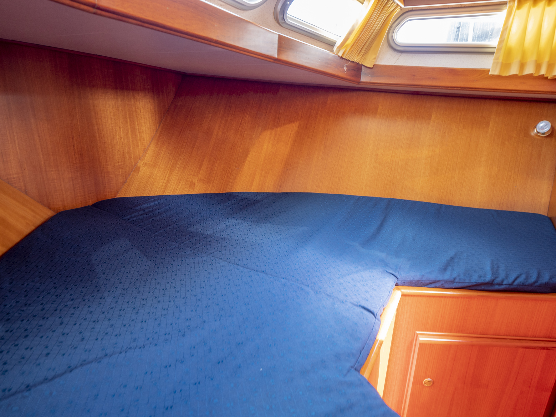 Dieses Boot bietet Platz für 6 Personen. Neben 4 festen Schlafplätzen können 2 Plätze in der Dinette umgebaut werden. Das Highlight ist das von beiden Seiten begehbare französische Bett in der Achterkabine, sowie der zentral vom Salon zugängliche Sanitärbereich.