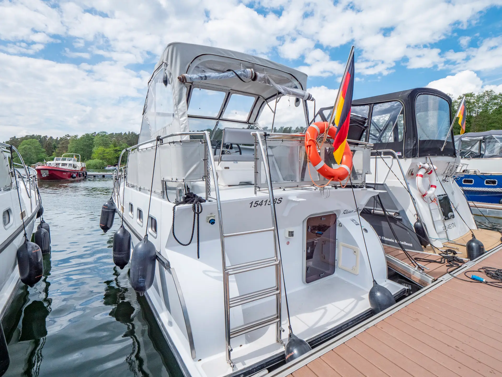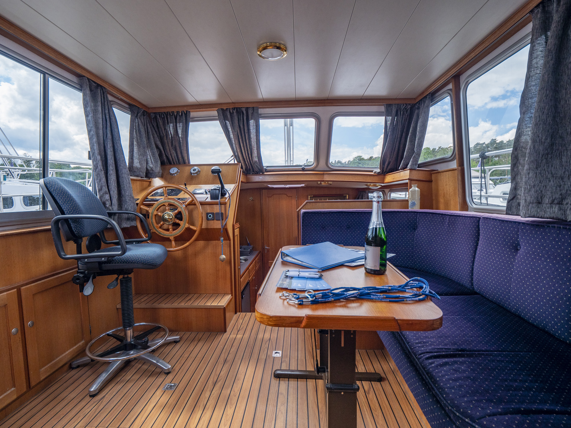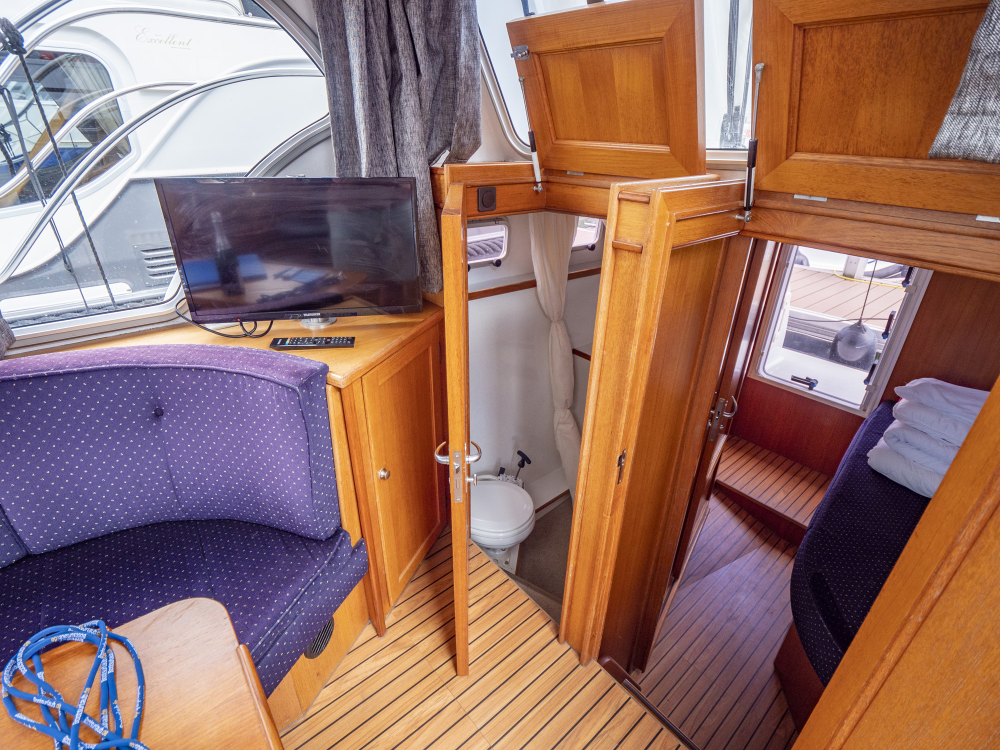 Ausstattung: vollständige Pantry mit mehrflammigem Kochfeld, 80 l Kühlschrank, Nasszelle mit Waschbecken, manu. WC und Dusche, Fernseher, DVBT-Anschluss, CD-Radio, Heizung, Echolot, Ruderstandsanzeige, komplett verschließbare Persenning, Bugstrahlruder, Innensteuerstand