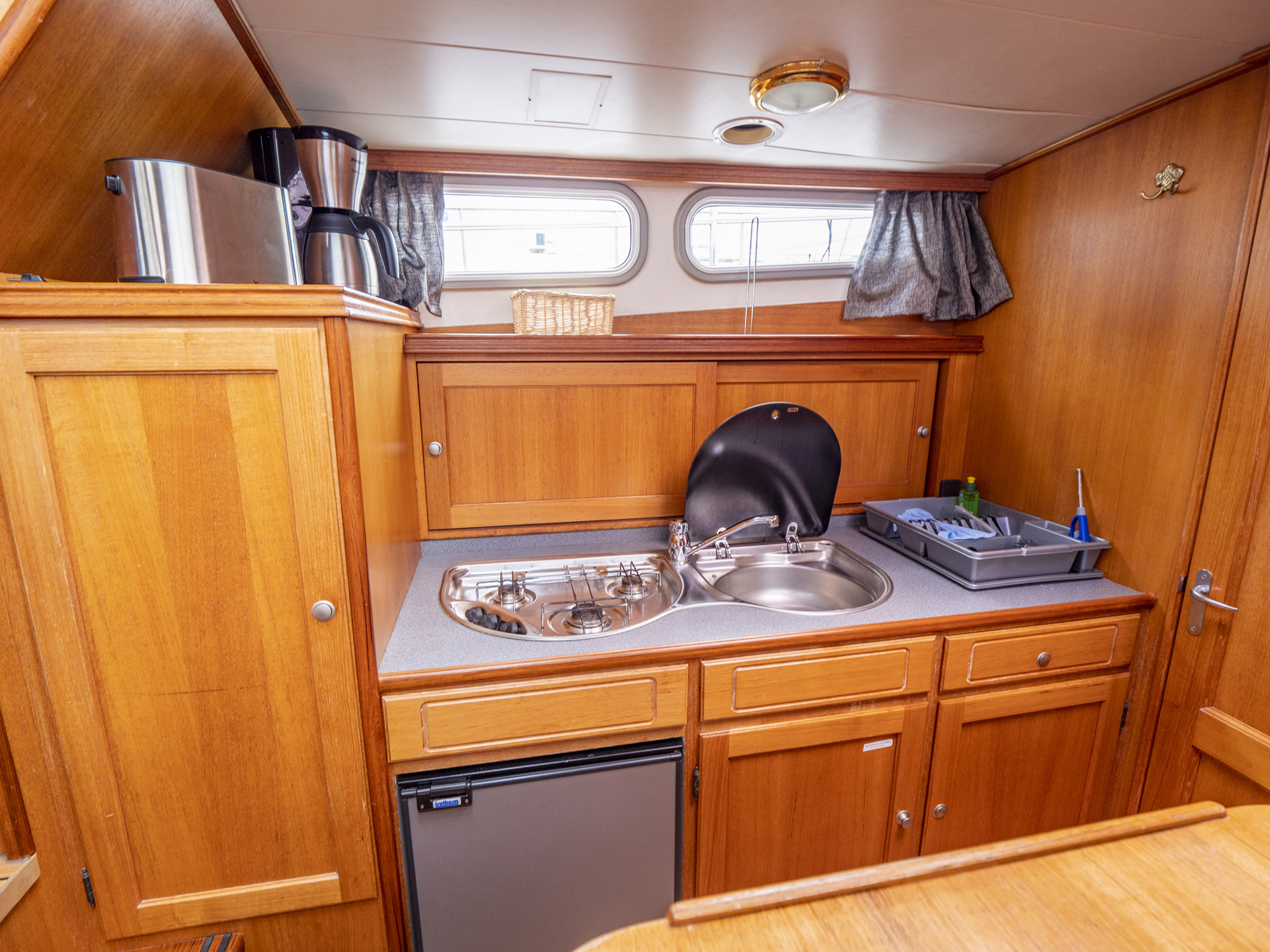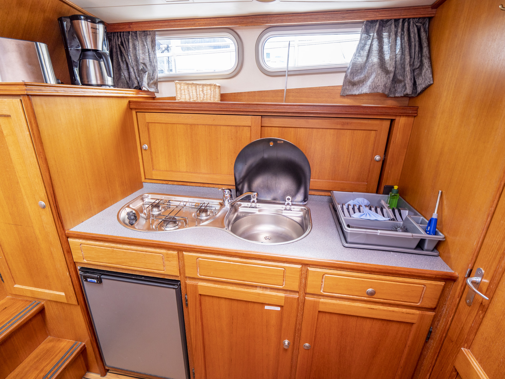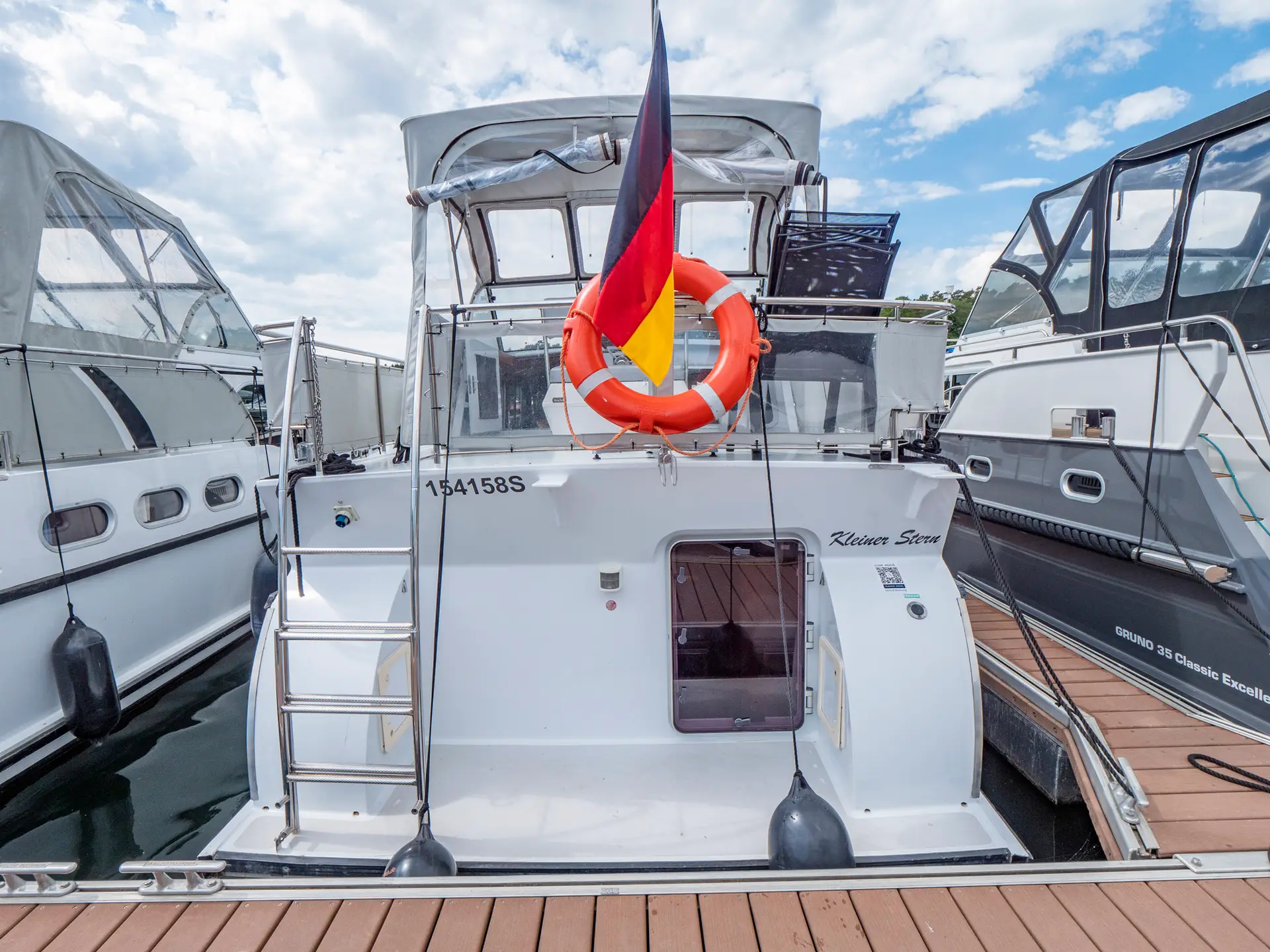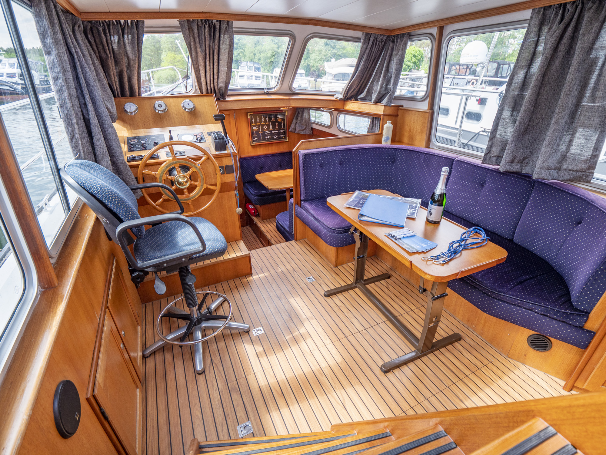 Ausstattung: vollständige Pantry mit mehrflammigem Kochfeld, 80 l Kühlschrank, Nasszelle mit Waschbecken, manu. WC und Dusche, Fernseher, DVBT-Anschluss, CD-Radio, Heizung, Echolot, Ruderstandsanzeige, komplett verschließbare Persenning, Bugstrahlruder, Innensteuerstand