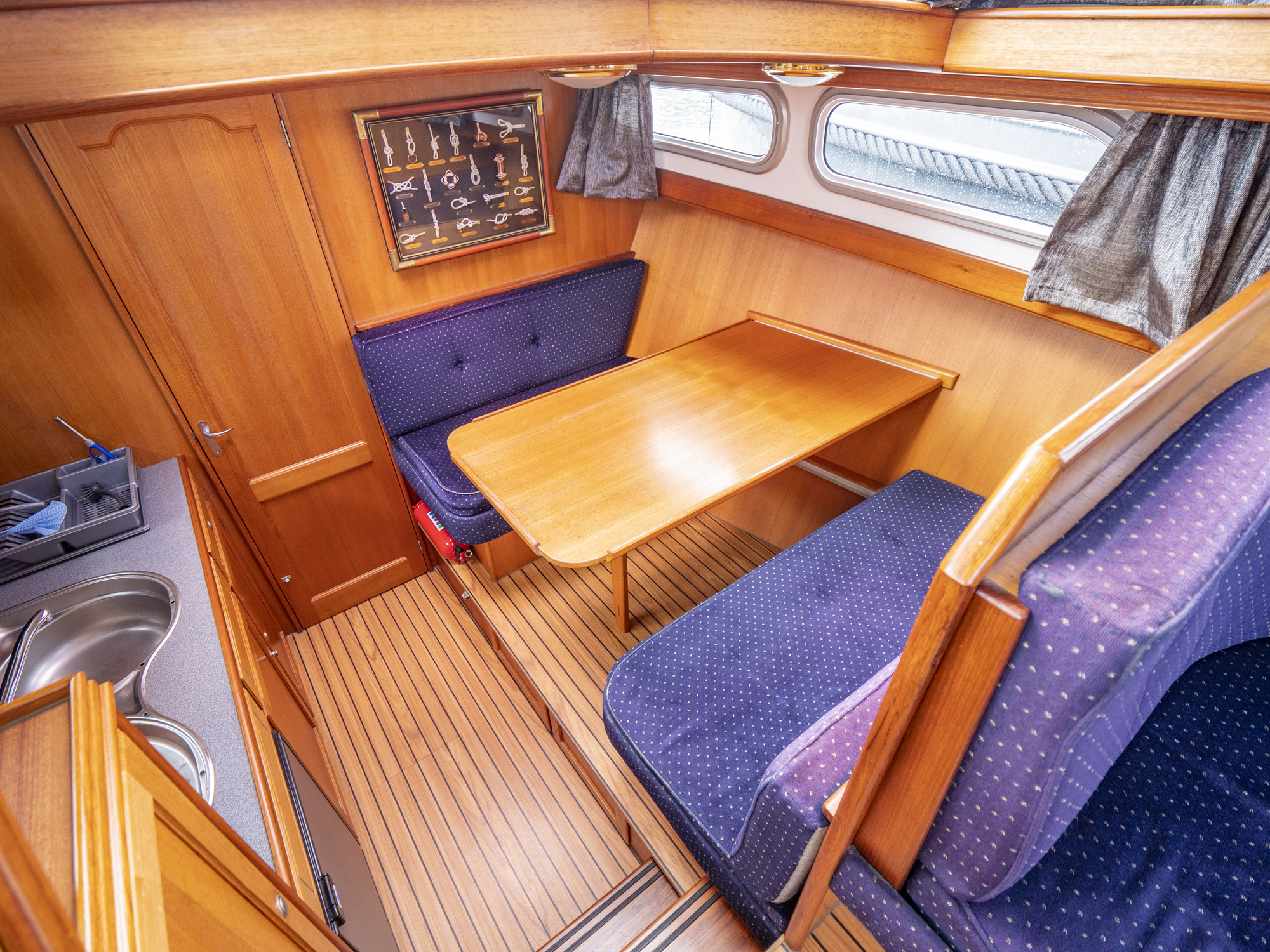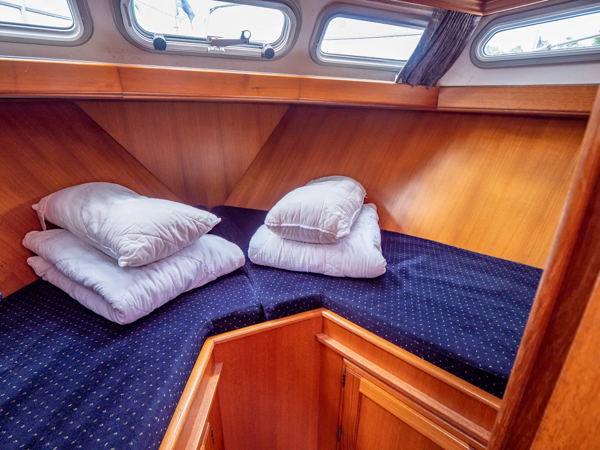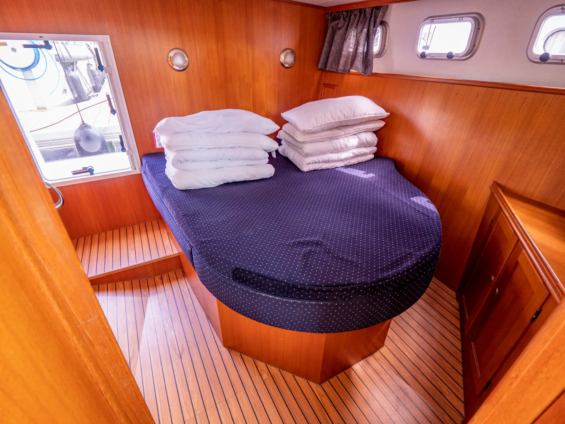 Dieses Boot bietet Platz für 4 Personen. Neben 4 festen Schlafplätzen können 2 Plätze in der Dinette umgebaut werden. Das Highlight ist das von beiden Seiten begehbare französische Bett in der Achterkabine, sowie der zentral vom Salon zugängliche Sanitärbereich.