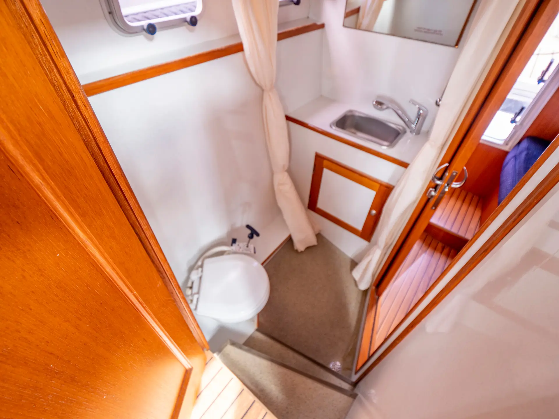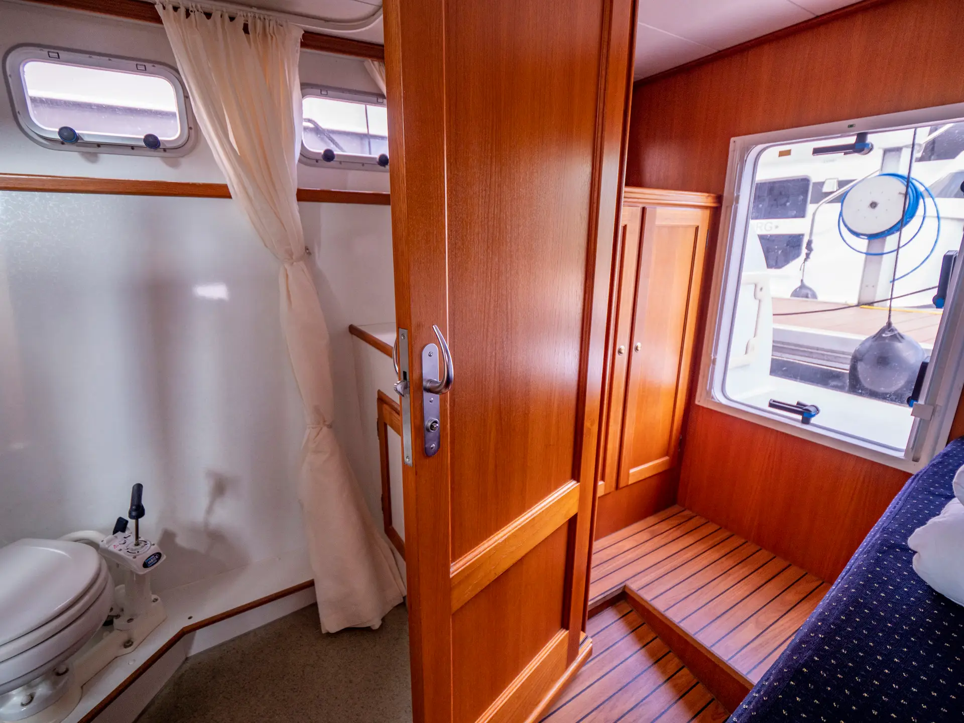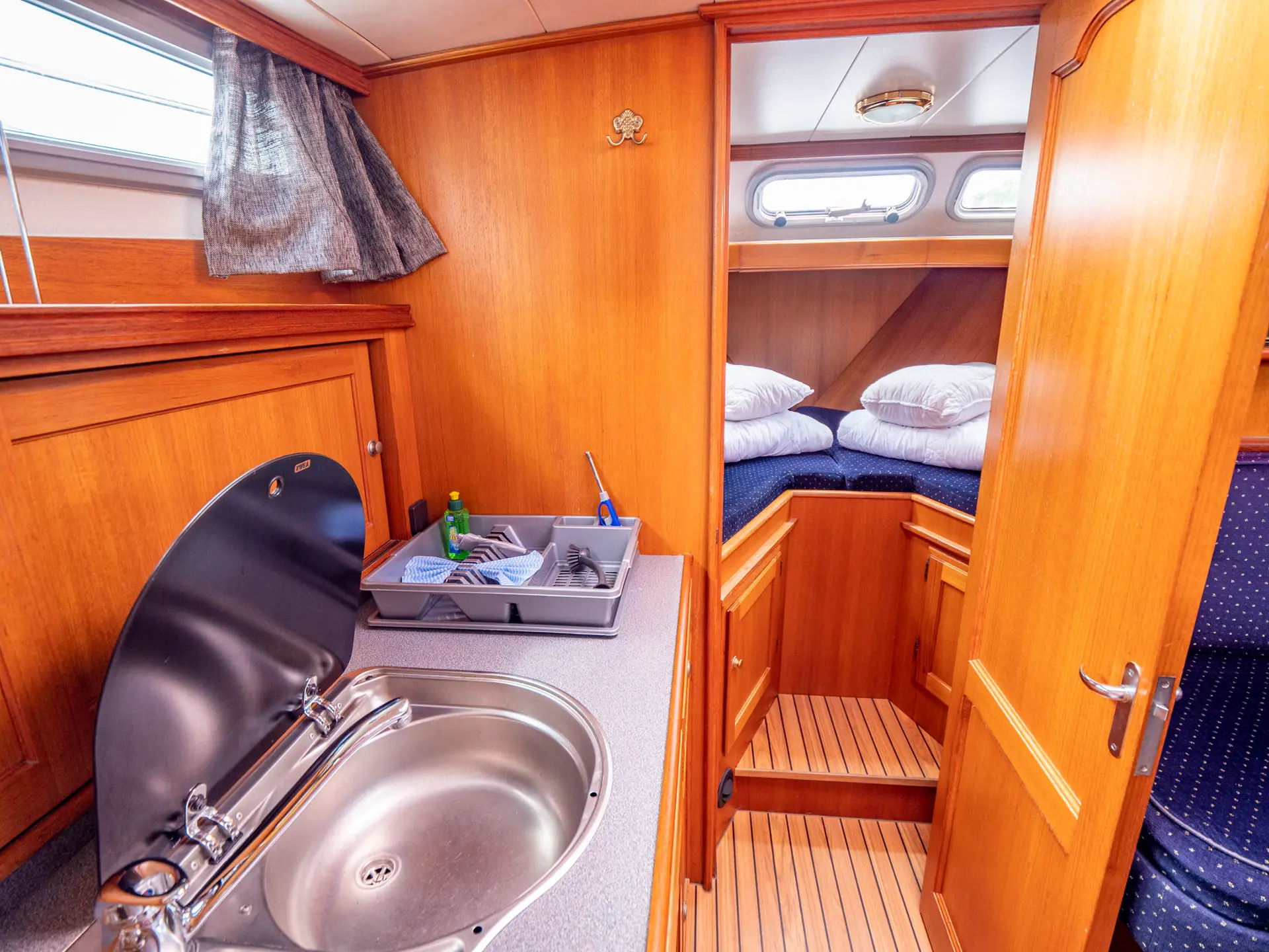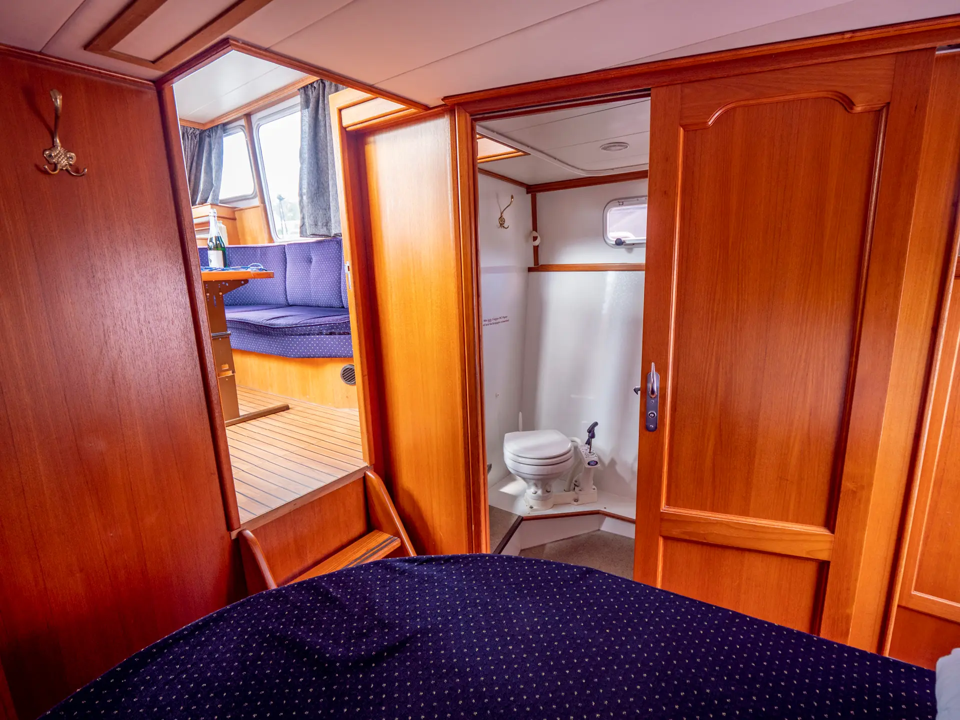 Dieses Boot bietet Platz für 4 Personen. Neben 4 festen Schlafplätzen können 2 Plätze in der Dinette umgebaut werden. Das Highlight ist das von beiden Seiten begehbare französische Bett in der Achterkabine, sowie der zentral vom Salon zugängliche Sanitärbereich.