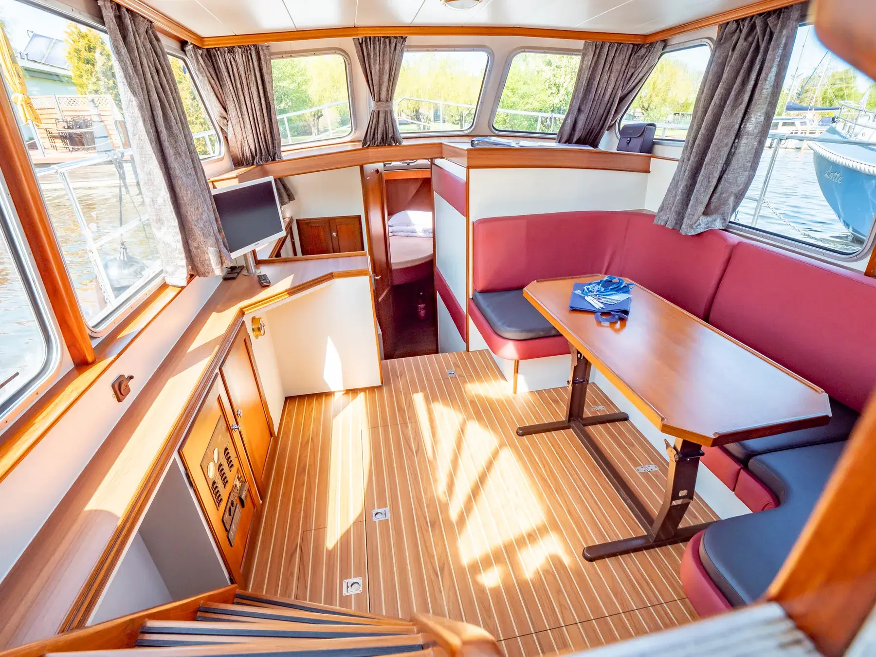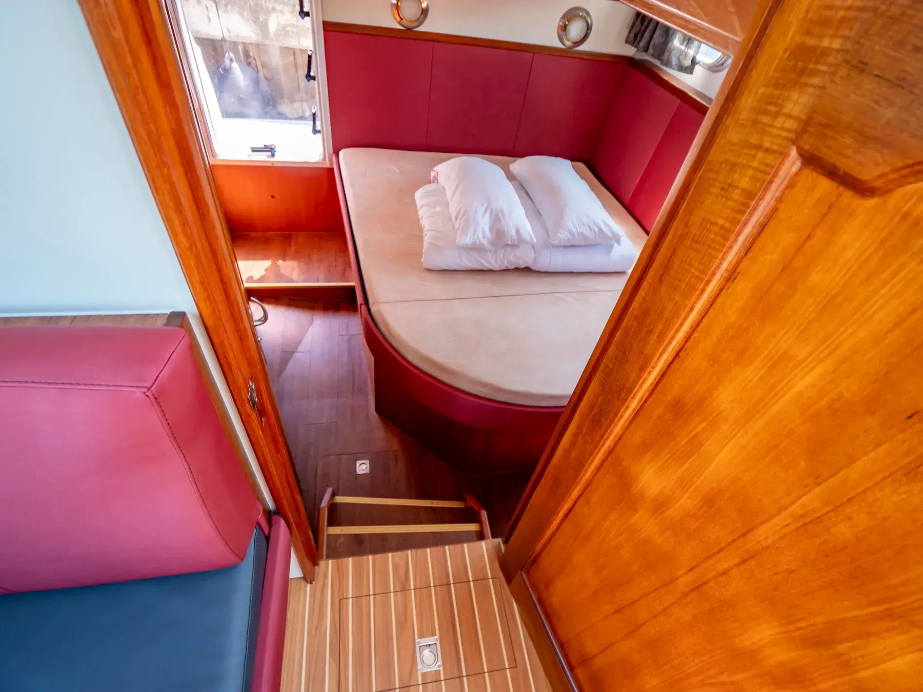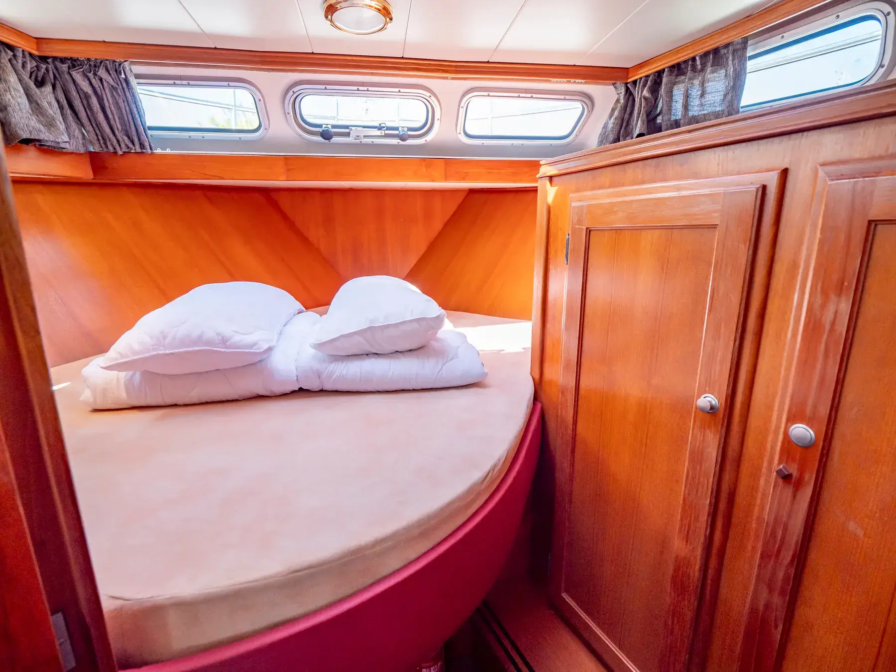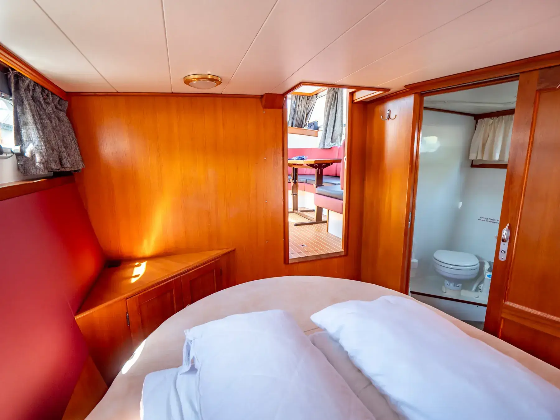 Dieses Boot bietet Platz für 4 Personen. Auch hier ist das Besondere das von beiden Seiten begehbare französische Bett und das große Fenster in der Achterkabine, Der Bootstyp bietet eine 2. Naßzelle mit Dusche und WC in der Vorderkoje.
