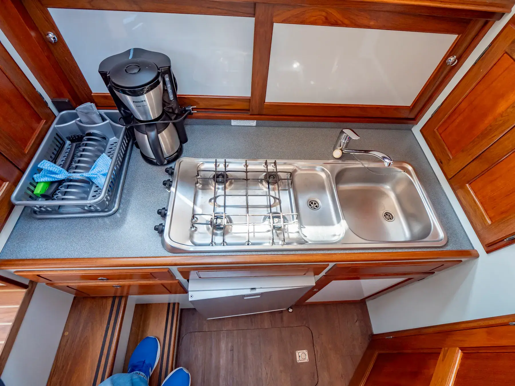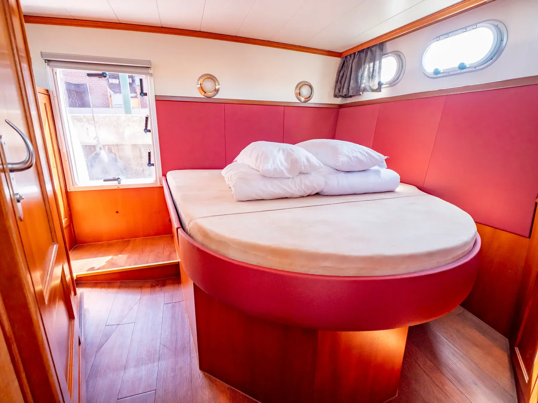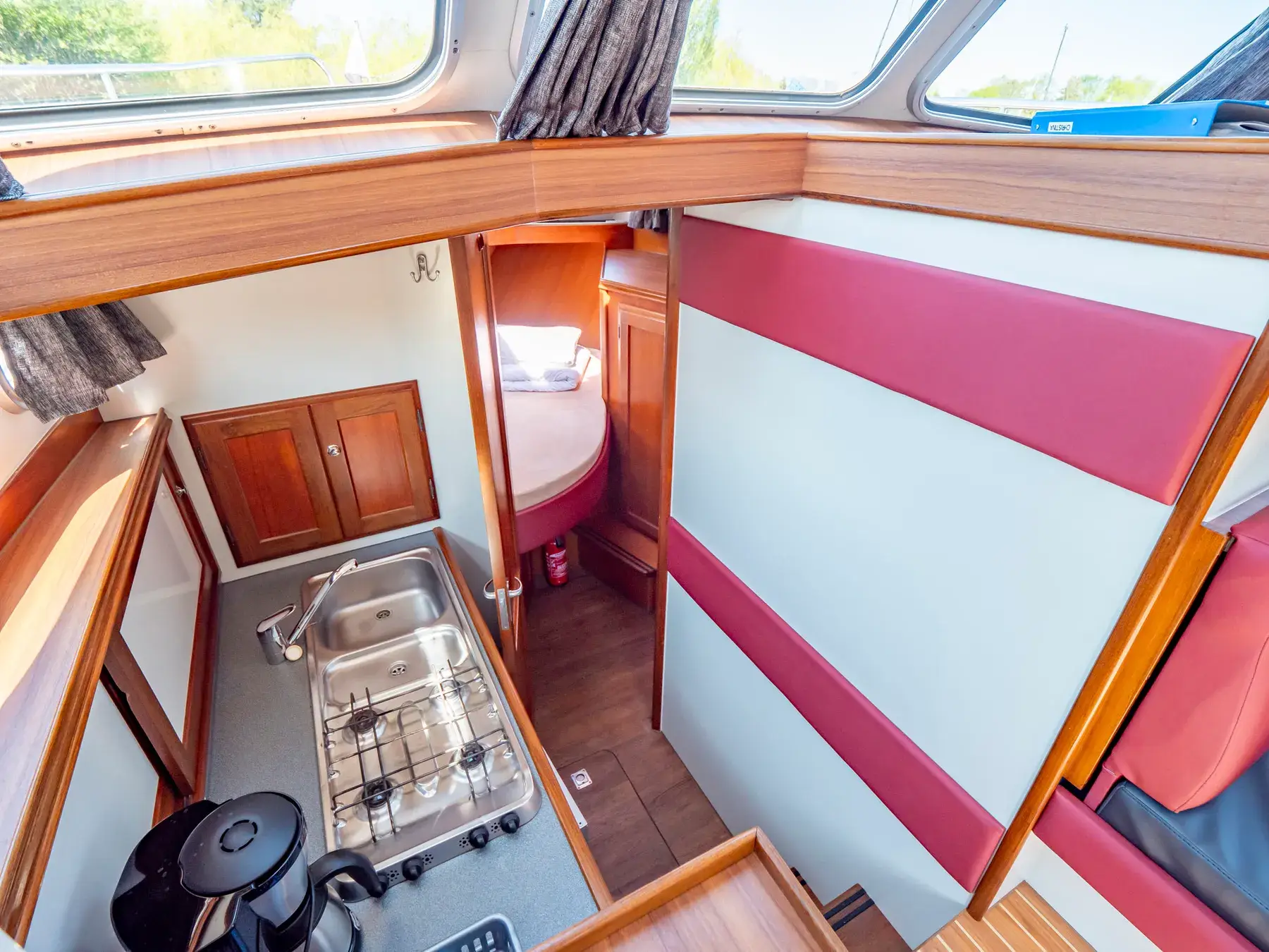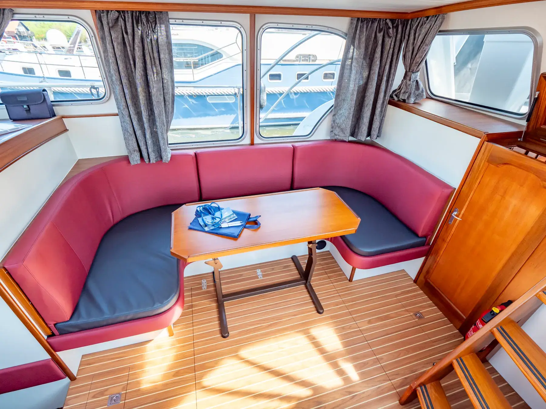 Dieses Boot bietet Platz für 4 Personen. Auch hier ist das Besondere das von beiden Seiten begehbare französische Bett und das große Fenster in der Achterkabine, Der Bootstyp bietet eine 2. Naßzelle mit Dusche und WC in der Vorderkoje.