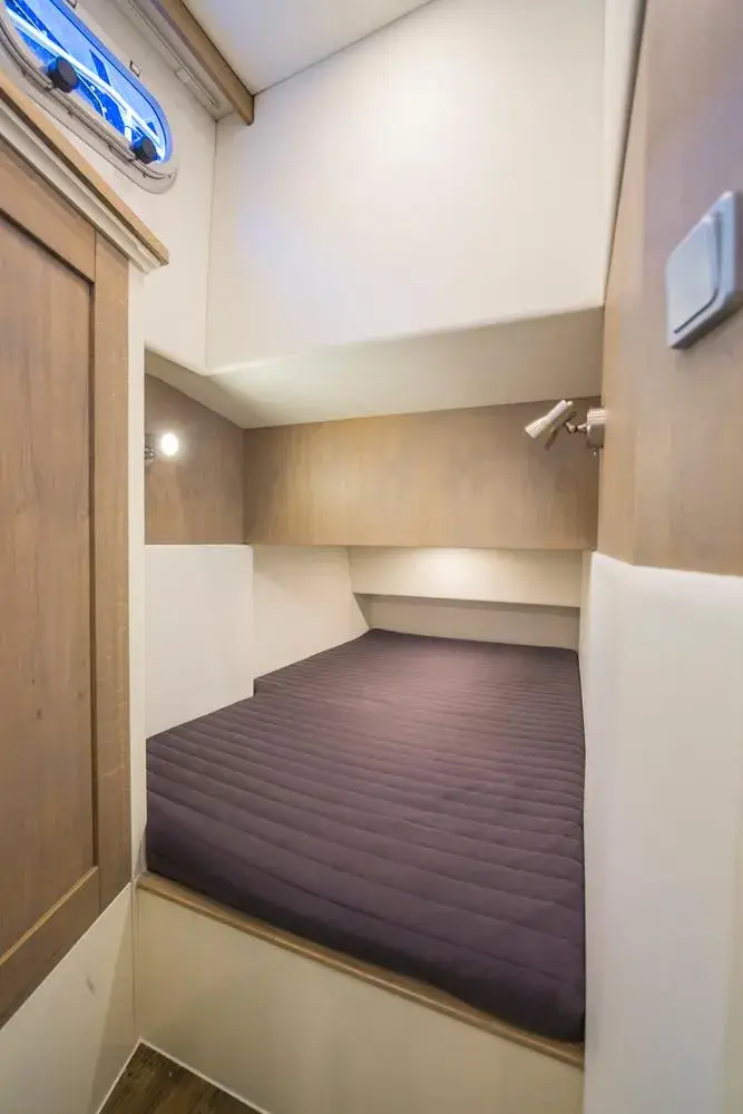 Das Boot beeindruckt mit seinem stilvollen Design, das von den Naval-Architekten von Vripack Yachting entworfen wurde. Der 76 cm tiefe Badesteg mit einer acht Zentimeter dicken Gummi-Scheuerleiste verleiht dem Schiff nicht nur eine robuste Erscheinung, sondern schützt es auch vor Schäden beim Anlegen. Wendeltreppen führen zu den Seitendecks, die ergonomische Breite von 43 cm bieten. Das Cockpit, das sich hinter dem Targa-Bügel erstreckt, erstreckt sich großzügig über 360 x 250 cm und bietet eine Stehhöhe von 200 cm, wenn das Fahrverdeck montiert ist.