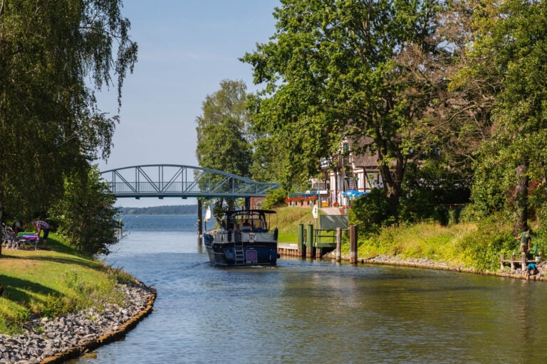 Weiter geht es über den Petersdorfer See bis zum Lenzer Krug. Der kleine Ort mit schönem Badestrand liegt direkt vor der Einfahrt in den Plauer See. Gleich an der Brücke lohnt ein Besuch des Restaurants mit herrlicher Sonnenterrasse. Hier wird typisch regional und mit viel Liebe gekocht. Plau grüßt als erstes mit seinem Leuchtturm vorne an der Mole. Direkt daneben liegt der Hafen der Müritzfischer. Ab hier fließt die Elde als beschauliches Flüsschen, flankiert von einer schönen Uferpromenade mit zahlreichen Restaurants und Anlegemöglichkeiten für Boote. Das Wahrzeichen ist die Plauer Hubbrücke von 1916, die heute noch 1,60 Meter in die Höhe fährt, um Sportboote passieren zu lassen. Sie öffnet in der Hauptsaison (Apr.-Sep.) zwischen 10 und 19 Uhr im 90-min Takt. Anleger und Uferpromenade gehen auch zwischen der Hubbrücke und Schleuse weiter. Von dort ist es nur ein Katzensprung ins Stadtzentrum. Sehenswürdigkeiten sind die Marienkirche mit begehbarem Turm sowie die Burganlage. Wer auf dem Kopfsteinpflaster vorbei an den herausgeputzten Fachwerkhäusern läuft, wird einige schöne Läden und Restaurants entdecken. Im Plauder Käseeck gibt es neben regionalen und internationalen Käsespezialitäten, Wein, Ausstellungen und Mitbringsel. Der Fackelgarten direkt an der Hubbrücke besticht durch seine regionale Küche mit hausgemachten Blutwurstravioli, Barsch von den Plauer Fischern oder Landkaninchen aus Beelitz.