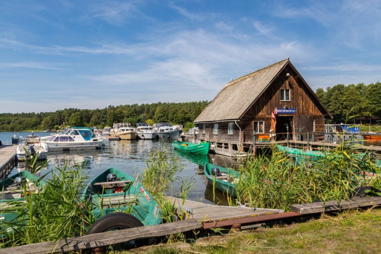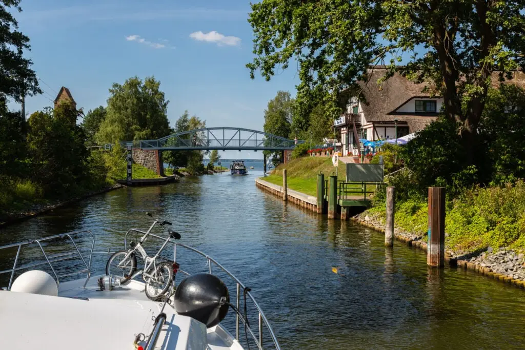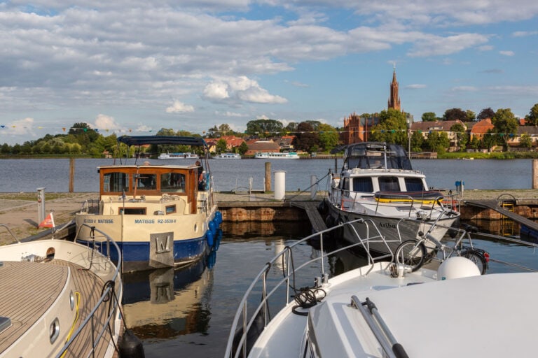 Der Eincheck ist ab 16 Uhr möglich und anschließend geht es auch gleich los über den Kölpinsee und dem Fleesensee bis nach Malchow. Malchows Altstadt liegt auf einer Insel, welche über eine Drehbrücke und einem Damm mit dem Festland verbunden ist. Die Brücke öffnet jeweils zur vollen Stunde. Während der Wartezeit dümpeln die Boote vor der Brücke oder machen am Anleger Klosterschenke für einen Stadtbummel fest. Zwar hat Malchow nur ein paar Geschäfte, dafür aber viele schöne Fachwerkhäuser, ein Orgelmuseum im Kloster und Restaurants am Wasser zu bieten.