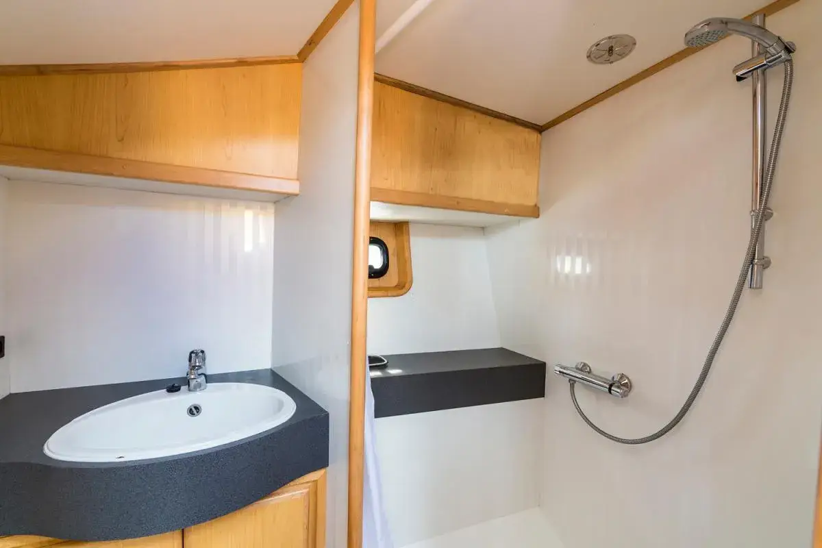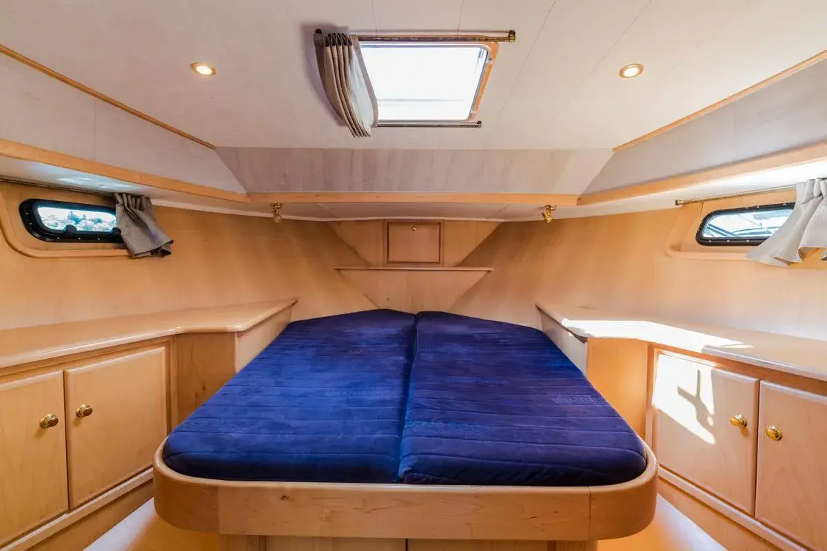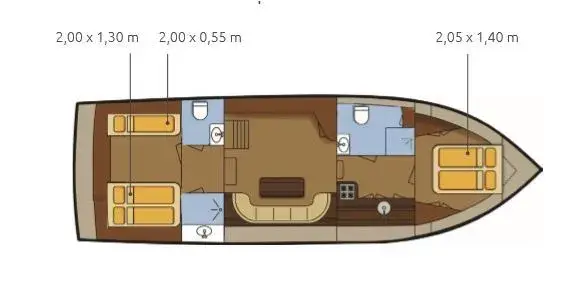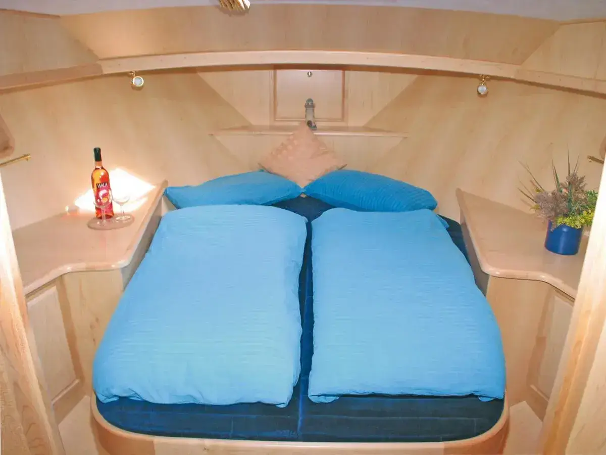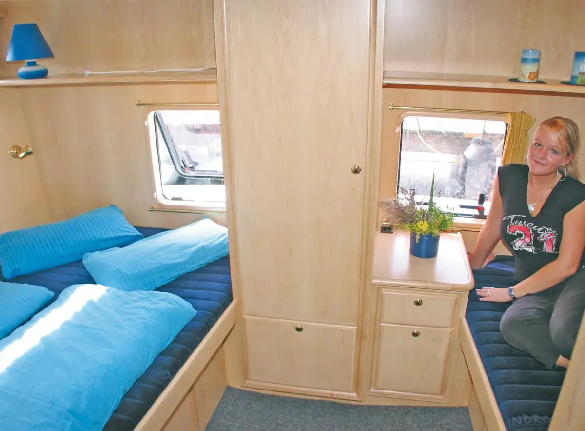 Dieses Schiff ist mit Sicherheit einmalig. Hier haben wir die geniale Innenarchitektur der Blue Saphir zugrundegelegt und im Heck ein Doppelbett und ein Einzelbett platziert. So wurde eine außergewöhnliche Bewegungsfreiheit in der Achterkajüte erreicht. Der Ahornholzausbau ist für Liebhaber heller Holzsorten ein wahrer Augenschmaus. Von Vacance Jachtbouw perfekt verarbeitet, können Sie zu Recht ein Schiff der Superlative erwarten. Weitere Extras wie Dunstabzugshaube über dem Herd und große elektrische, geräuscharme Toiletten und ein Warmluftgebläse runden das exklusive Gesamtbild ab.