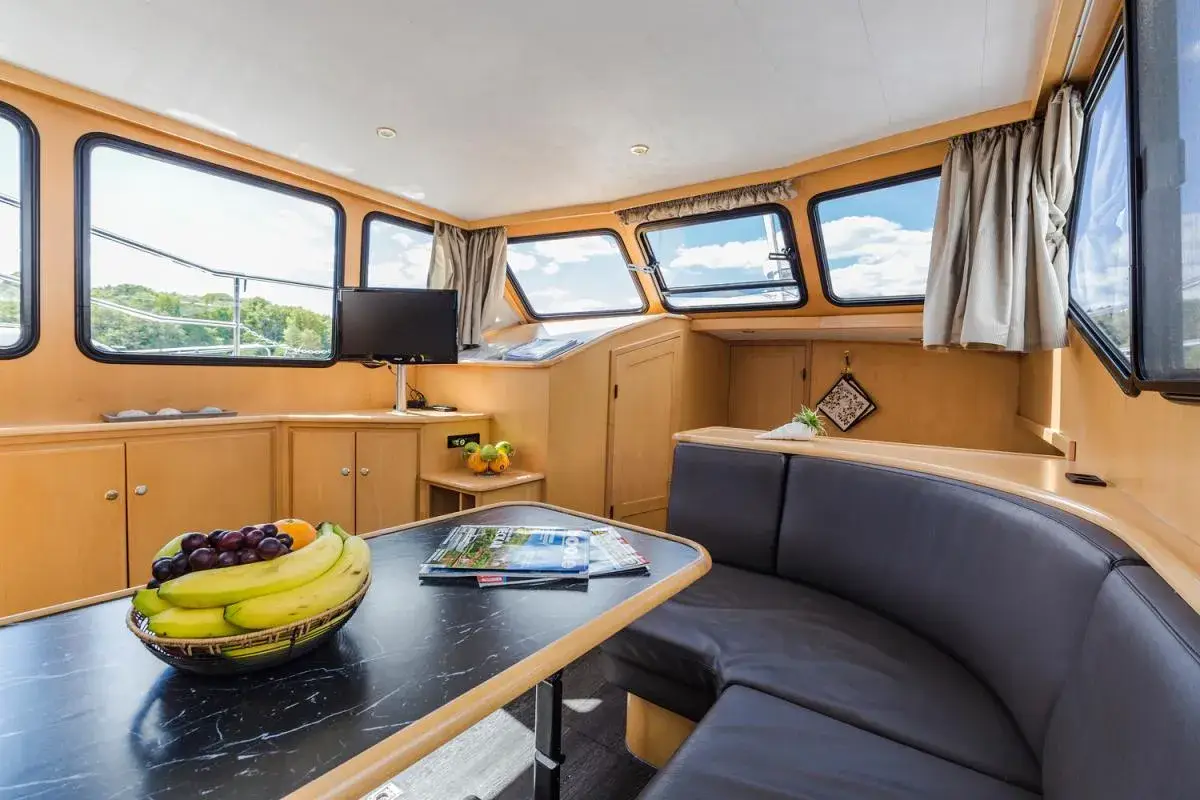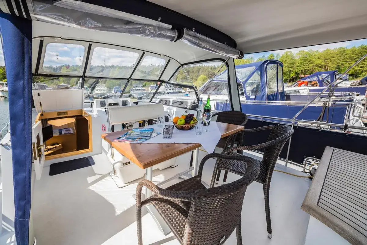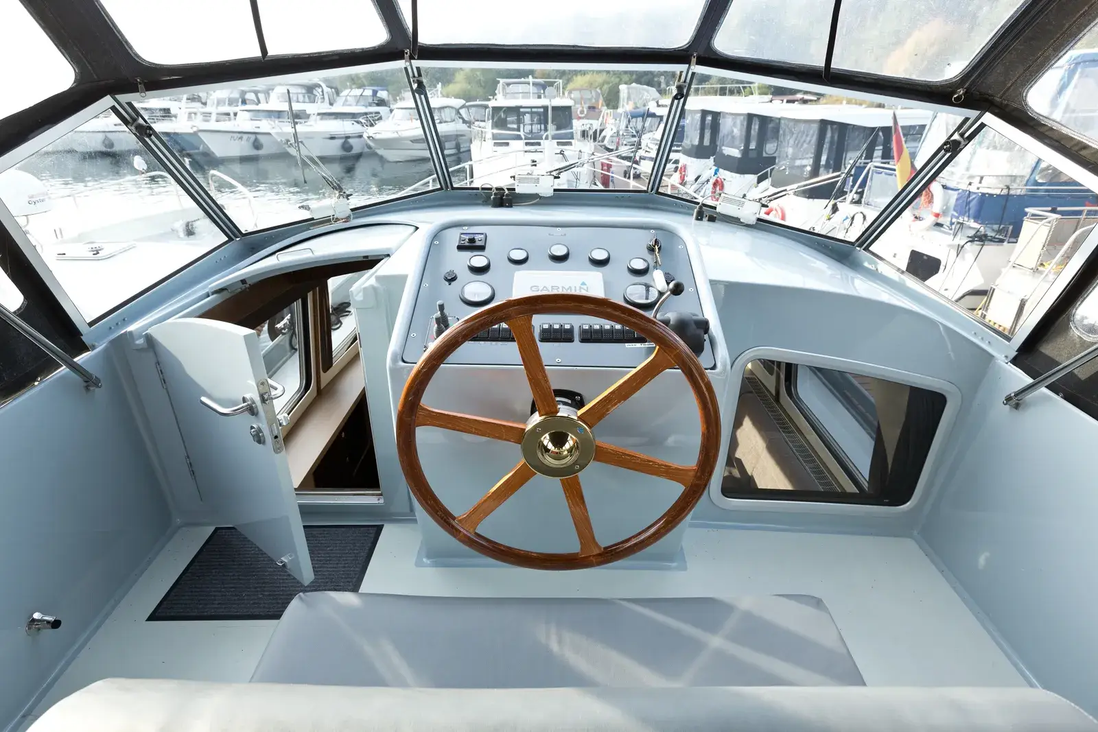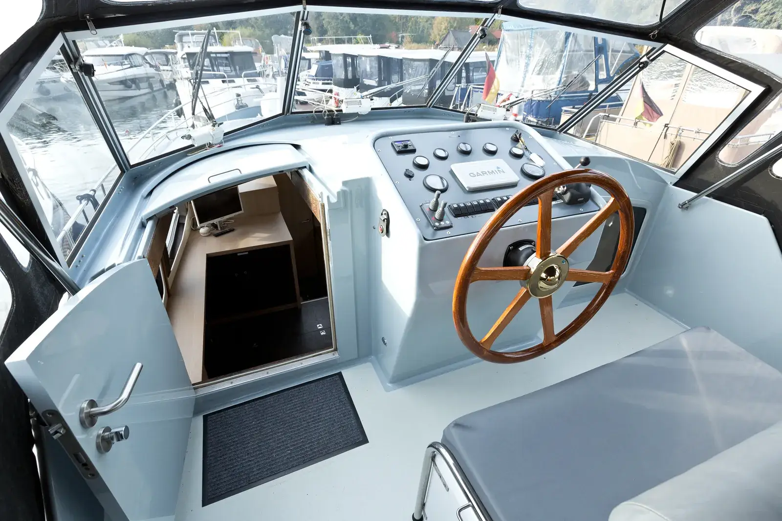 Vollständige Pantry mit mehrflammigem Kochfeld, 110 l Kühlschrank; 1 x Nasszelle mit Waschbecken, elektr. WC und Dusche, 1 x Nasszelle mit Waschbecken und elektr. WC, 1 separate Dusche; Fernseher, DVBT-Anschluss, CD-Radio, Ahornholzausbau, Heizung; sep. Radio am Steuerstand, Warmluftheizung, Echolot mit Log, komplett verschließbare Persenning; Bug- und Heckstrahlruder