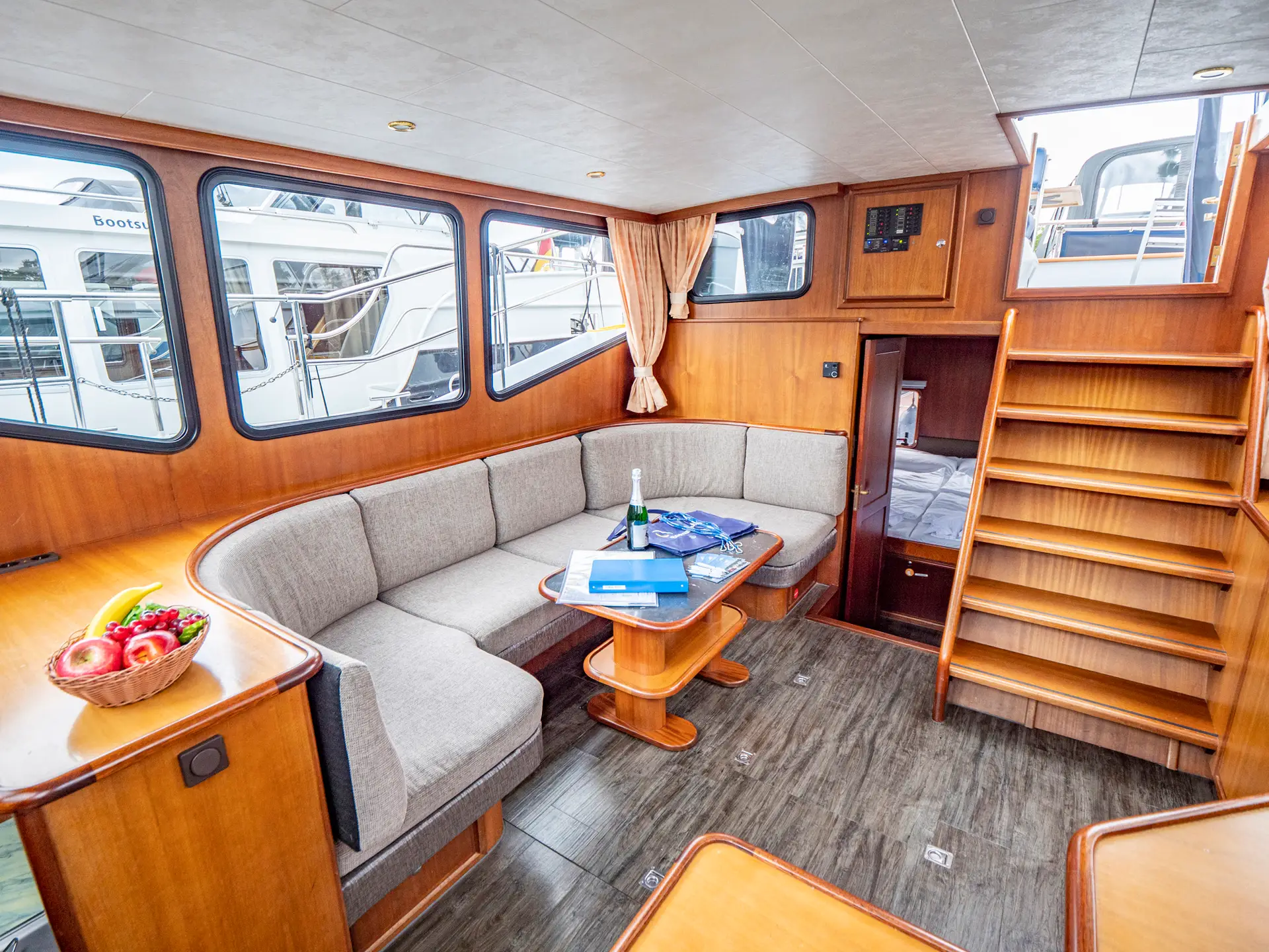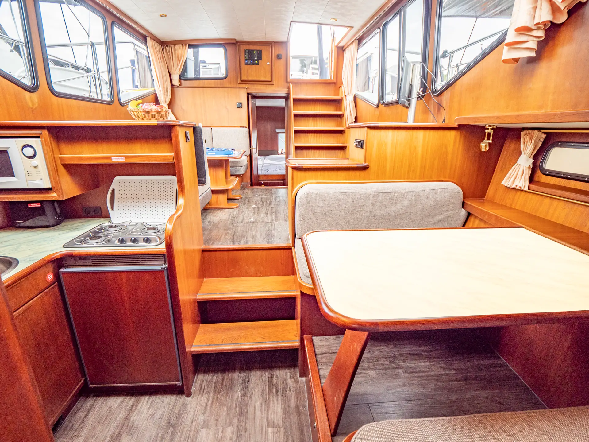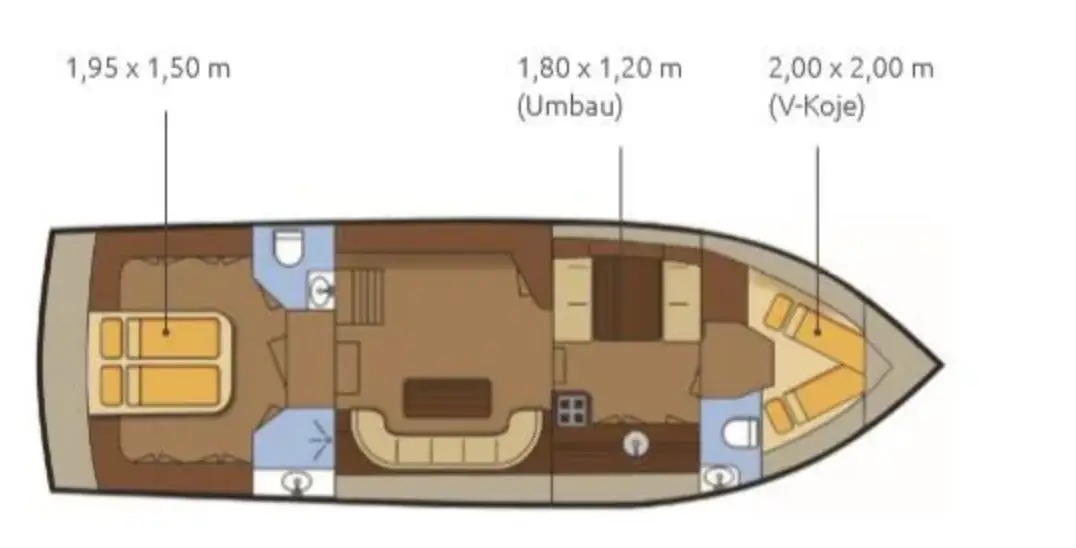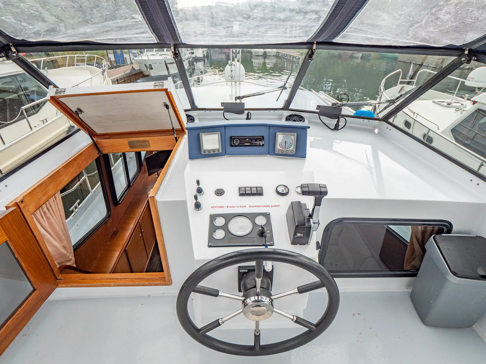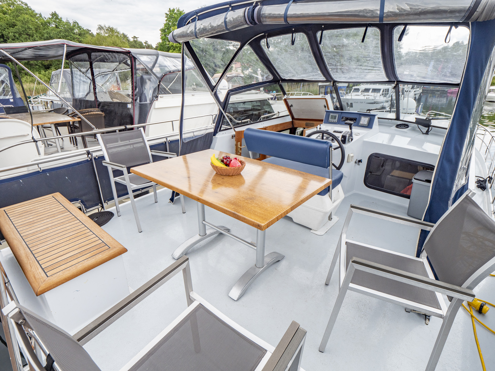 Vollständige Pantry mit mehrflammigem Kochfeld, 110 l Kühlschrank, 1 x Nasszelle mit Waschbecken und elektr. WC, 1 x Nasszelle mit Waschbecken und manu. WC, 1 separate Dusche, Fernseher, DVBT-Anschluss, CD-Radio, Heizung, sep. Radio am Steuerstand, Heckdusche, Echolot mit Log, Ruderstandsanzeige, komplett verschließbare Persenning, Bug- und Heckstrahlruder
