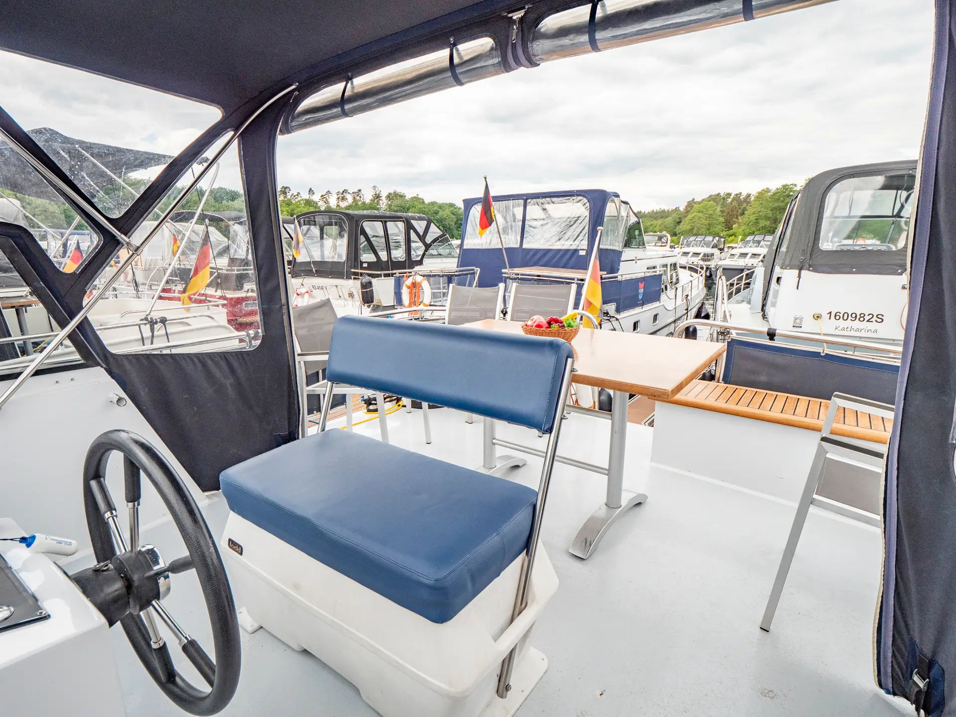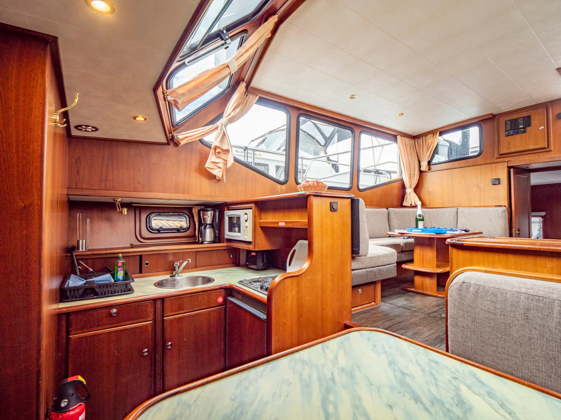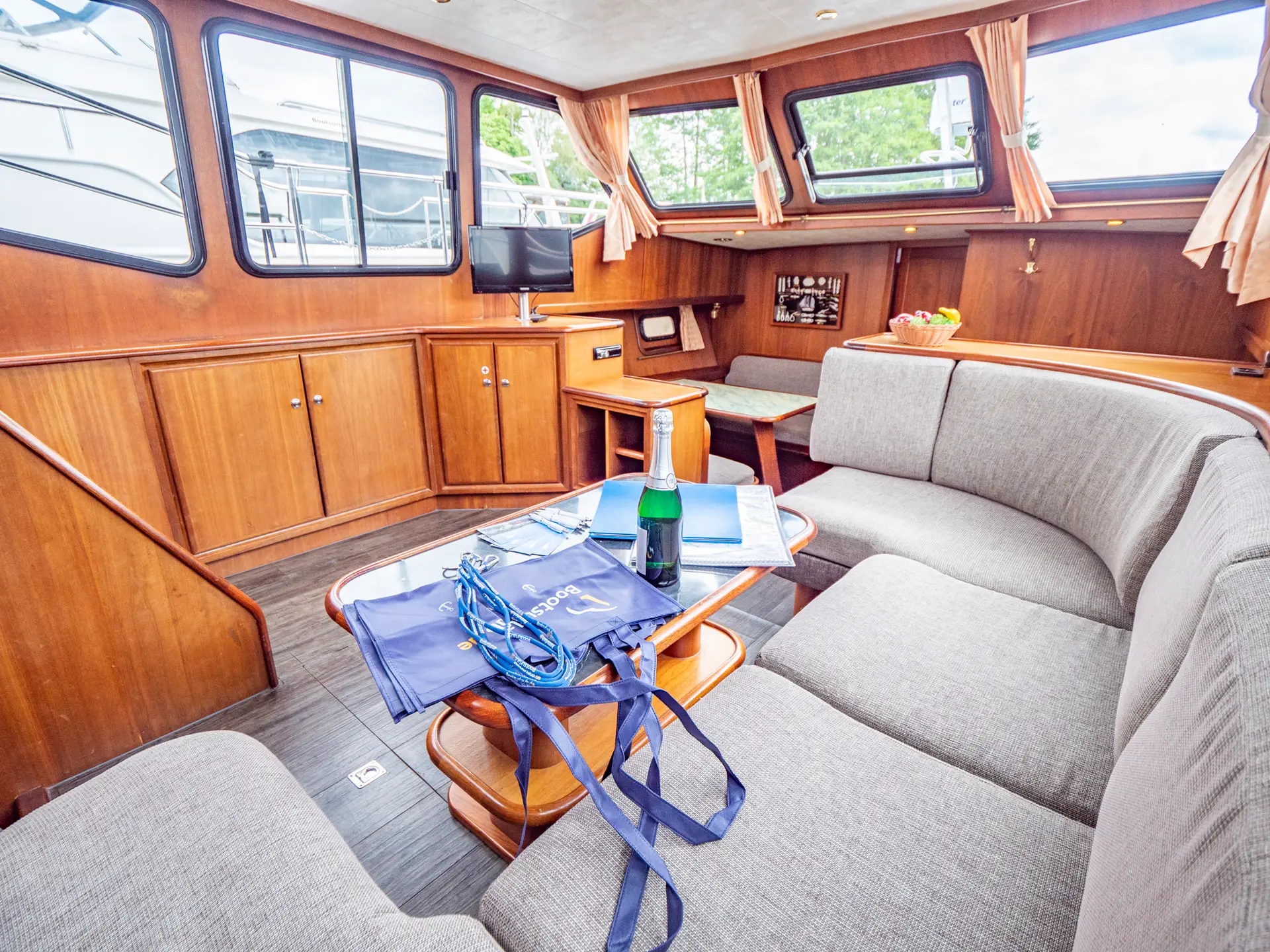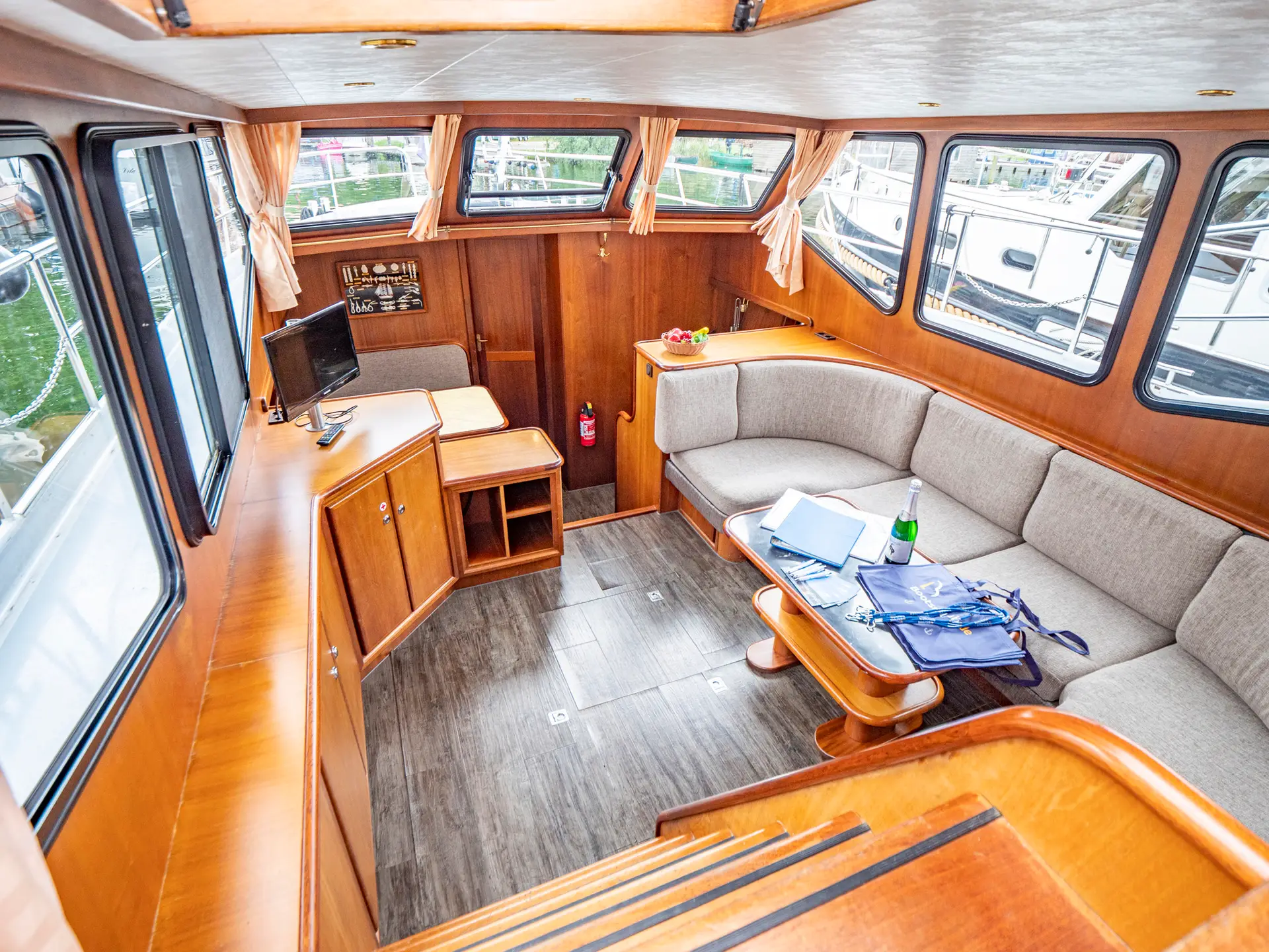 Vollständige Pantry mit mehrflammigem Kochfeld, 110 l Kühlschrank, 1 x Nasszelle mit Waschbecken und elektr. WC, 1 x Nasszelle mit Waschbecken und manu. WC, 1 separate Dusche, Fernseher, DVBT-Anschluss, CD-Radio, Heizung, sep. Radio am Steuerstand, Heckdusche, Echolot mit Log, Ruderstandsanzeige, komplett verschließbare Persenning, Bug- und Heckstrahlruder