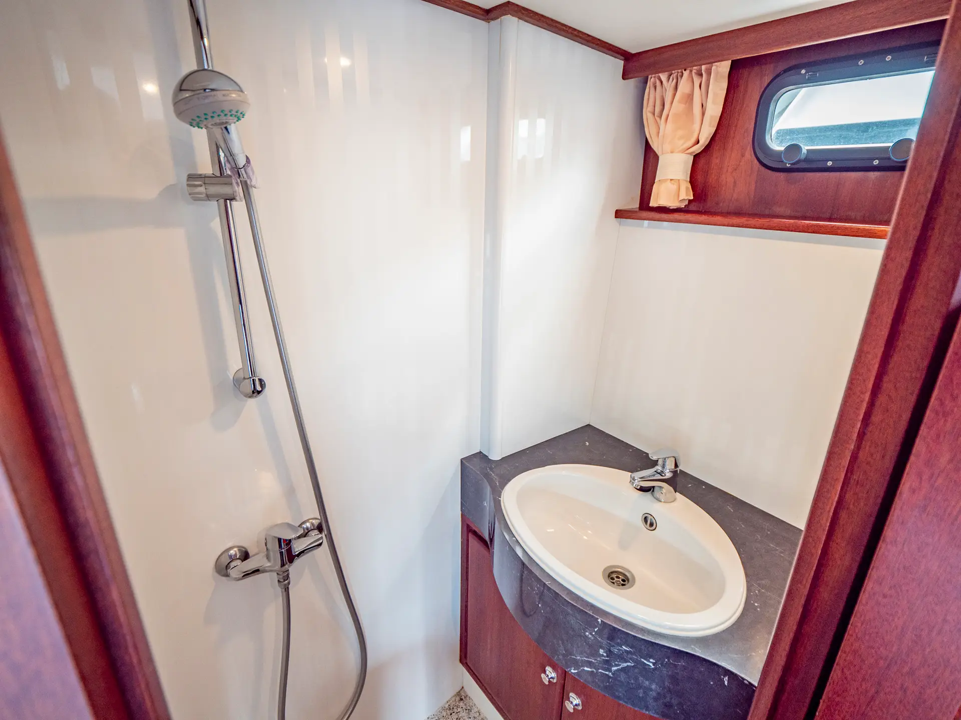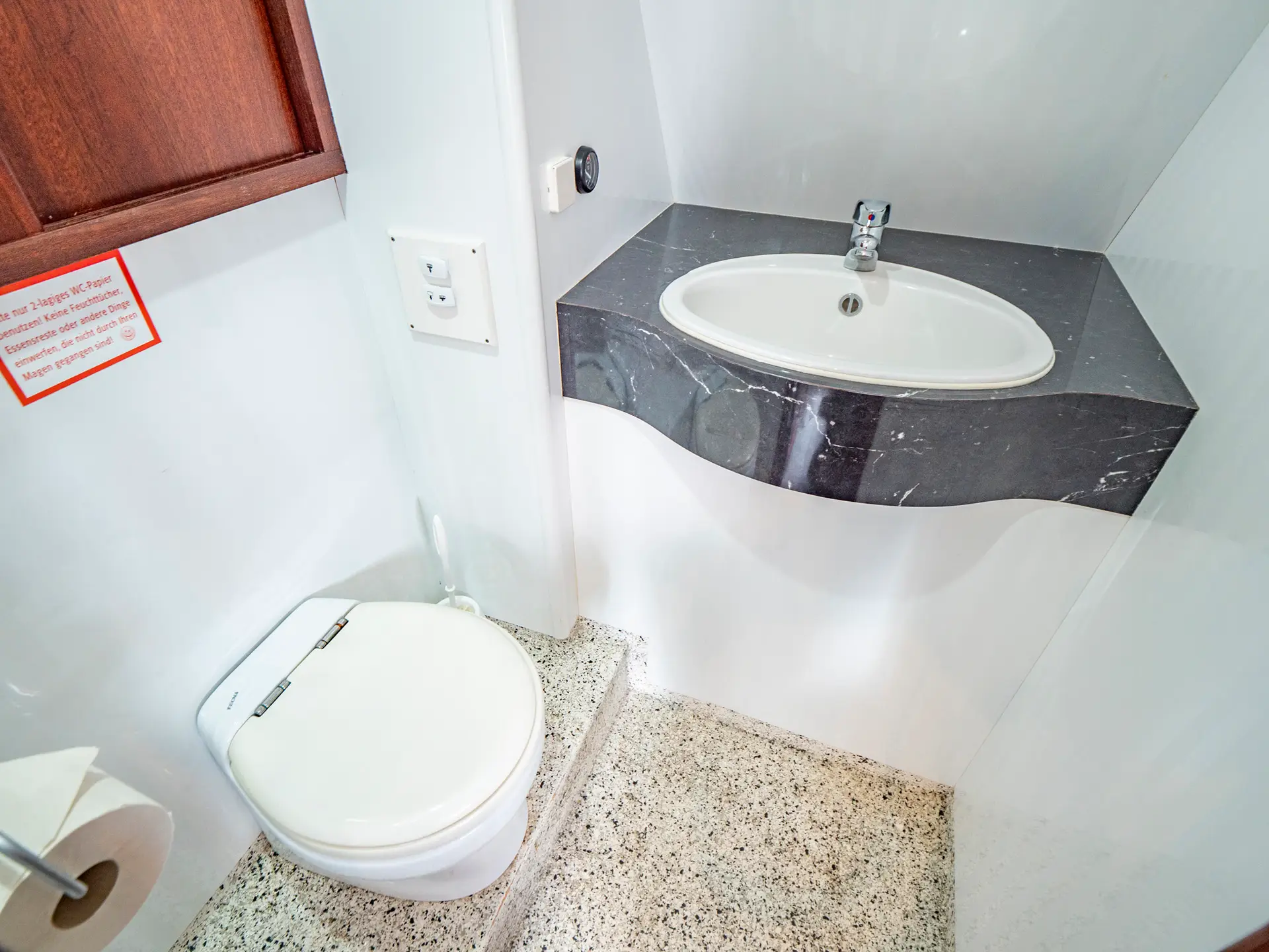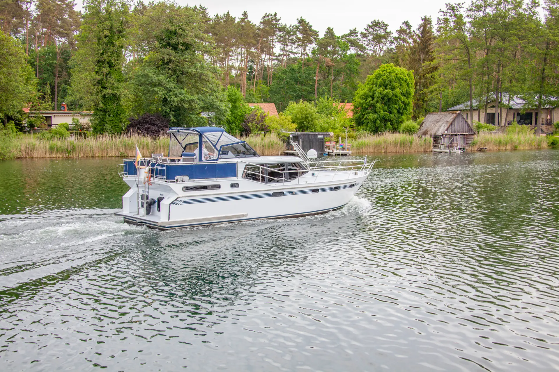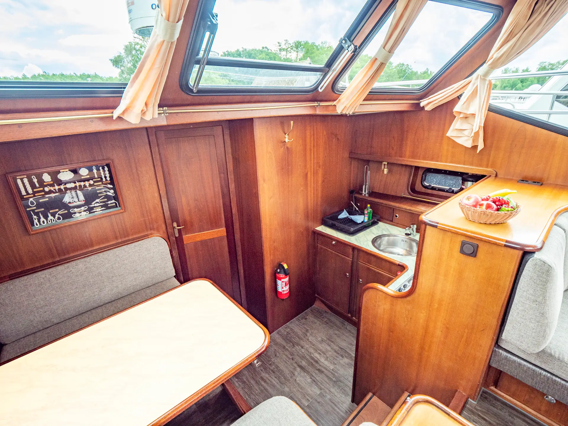 Vollständige Pantry mit mehrflammigem Kochfeld, 110 l Kühlschrank, 1 x Nasszelle mit Waschbecken und elektr. WC, 1 x Nasszelle mit Waschbecken und manu. WC, 1 separate Dusche, Fernseher, DVBT-Anschluss, CD-Radio, Heizung, sep. Radio am Steuerstand, Heckdusche, Echolot mit Log, Ruderstandsanzeige, komplett verschließbare Persenning, Bug- und Heckstrahlruder