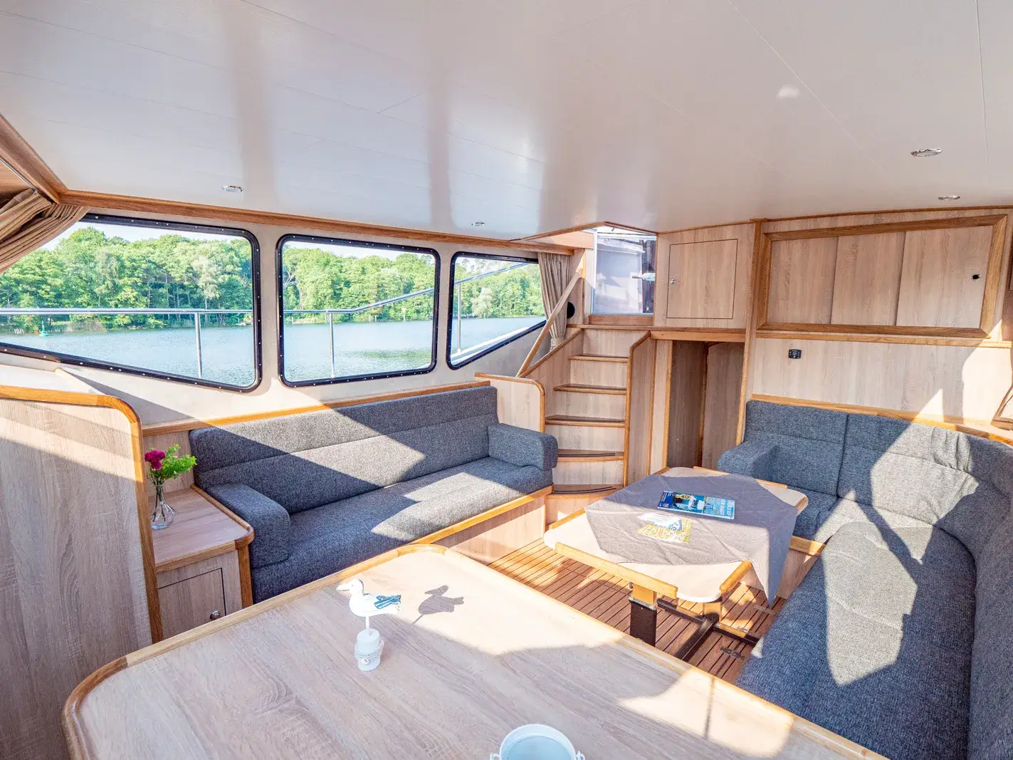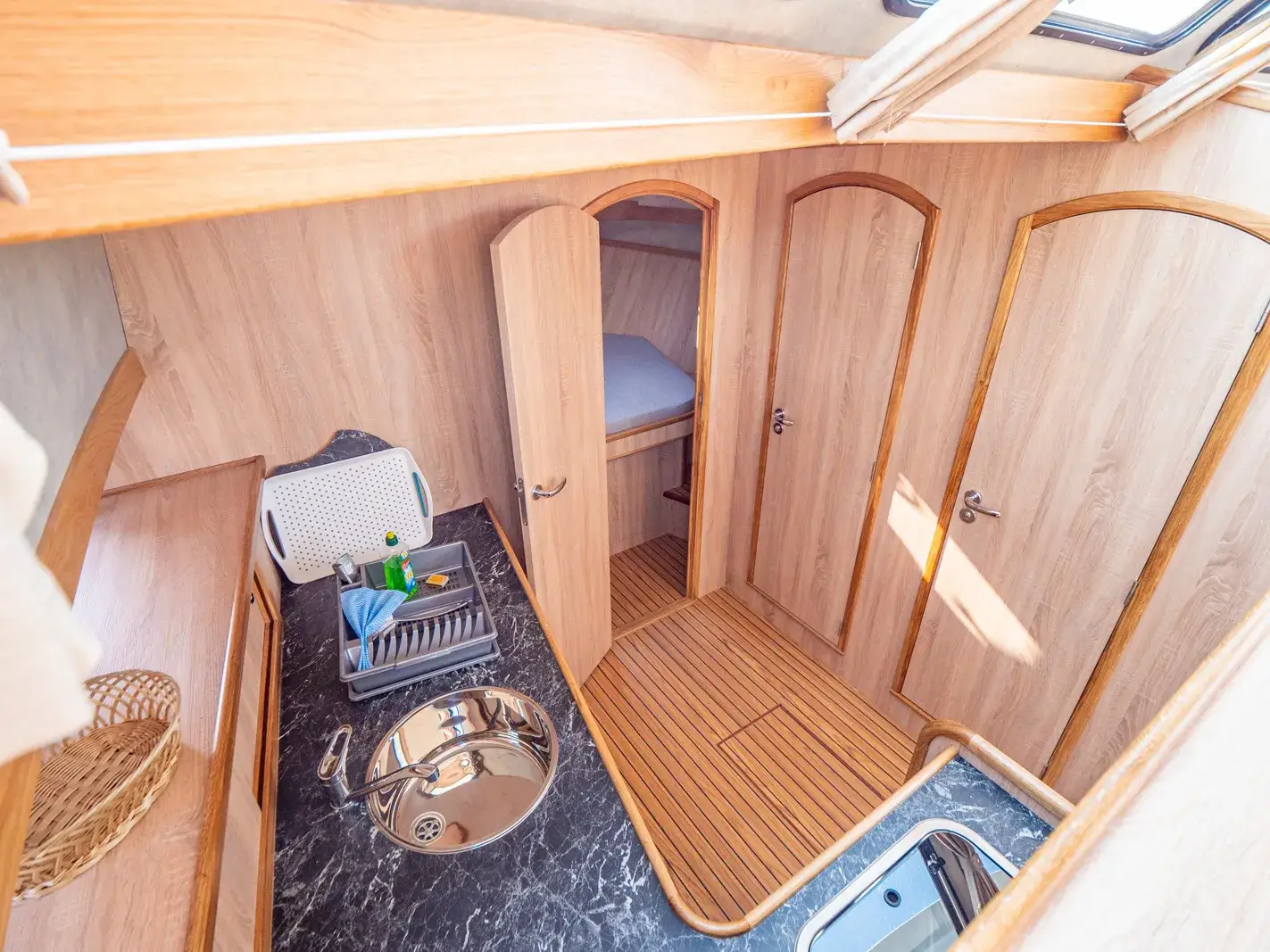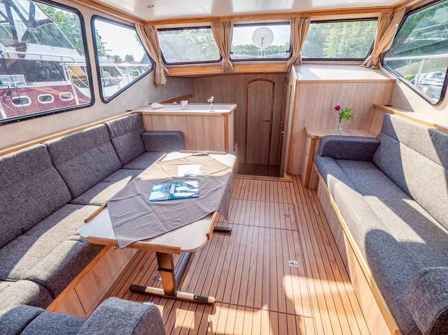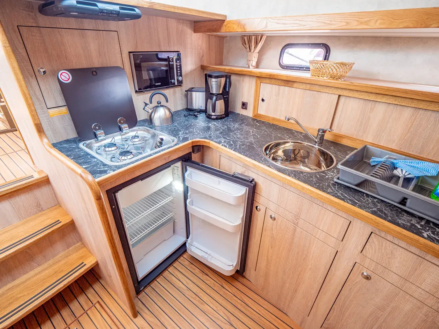 Die Yacht ist mit einer vollständigen Pantry ausgestattet, die ein mehrflammiges Kochfeld und einen 110-l-Kühlschrank umfasst. Es gibt eine Nasszelle mit Waschbecken, manuellem WC und Dusche sowie eine weitere Nasszelle mit Waschbecken und manuellem WC und eine separate Dusche. Zur Ausstattung gehören ein Fernseher, DVBT-Anschluss, CD-Radio, Heizung, separates Radio am Steuerstand, Echolot mit Log, eine komplett verschließbare Persenning sowie Bug- und Heckstrahlruder.