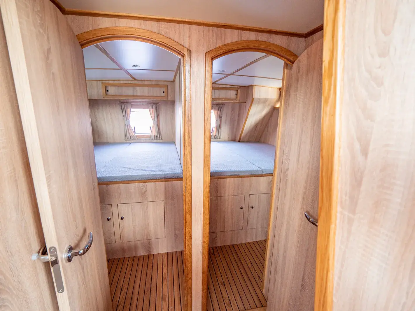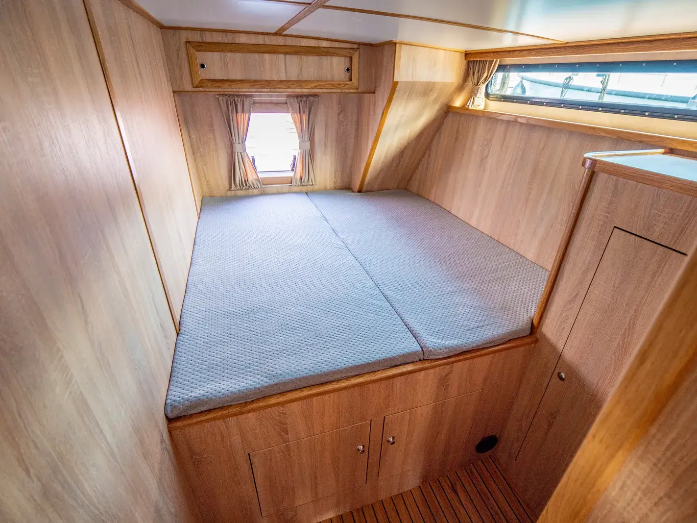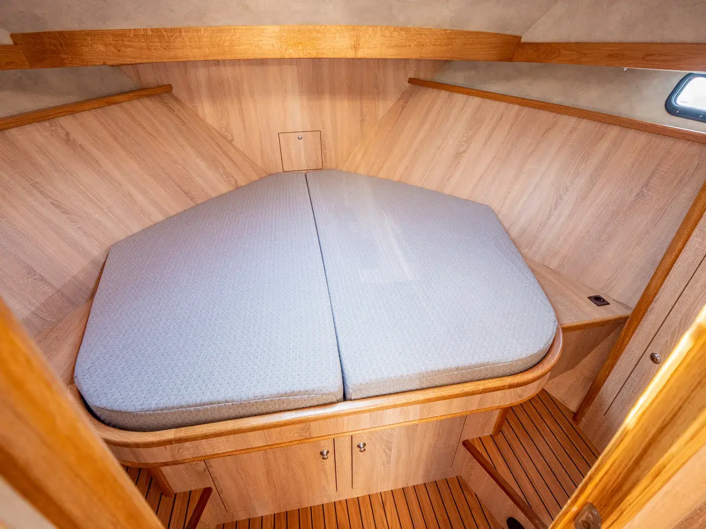 Diese Yacht bietet 6 feste Schlafplätze in 3 Kabinen und 2 umbaubare Schlafplätze in der Dinette. Im hinteren Bereich befinden sich sowohl ein Etagenbett als auch ein Doppelbett.