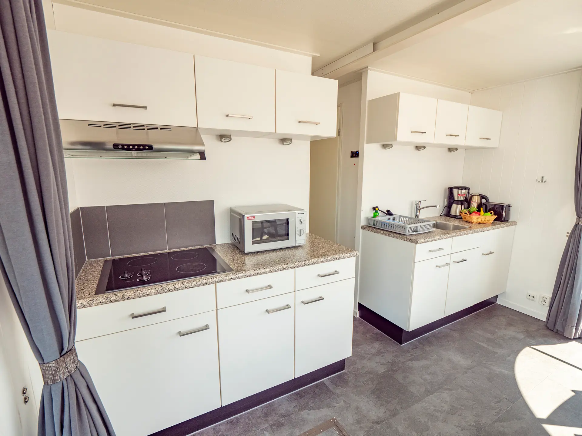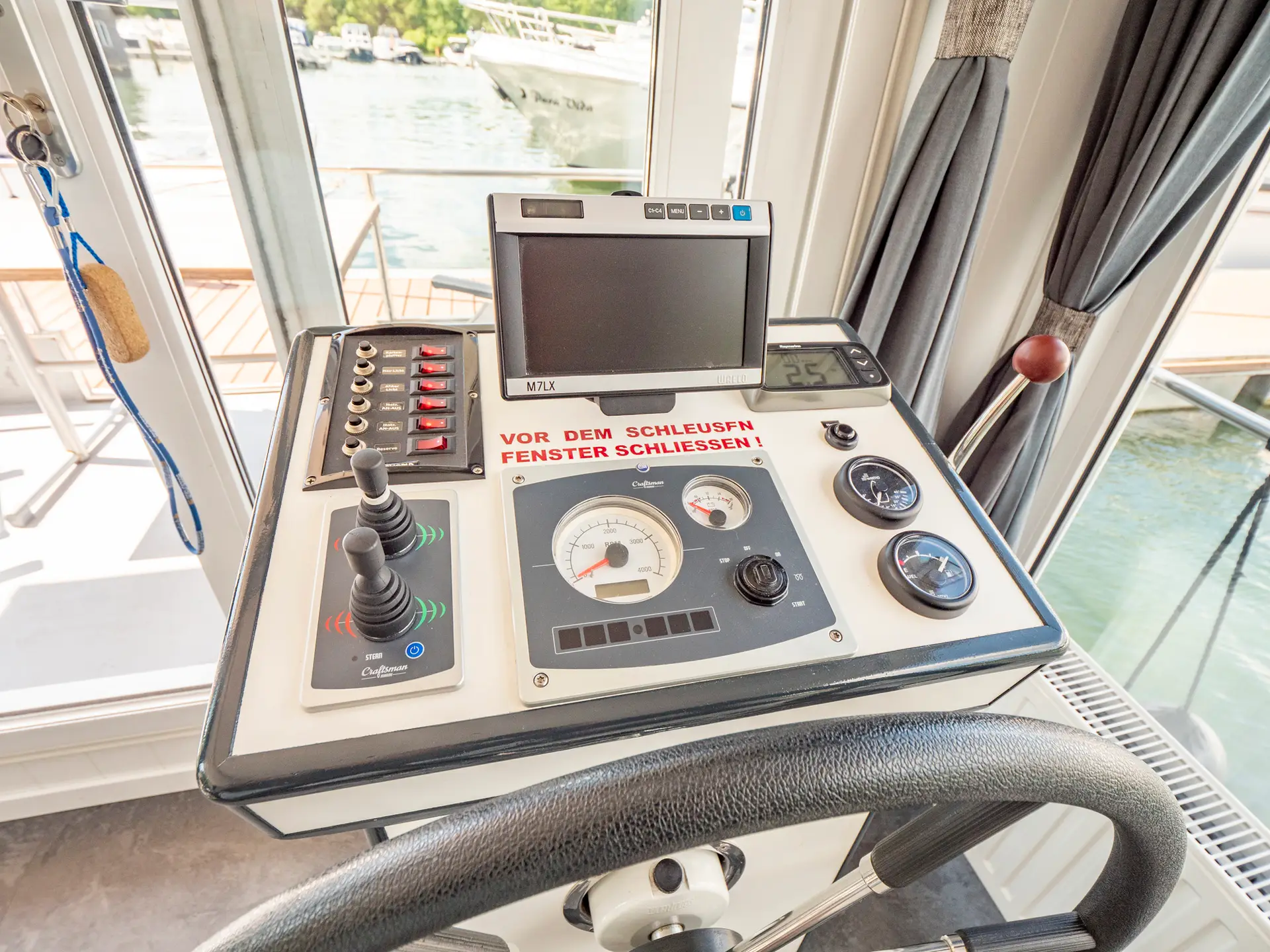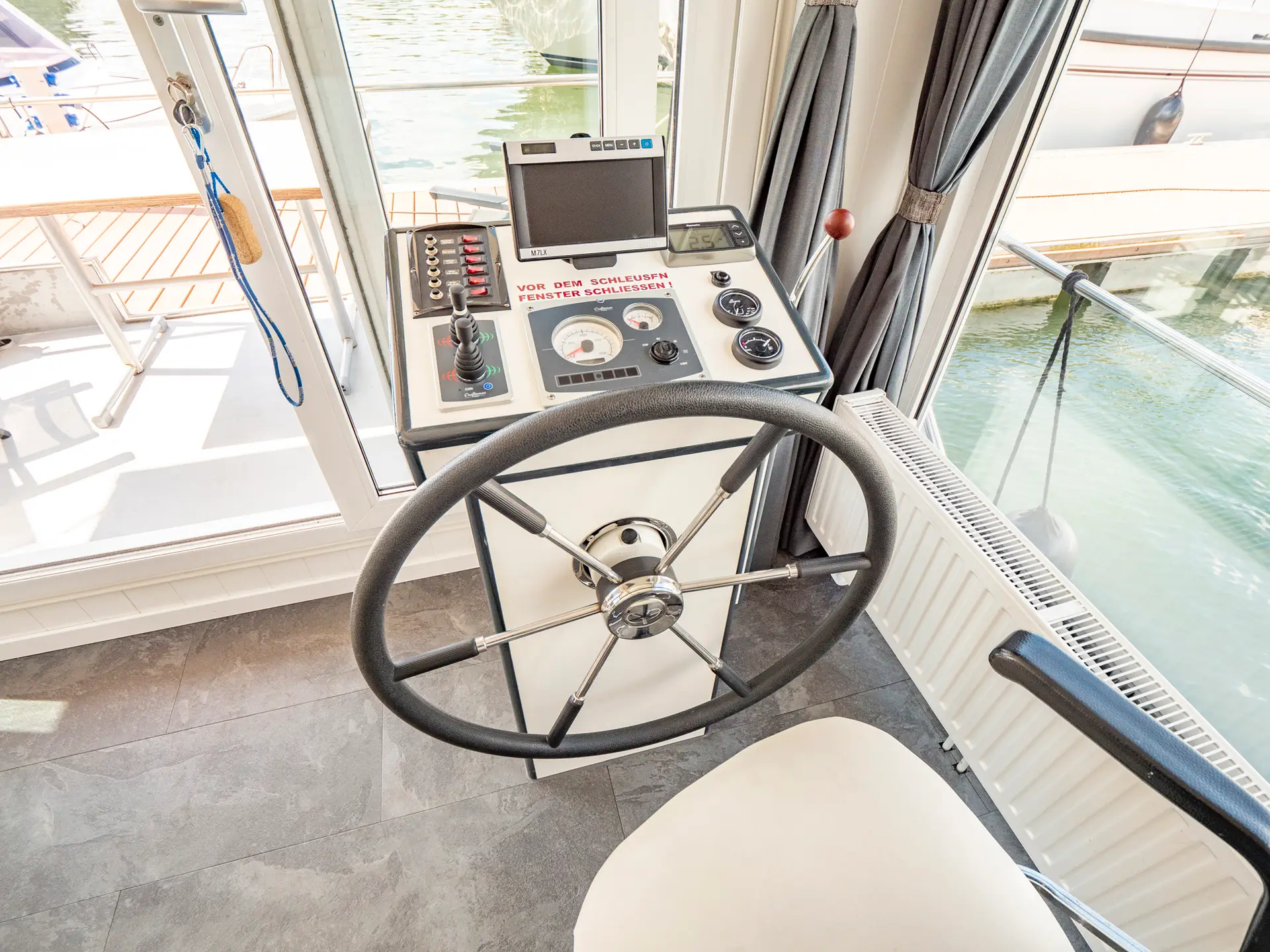 vollständige Pantry mit mehrflammigem Kochfeld, 80 l Kühlschrank, Grill/Mikrowellen-Kombigerät; 1 x Nasszelle mit Waschbecken und WC, 1 separate Dusche, Fernseher, SAT Anlage, CD-Radio; Außenlautsprecher, Echolot, Bug- und Heckstrahlruder