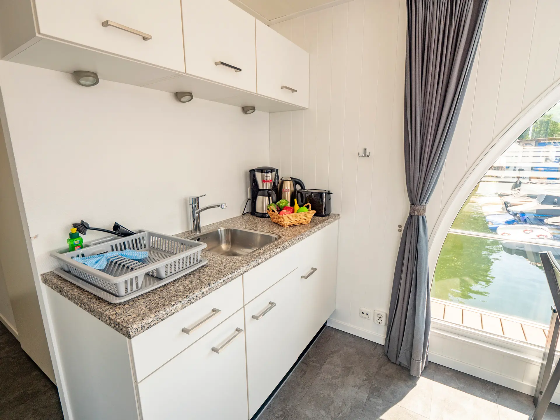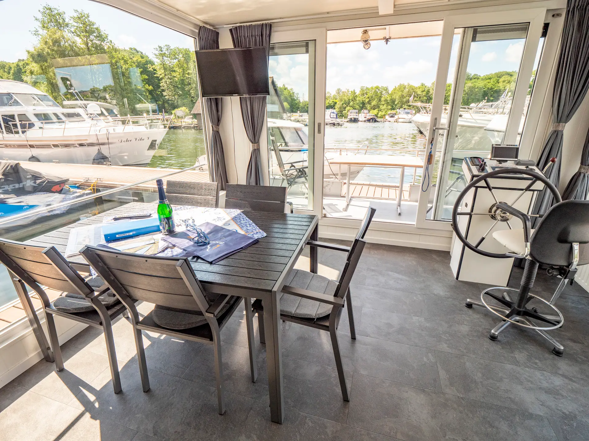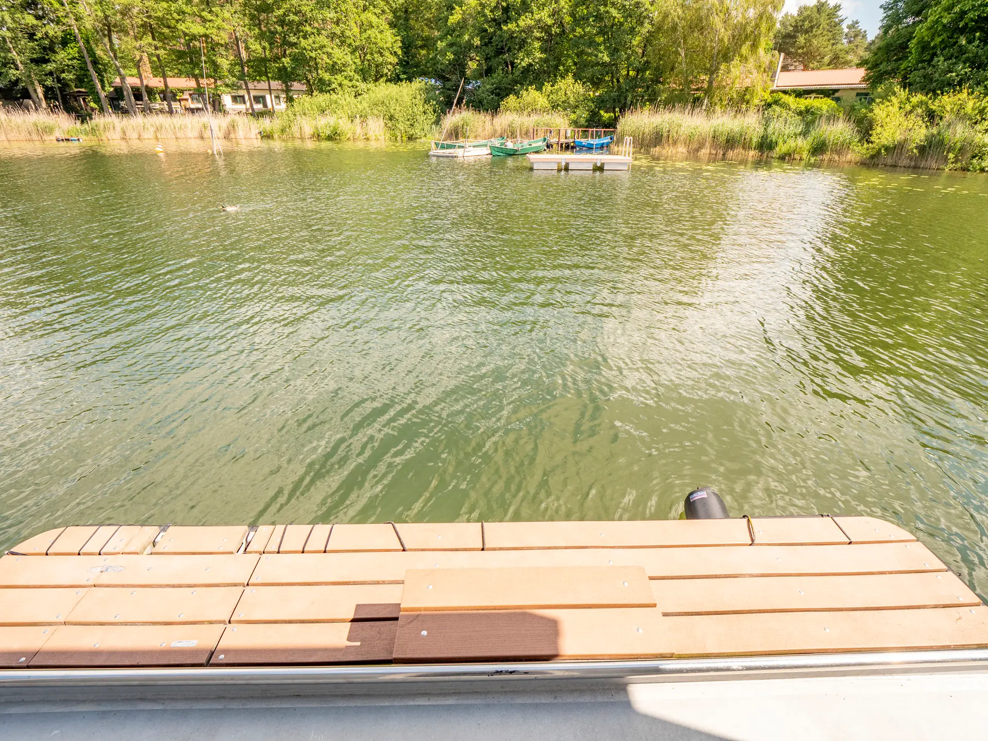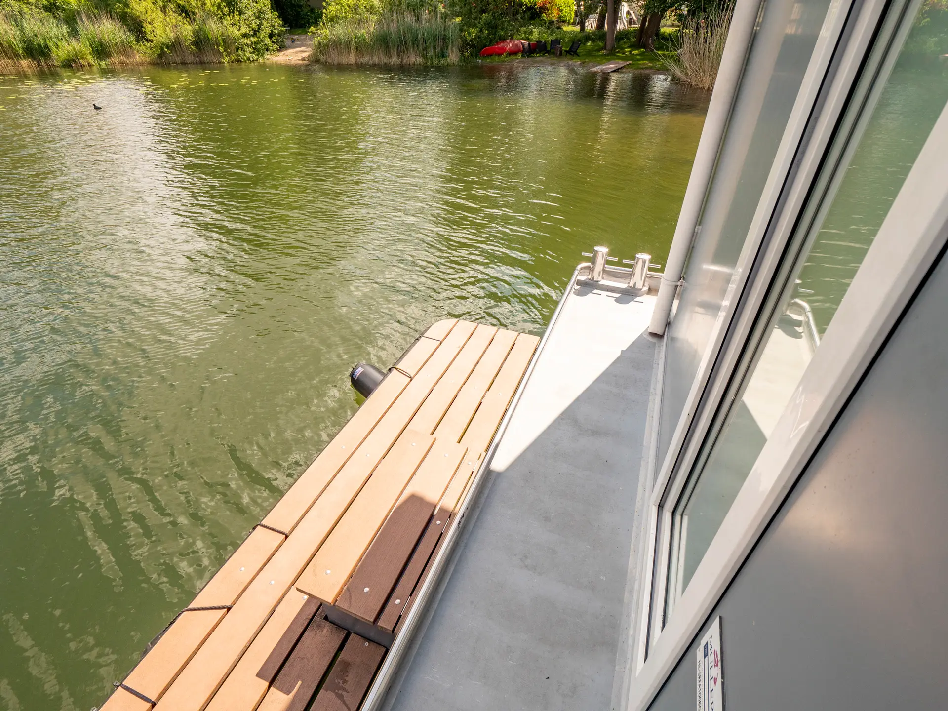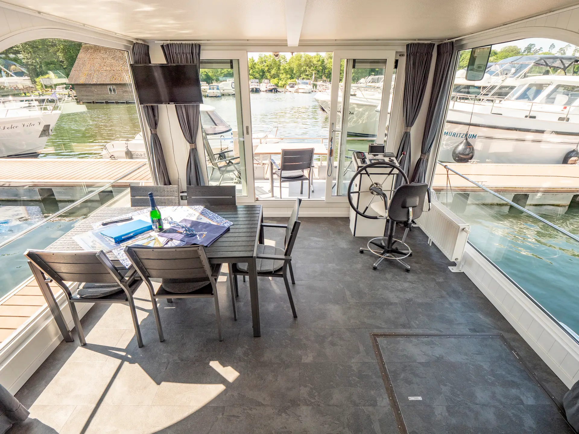 Wir präsentieren Ihnen auf der Mecklenburgischen Seenplatte das schwimmende Ferienhaus „Die YachtSUITE“. Genießen Sie die vorbeifahrenden Schiffe von der bequemen Seeterrasse aus erster Reihe oder steuern Sie selbst Ihr Wohnschiff. Näher kann man dem Wasser nicht sein. Sie haben die Möglichkeit, das Haus fest im Hafen liegend zu mieten oder aber als Boot (führerscheinfrei). Das Besondere gegenüber herkömmlichen Hausbooten mit den Kunststoffschwimmern ist der robuste Rumpf in Form eines Stahlverdrängers. Dadurch können sehr stabile Fahreigenschaften erreicht werden. Der Außensteuerstand befindet sich auf der Terrasse. Dank Bug- und Heckstrahlruder lässt sich das Schiff bzw. Hausboot auch bequem auf engstem Raum manövrieren. Vielleicht liegt das Hausboot stabiler als Bunbow & Co. Von der Badeplattform gelangen Sie über eine Leiter bequem ins Wasser. Aber auch Angler haben hier bequem Platz. (Angelkarten gibt´s übrigens vor Ort)